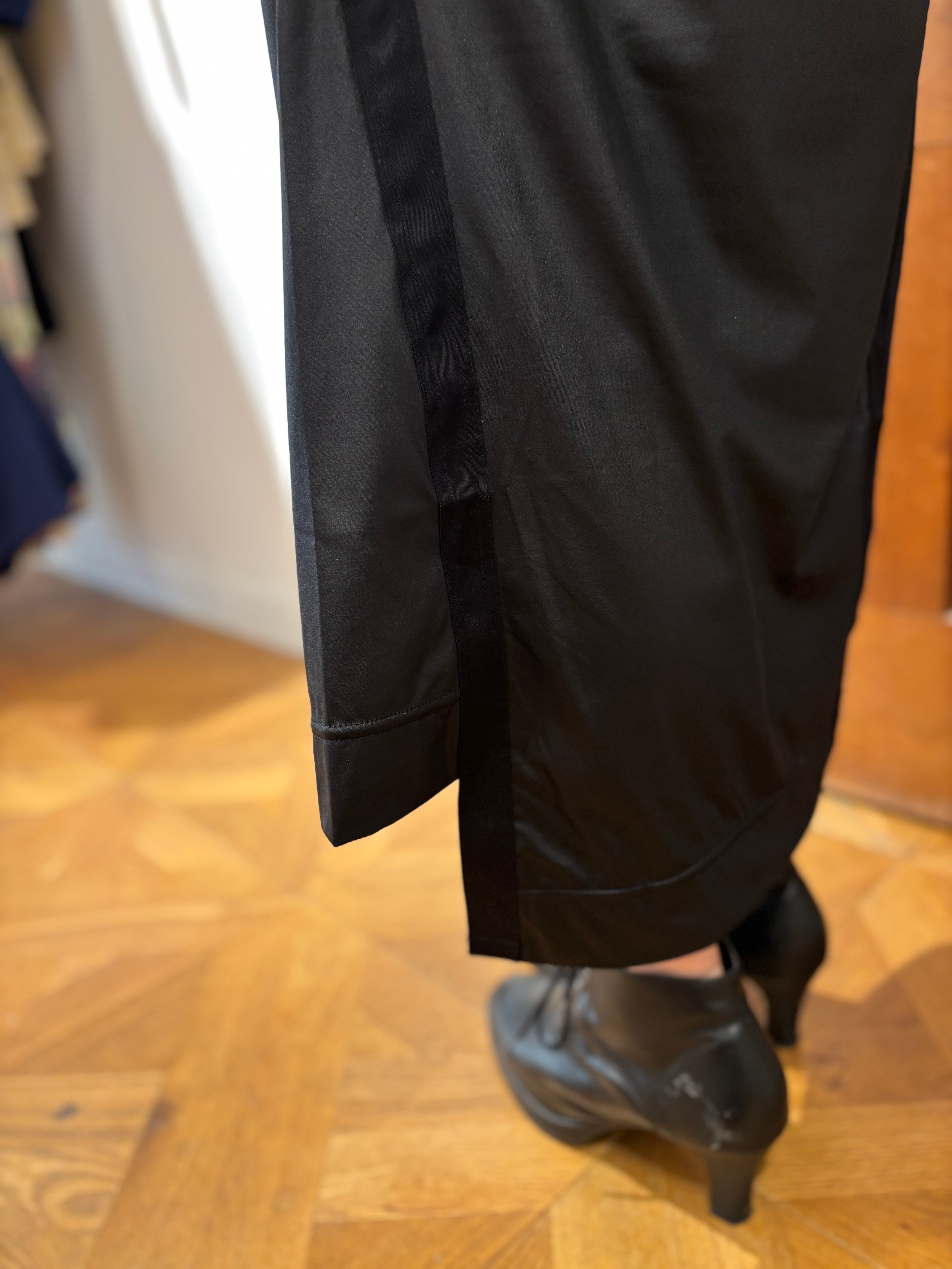 ウエスト部分にはゴムを施し、心地よいフィット感。縫い付けられた1本の長いベルトがウエストを美しく引き締め、スタイルアップを後押しします。