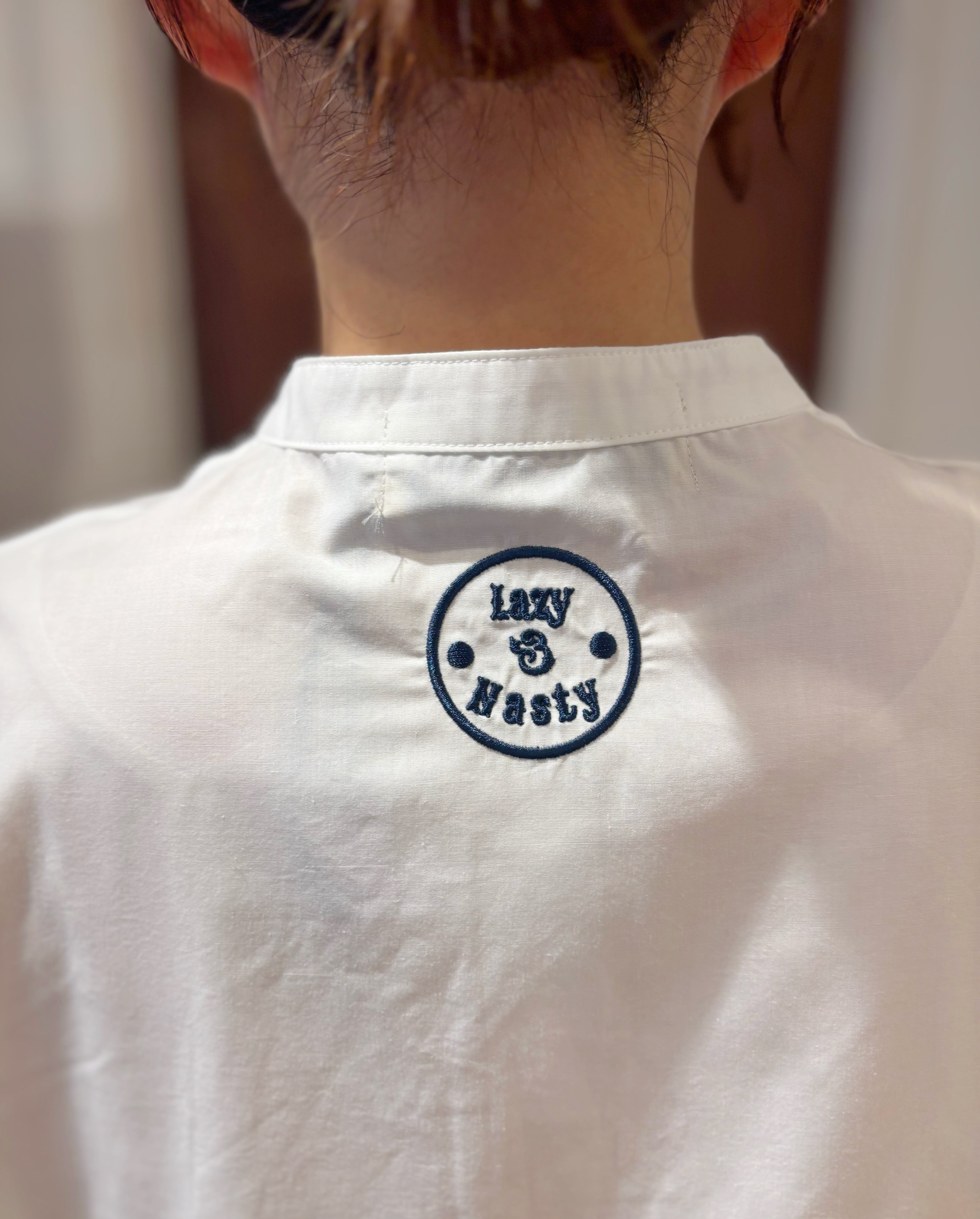 背中に施された “LAZY AND NASTY” の刺繍とラッフルカフスが、Magpieらしい遊び心をプラス。シンプルなのに1枚で印象が完成するデザインです。