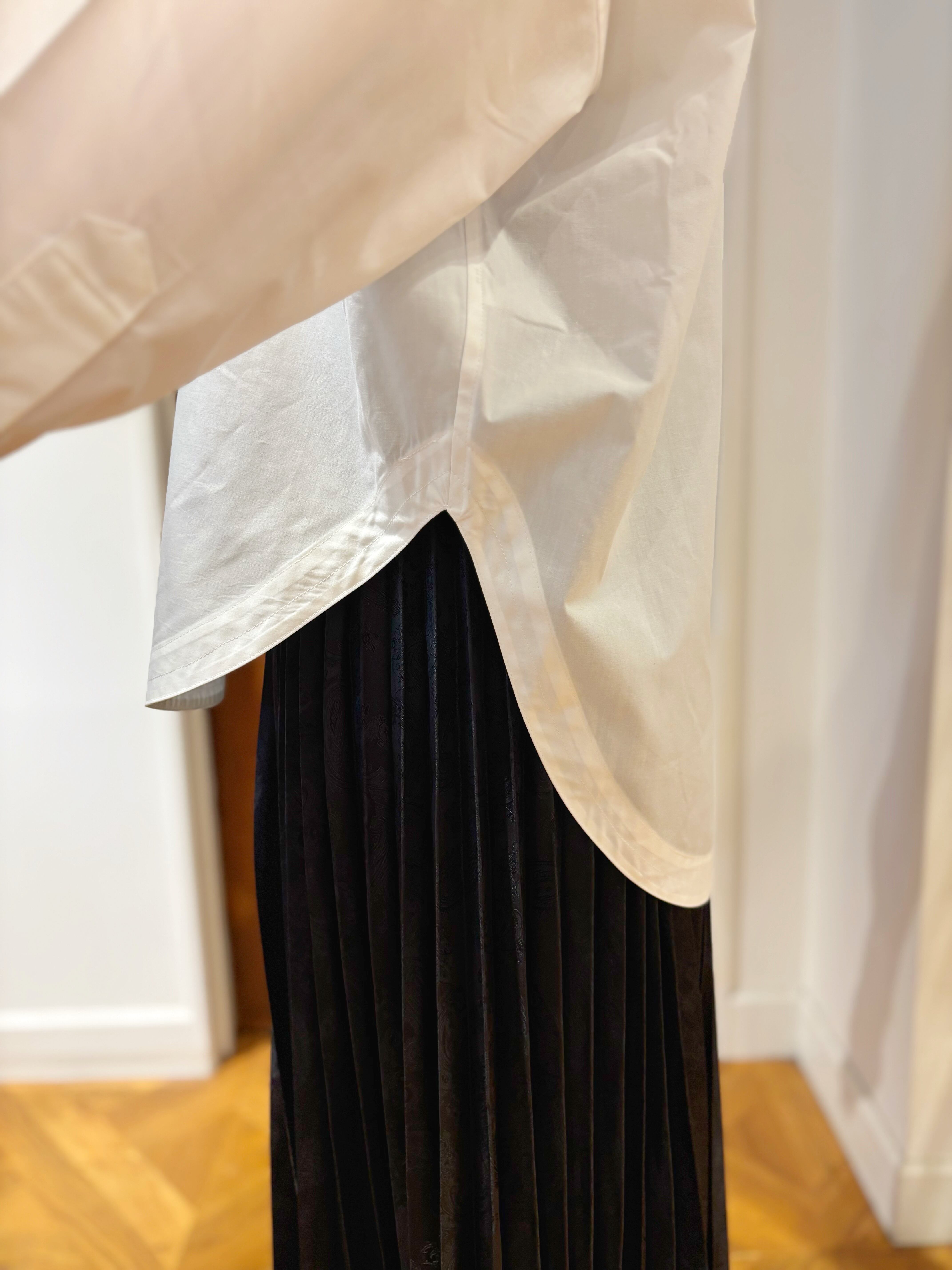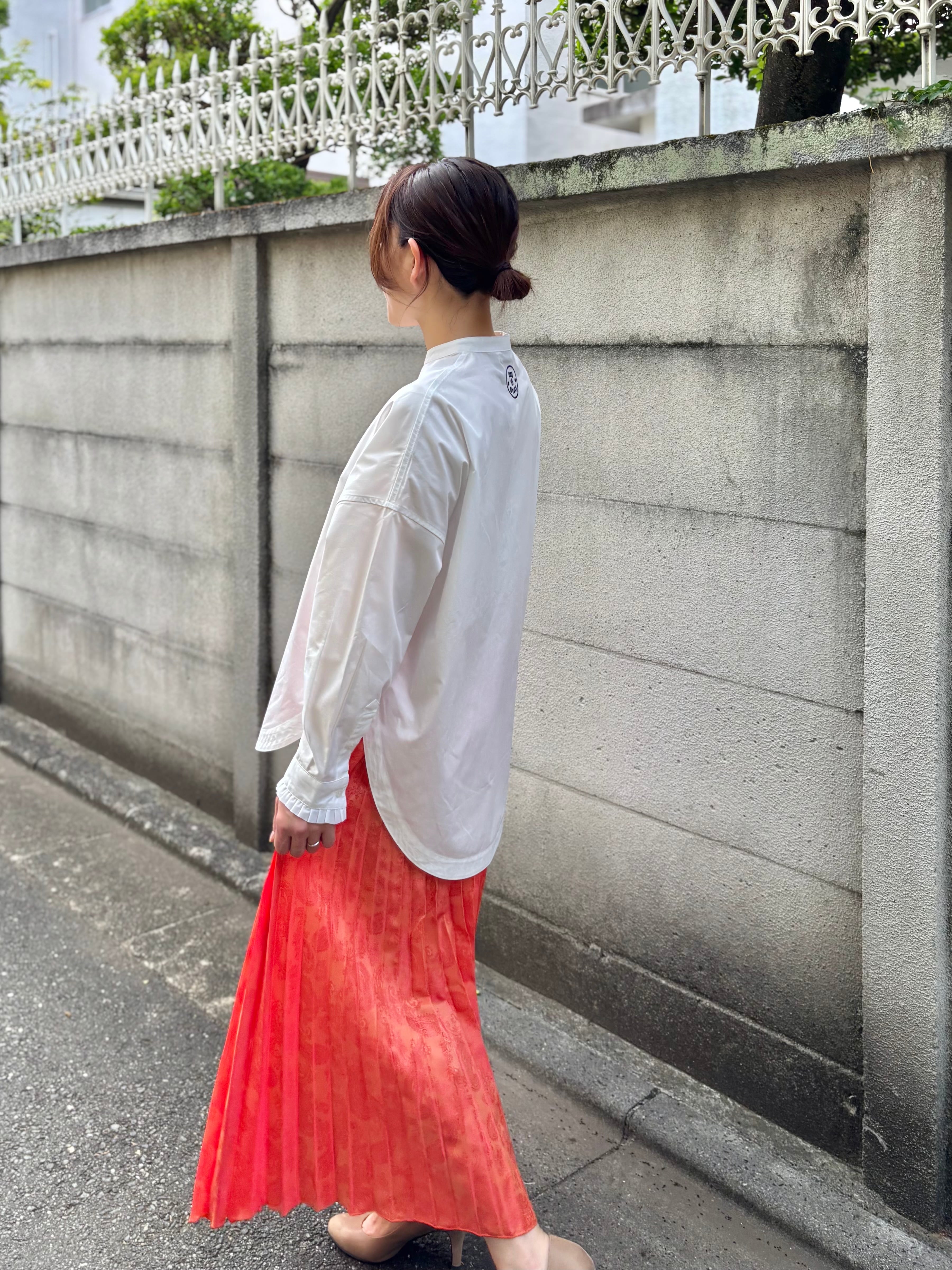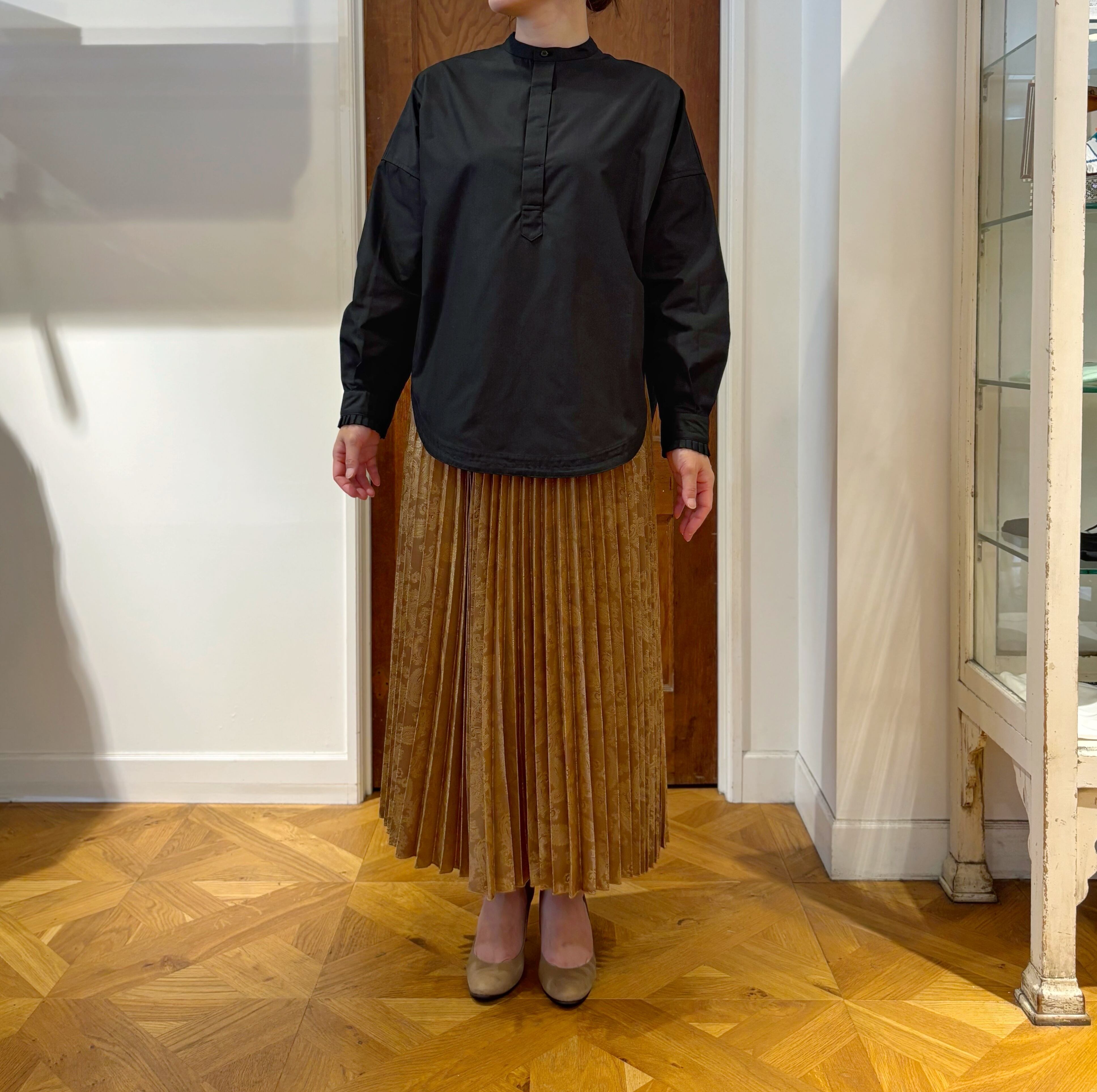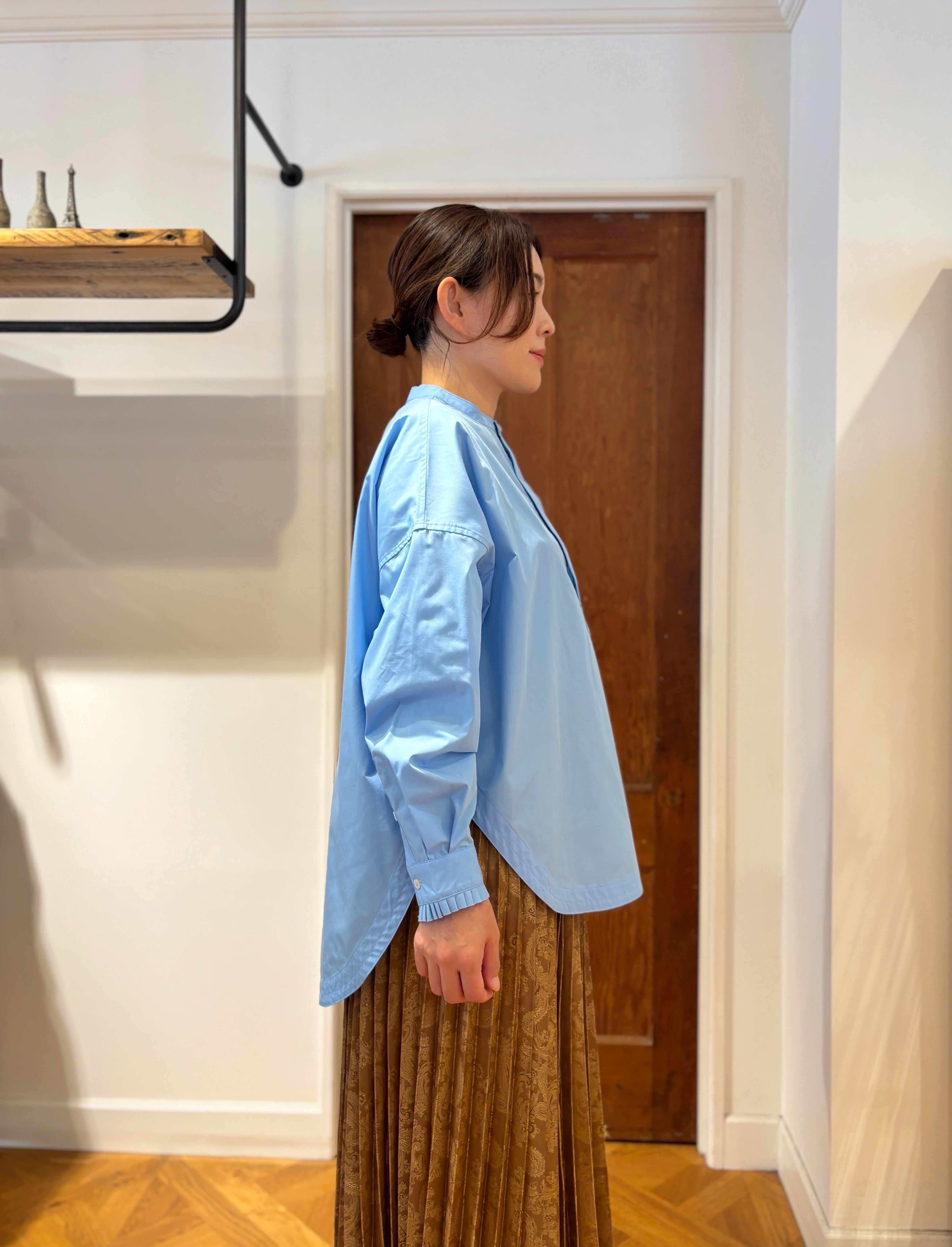清潔感のあるバンドカラーに、裾へ向かって大きくラウンドする丸みのあるシルエット。女性らしい柔らかさをさり気なく添えています。