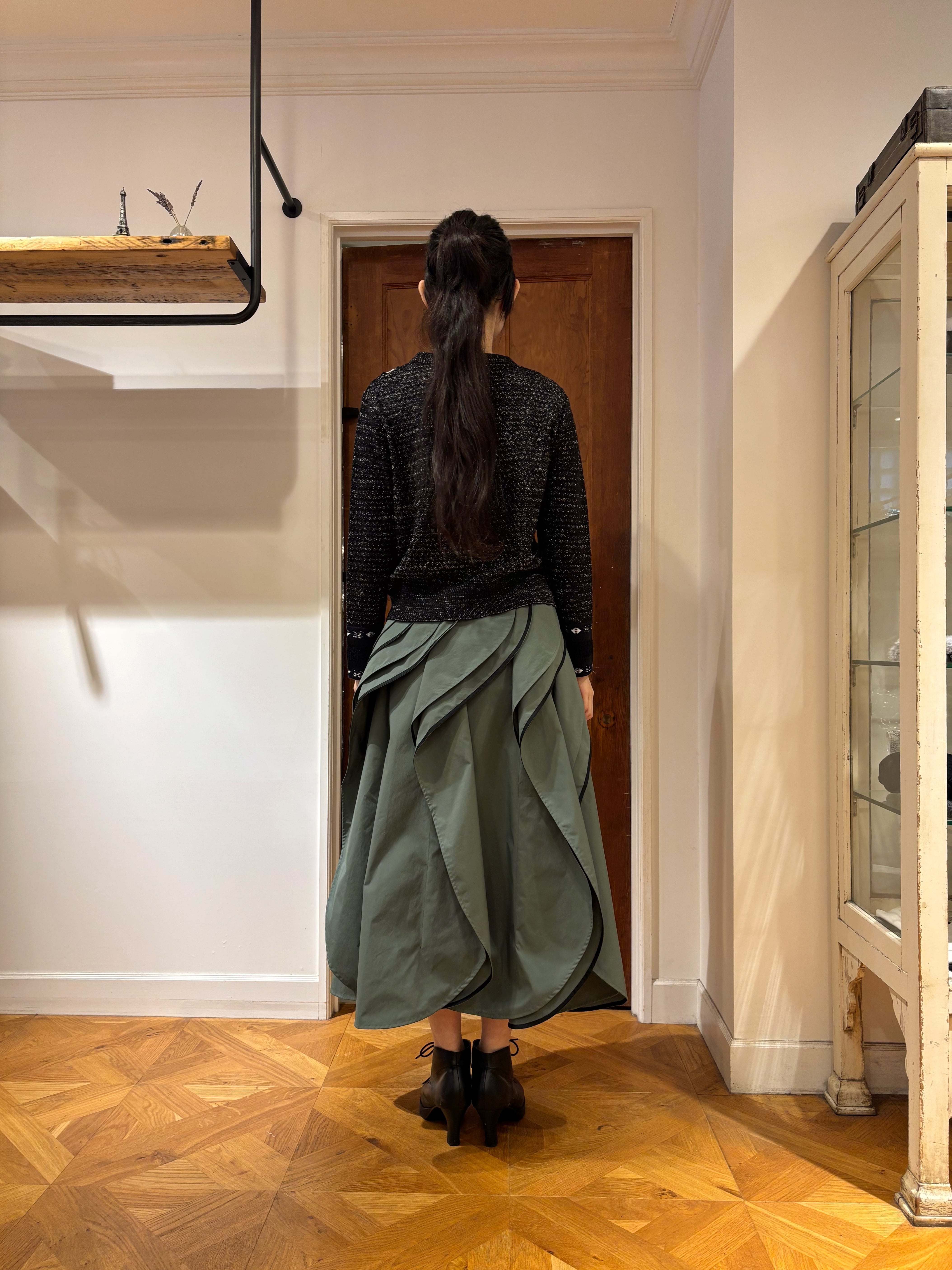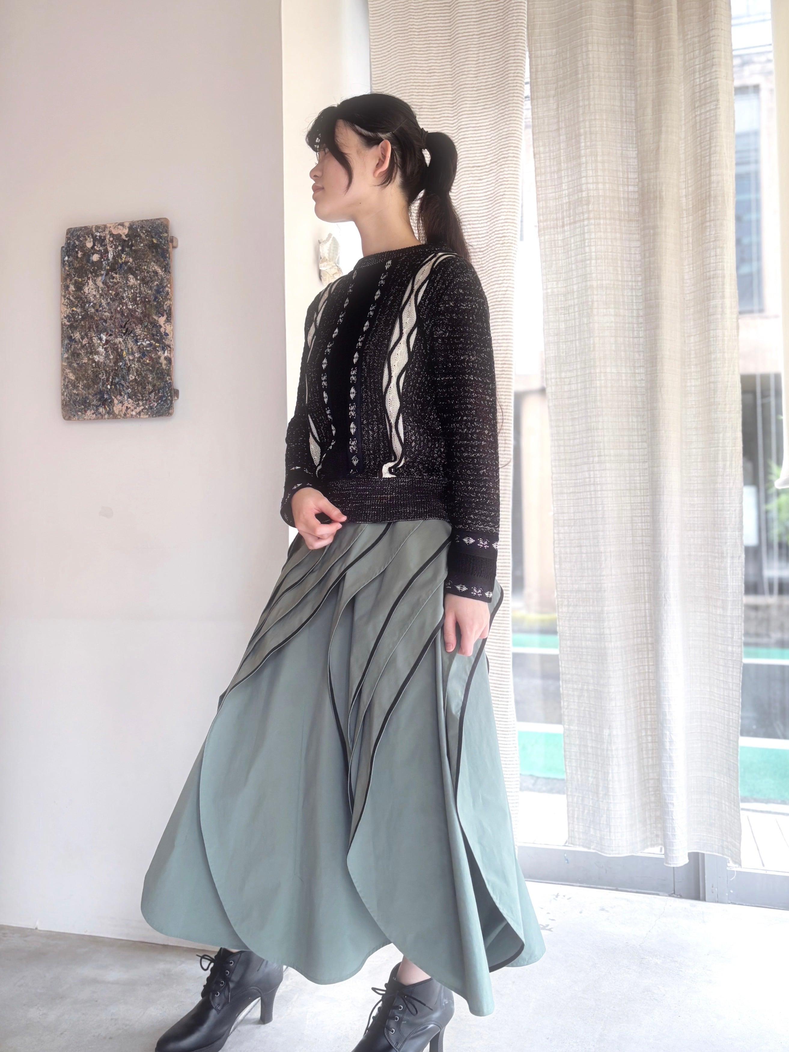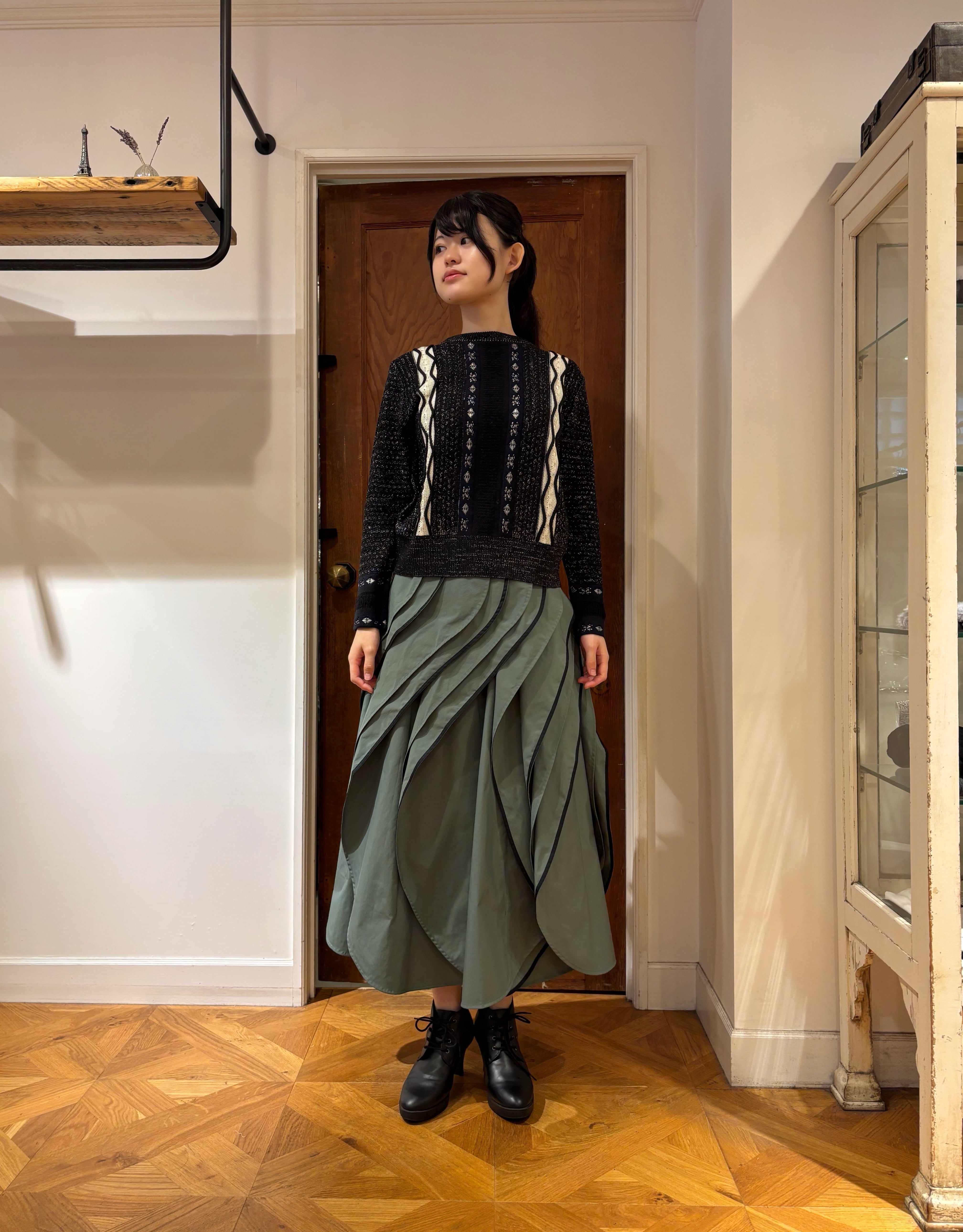 オーバーサイズが席巻している昨今、フレアスカート好きの店主は(自分では履かないけれど…)、「このバランスで着てほしい!」と思える、王道シルエットのエレガントなニットに久々に出会いました。