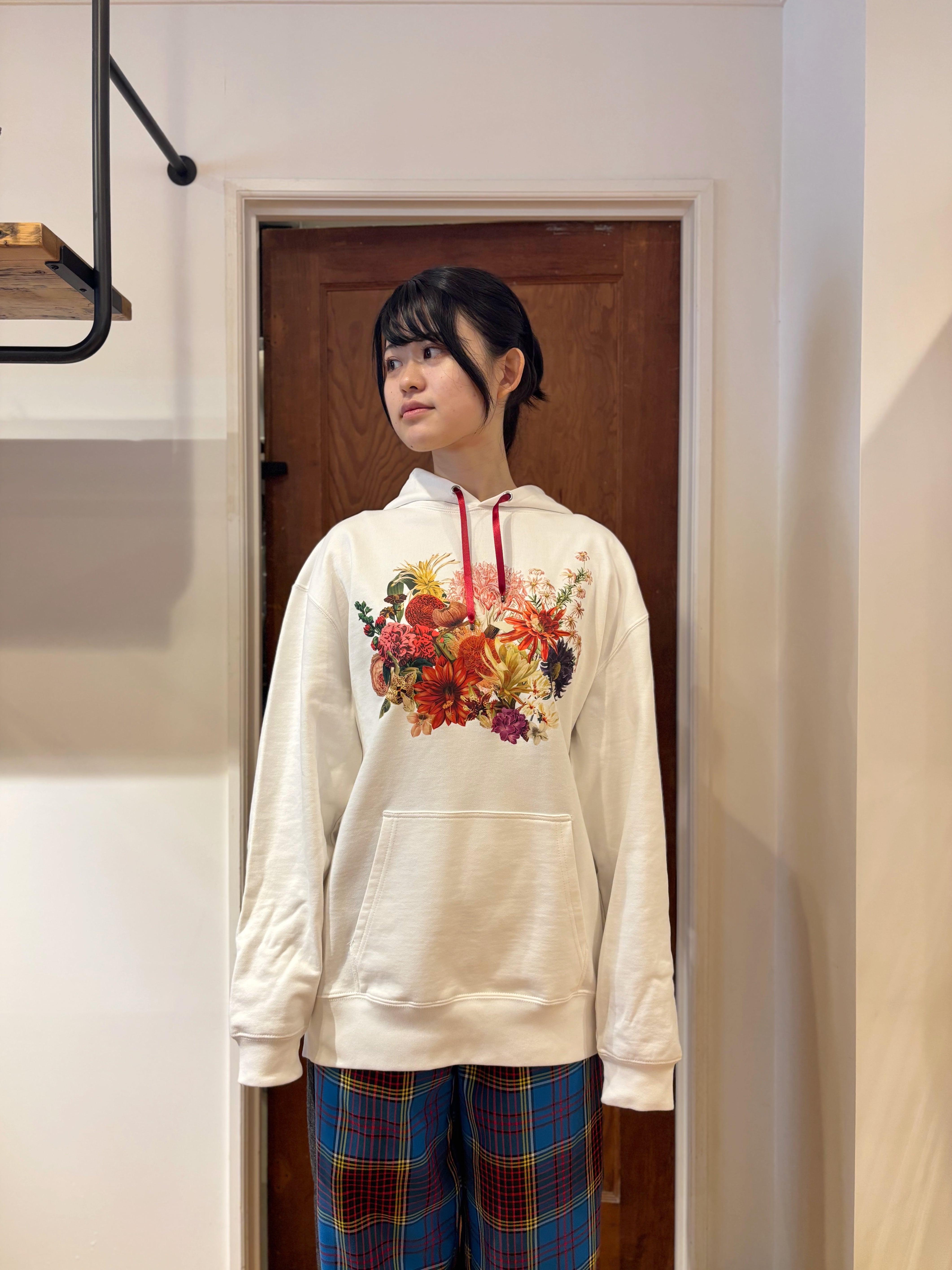 手描きのタッチが柔らかく、コンパクトなフードデザインと相まって、甘すぎず知的な印象に。