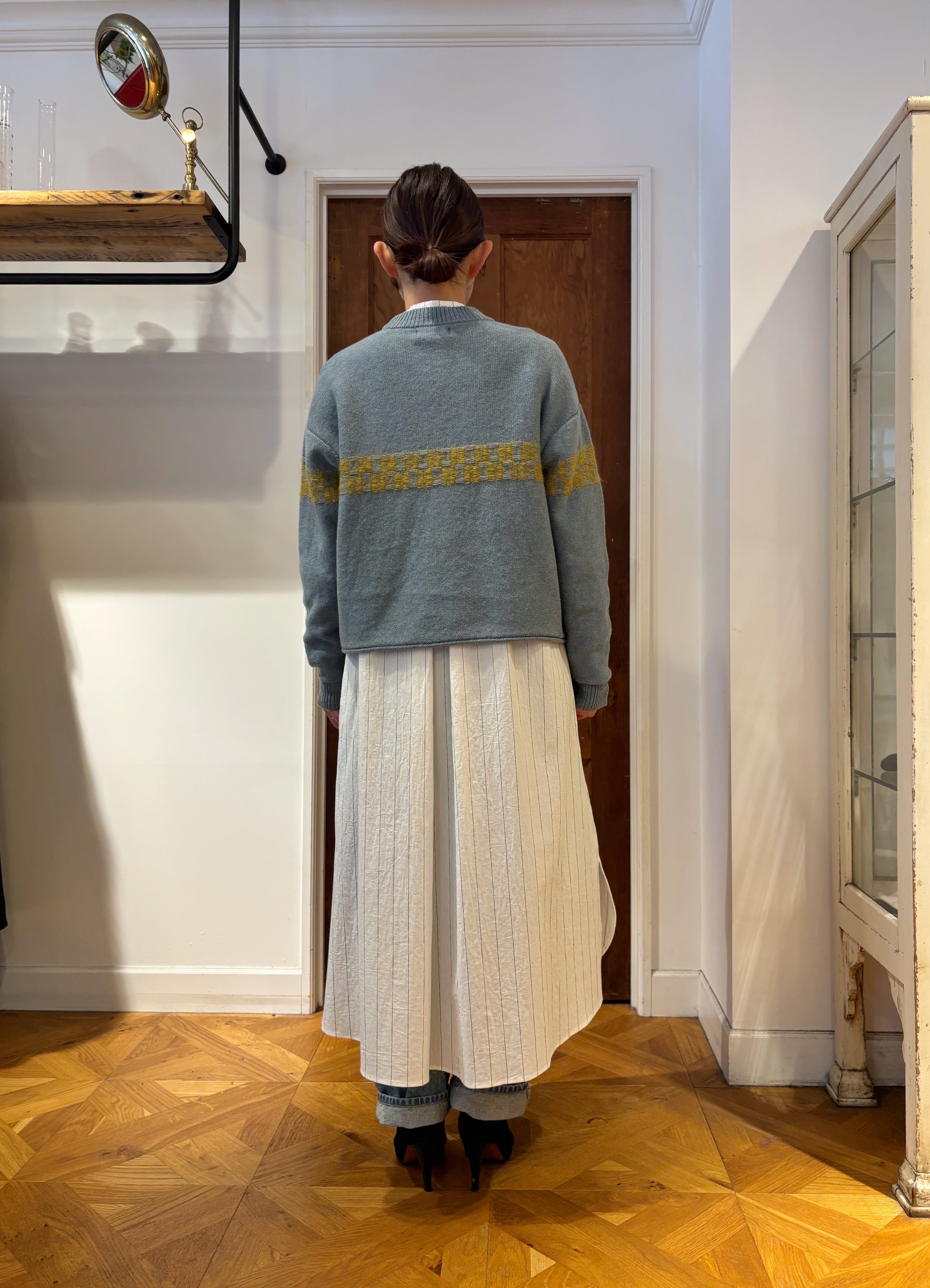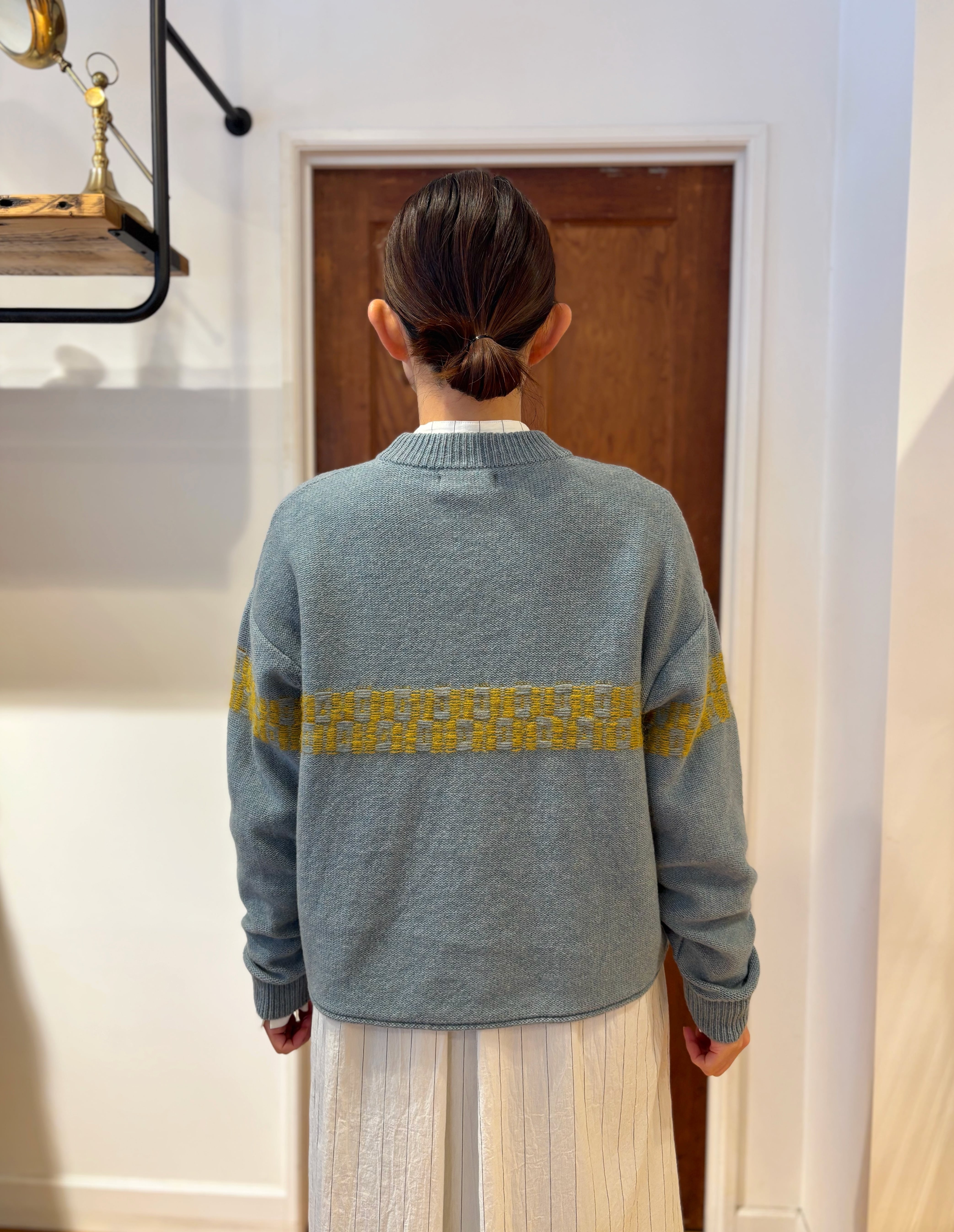 ブルーグレーには毛足の長い黄金色のアルパカ糸を使用。