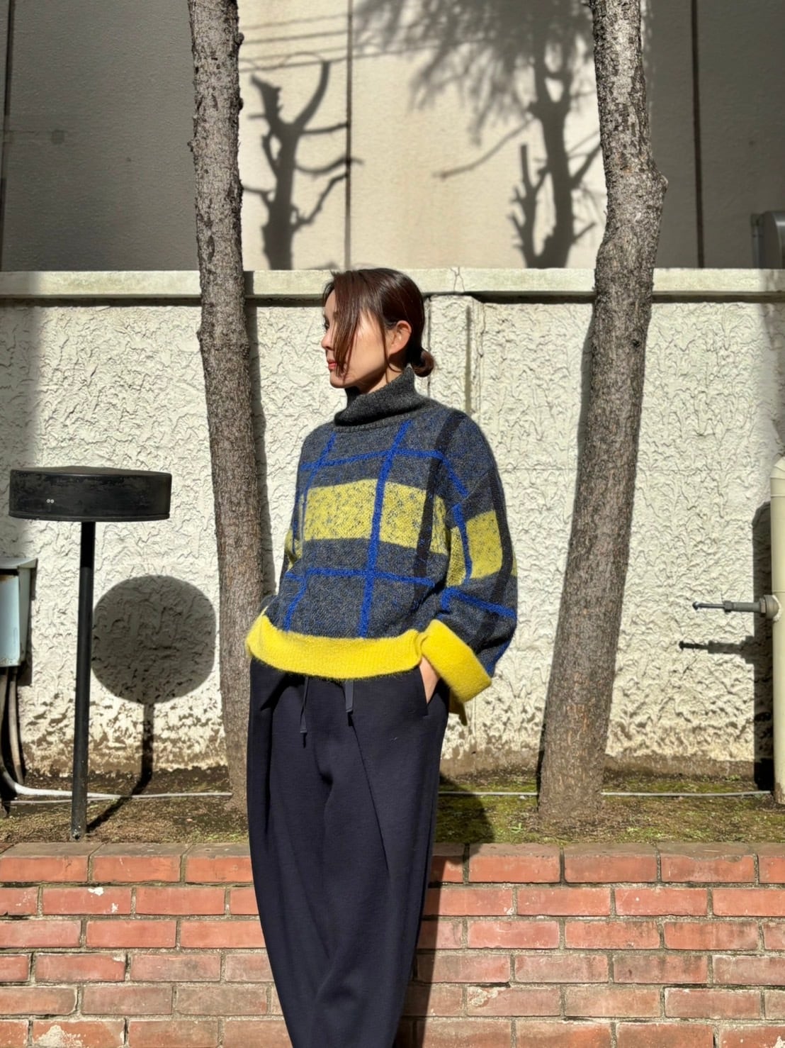 ジャカードで編み込まれたシャギーヤーンが奥行きを添えるチェックニット。