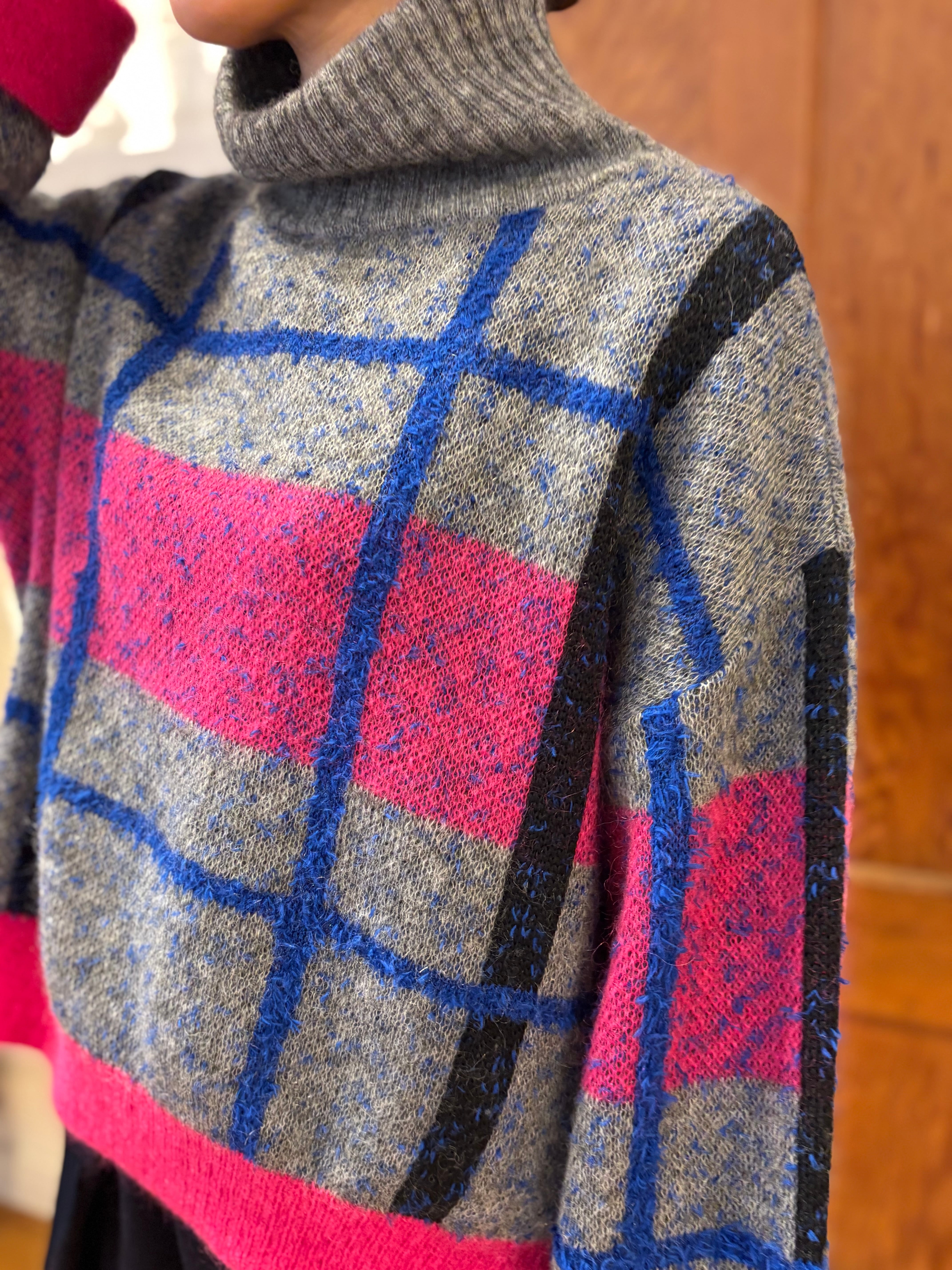 this jacquard-knit check sweater weaves shaggy yarns that catch the light subtly,