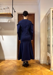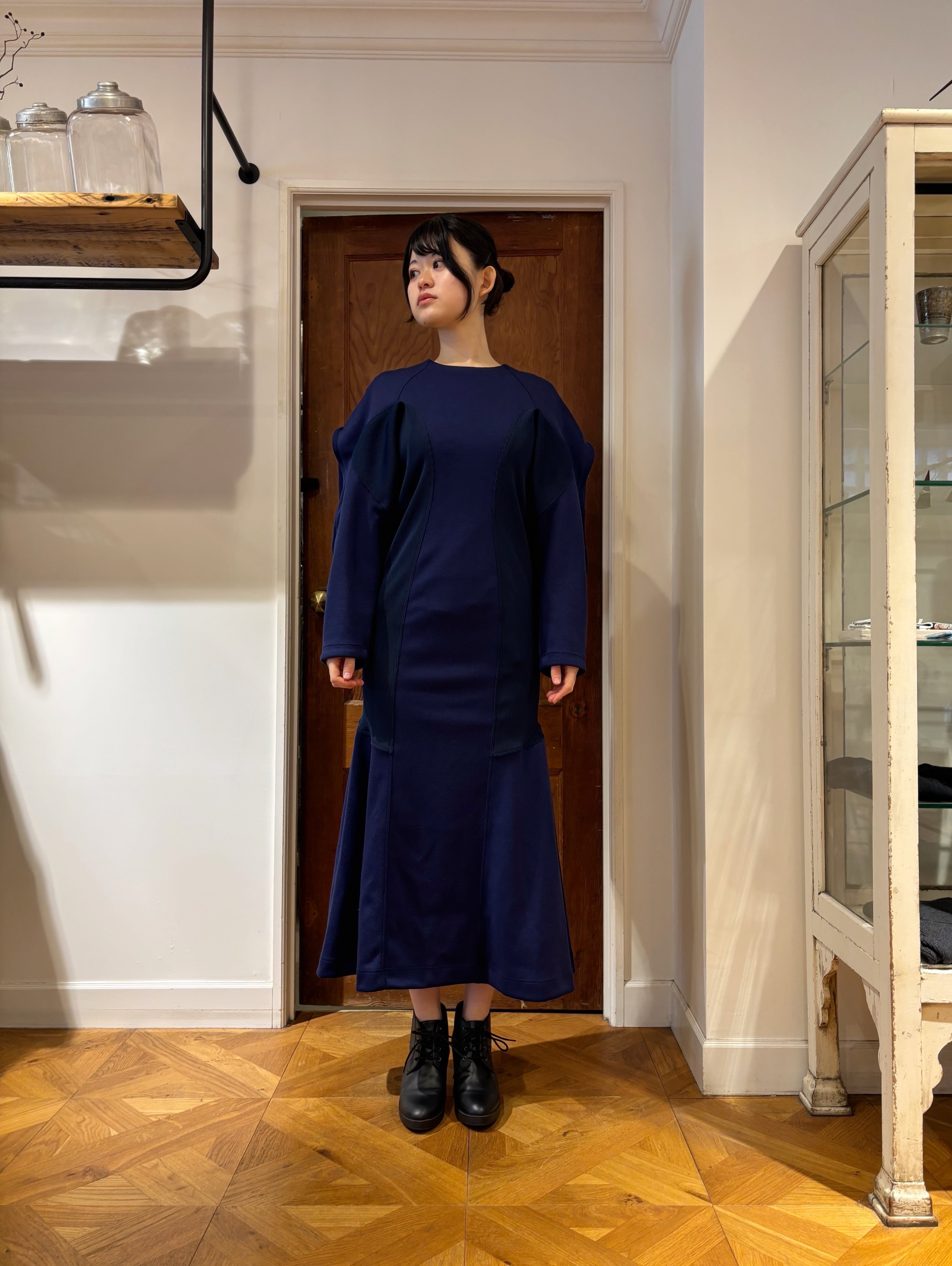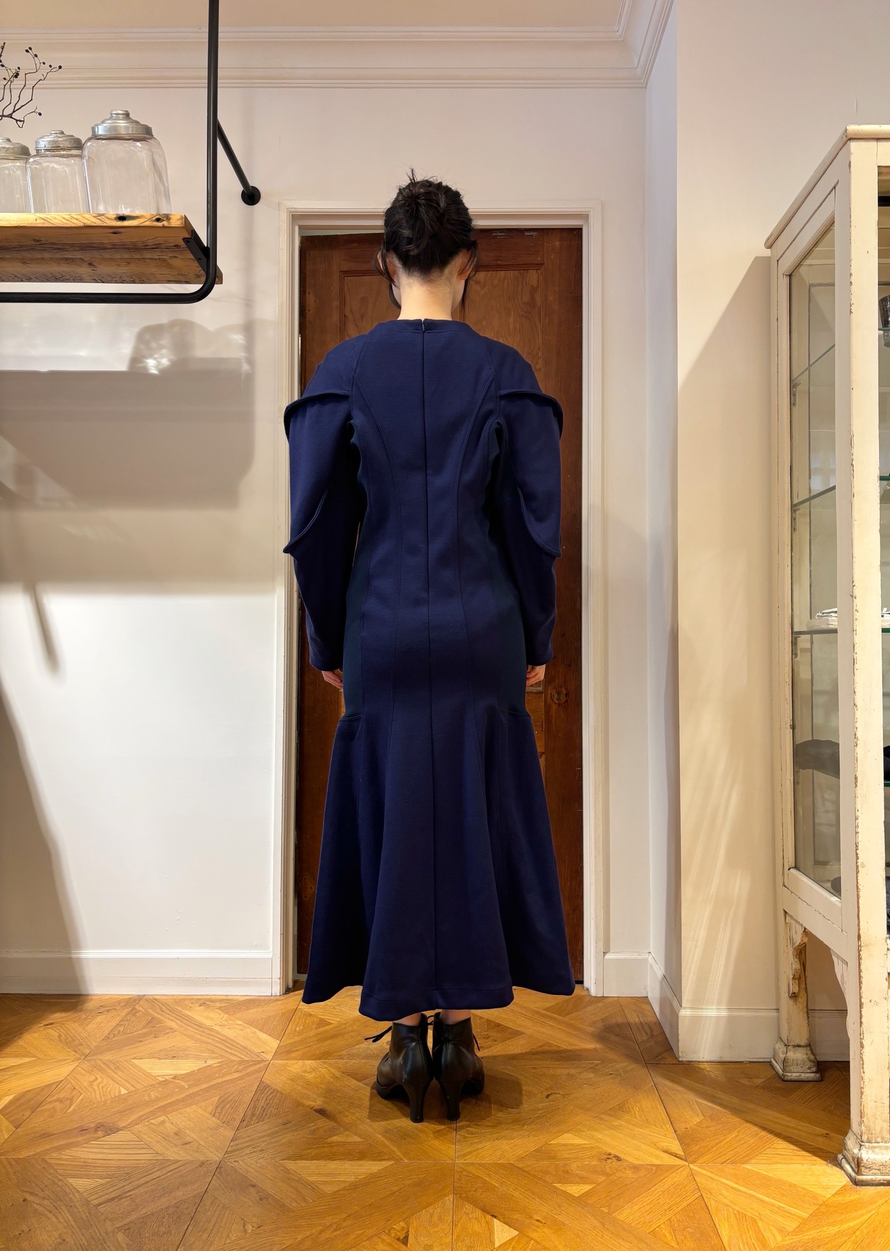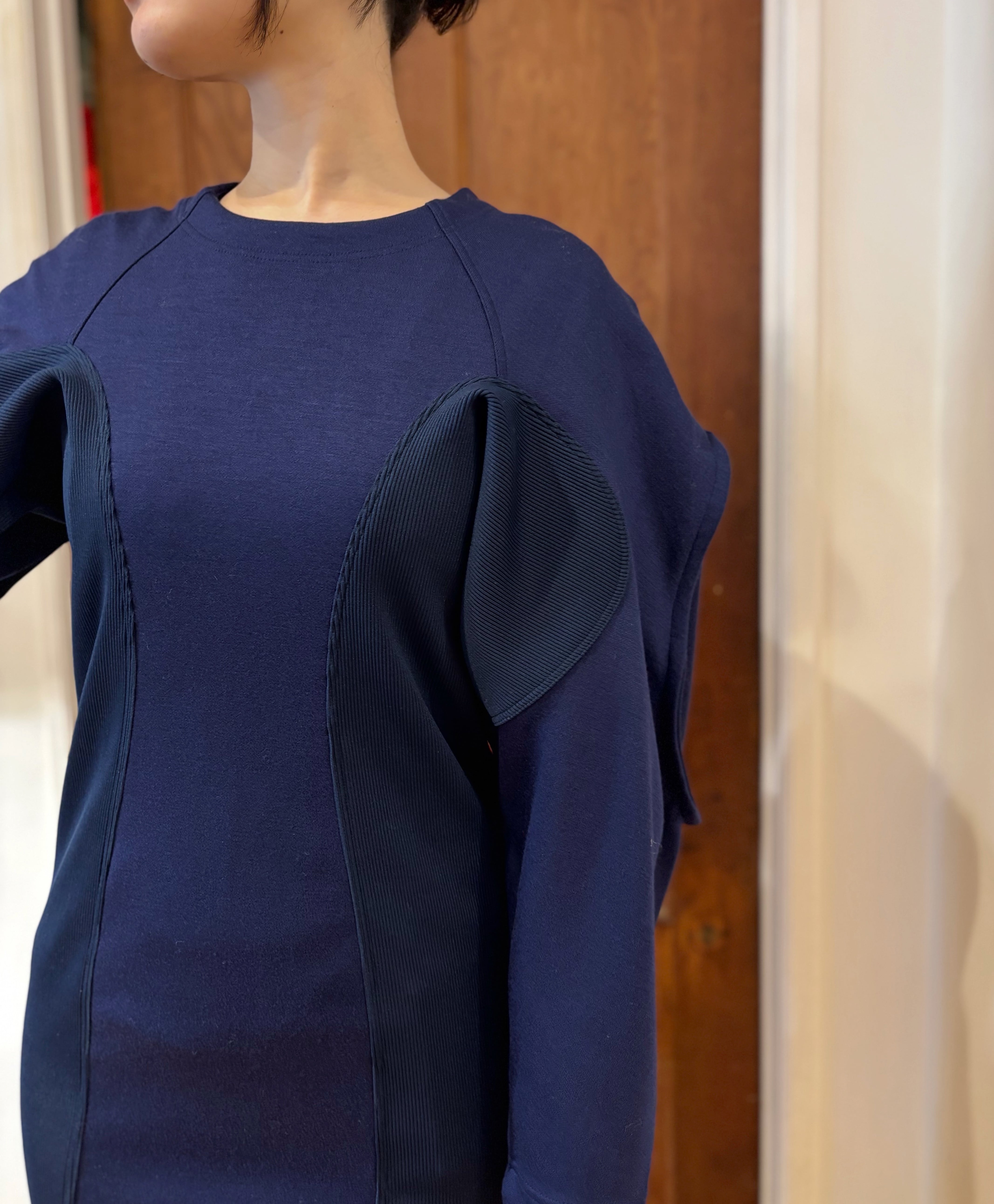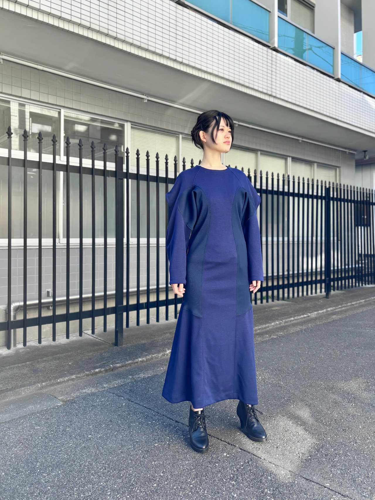 ボディコンシャスなシルエットに、袖とスカートの立体的なボリュームを重ねたワンピース。