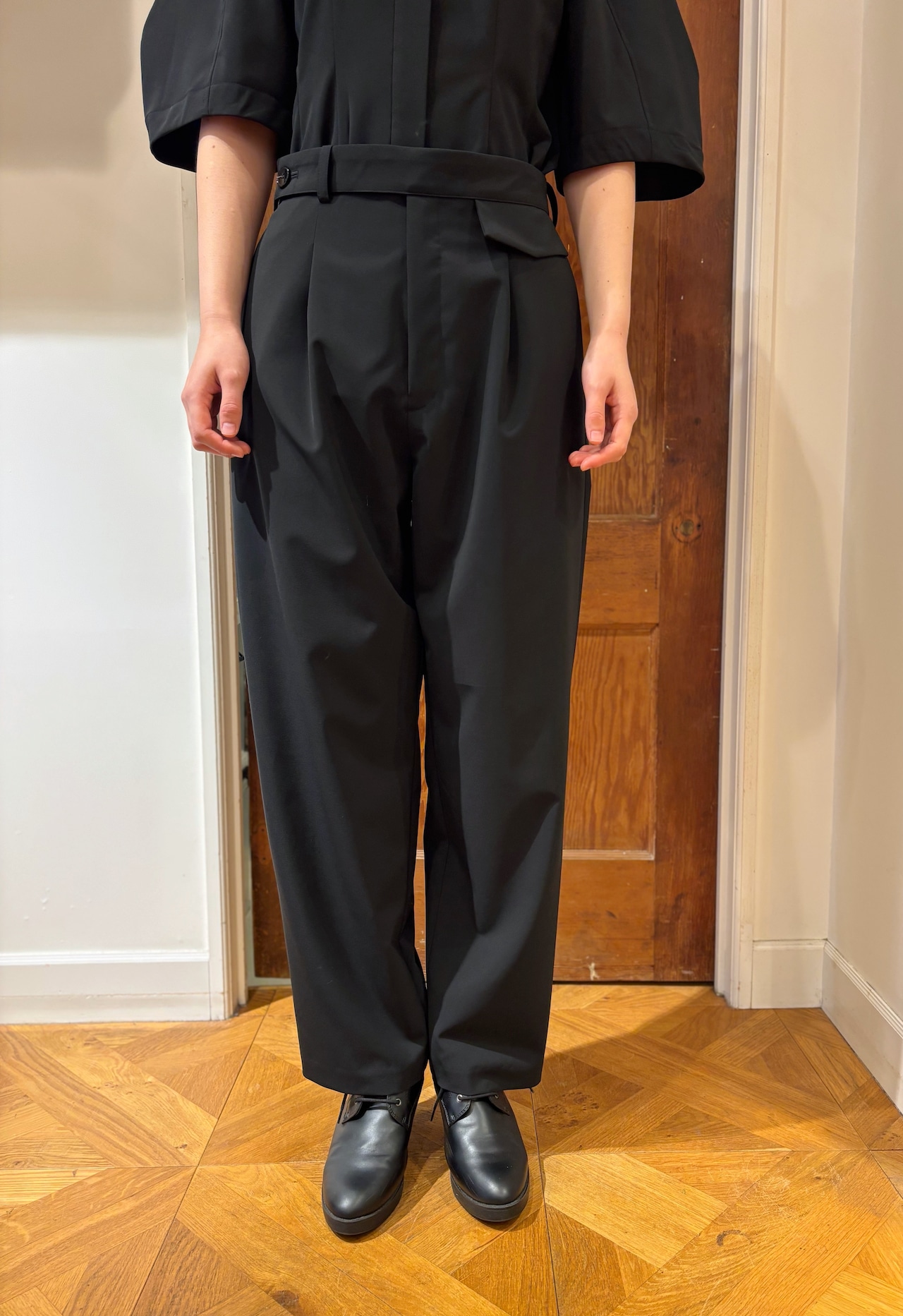 ウエストには、フラップ風の“騙しポケット”ディテールと、ベルトを巻いたようなボタンデザイン。