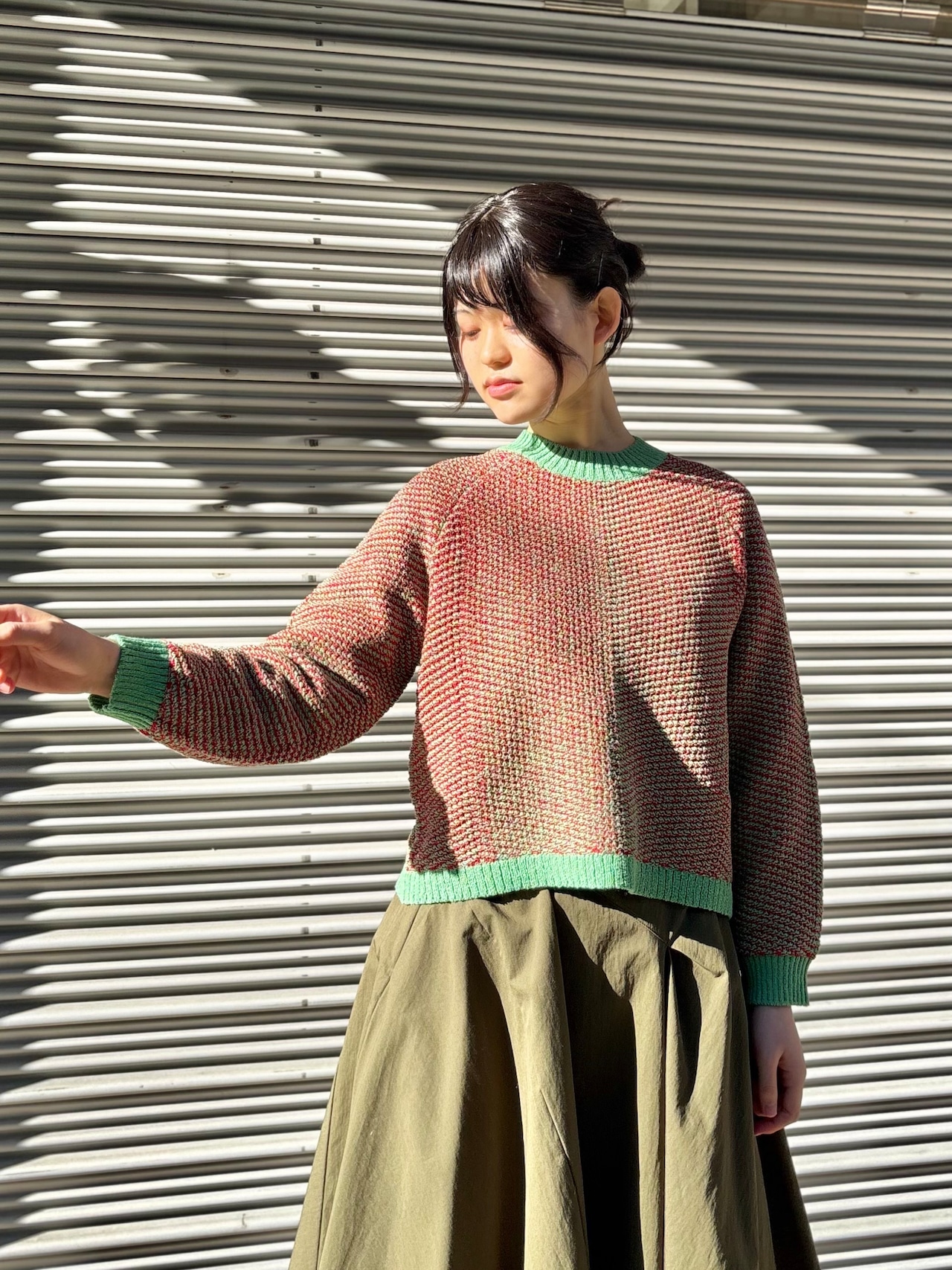 写真のようにカーキを合わせてグリーン寄りにまとめても素敵。朱色が効いた赤のフレアスカートを合わせれば、パンチのあるガーリーコーデに。