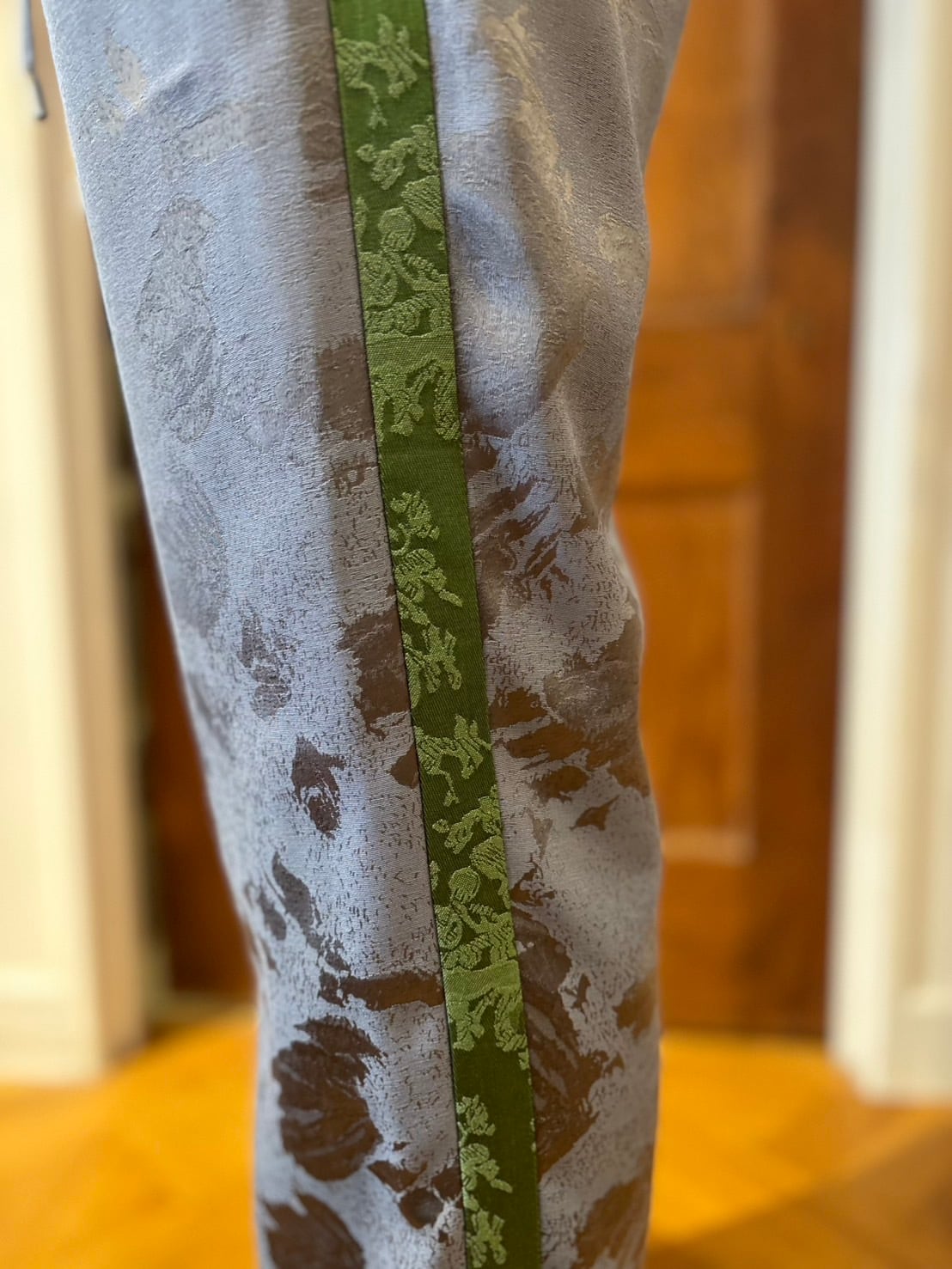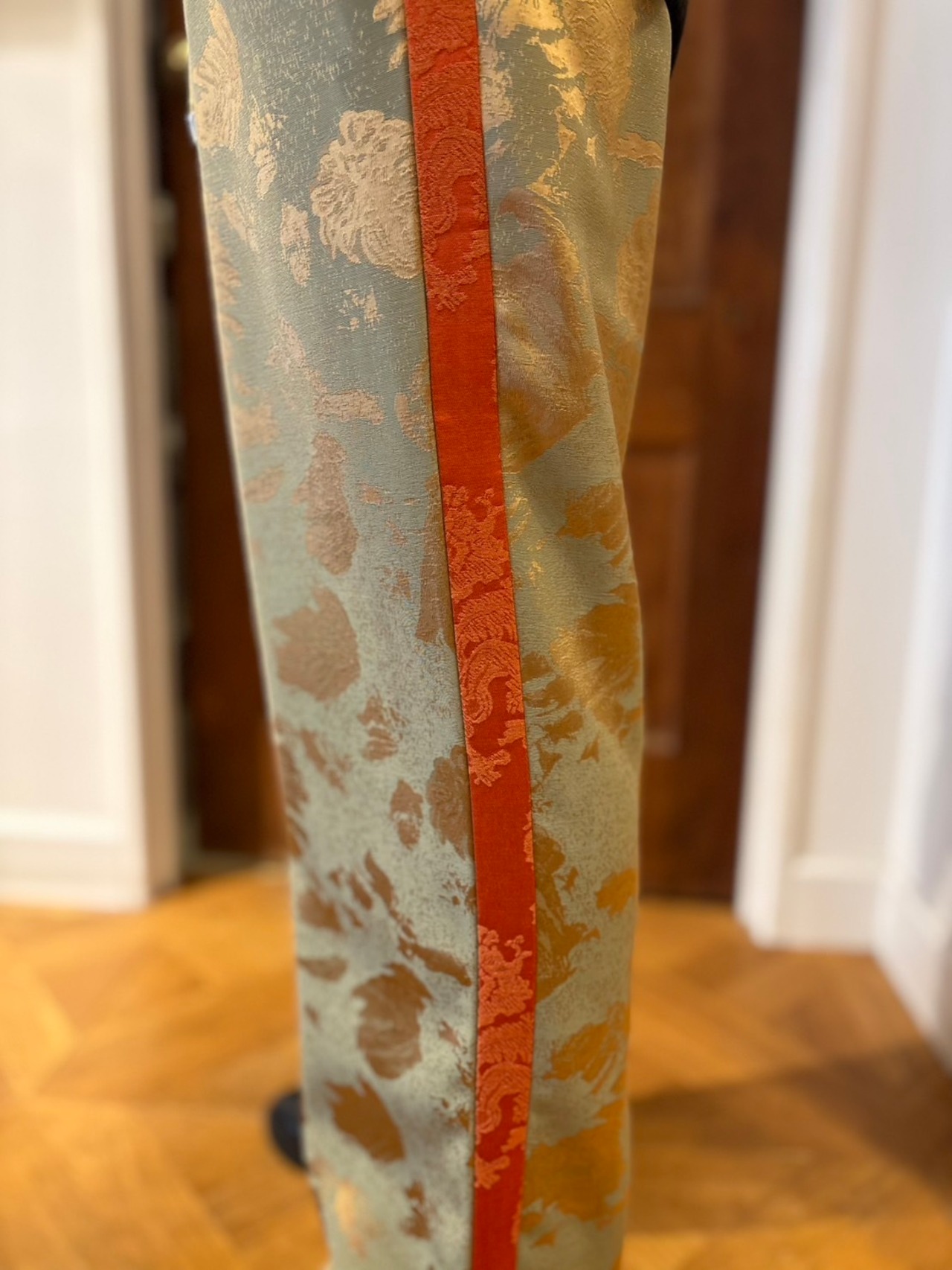 It adds a clean, modern edge and creates a flattering vertical line—keeping jacquard from looking “matronly” and instead making it feel light, crisp, and city-smart.