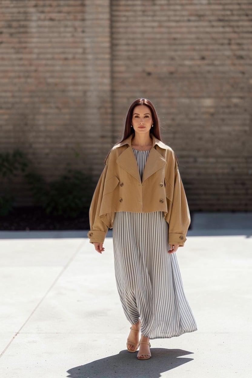 Though it’s cropped, the softly flared tent silhouette keeps your lines clean and polished, balancing beautifully with both pants and skirts.