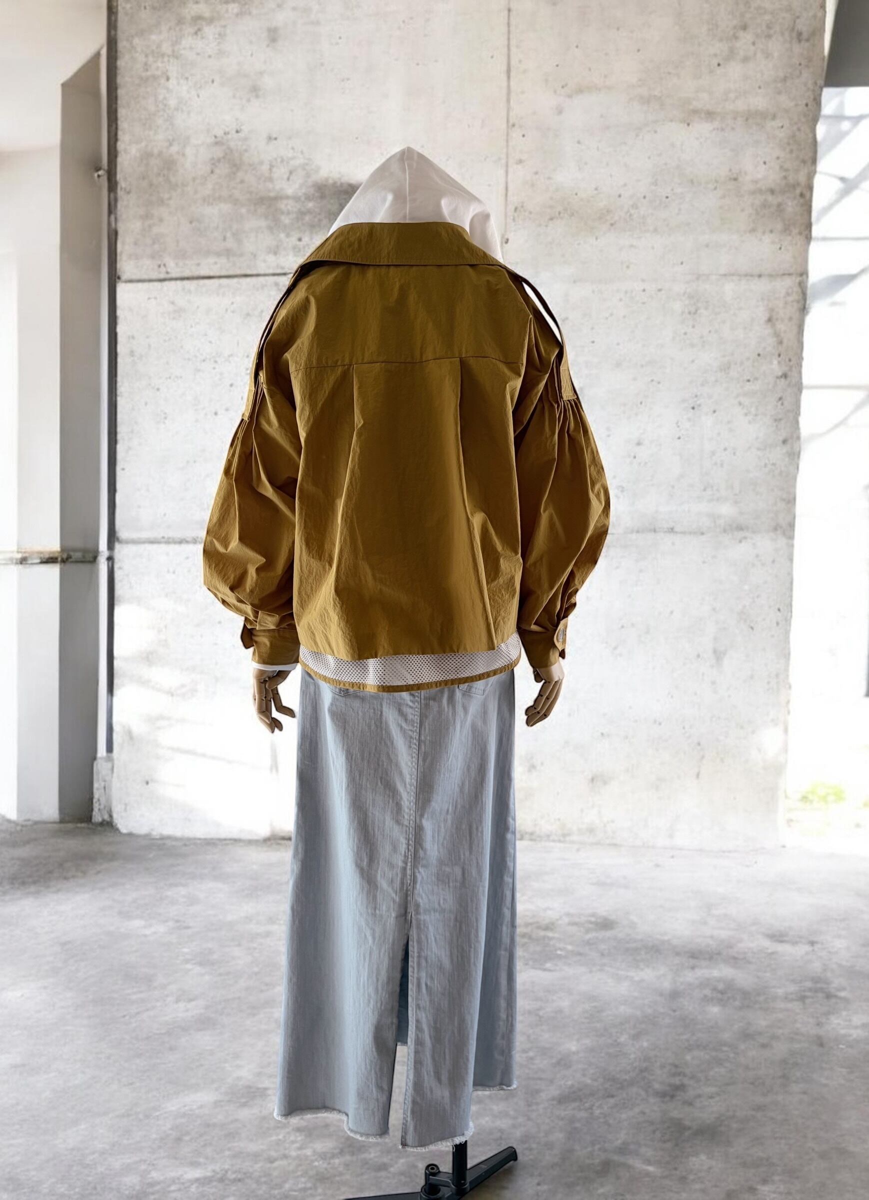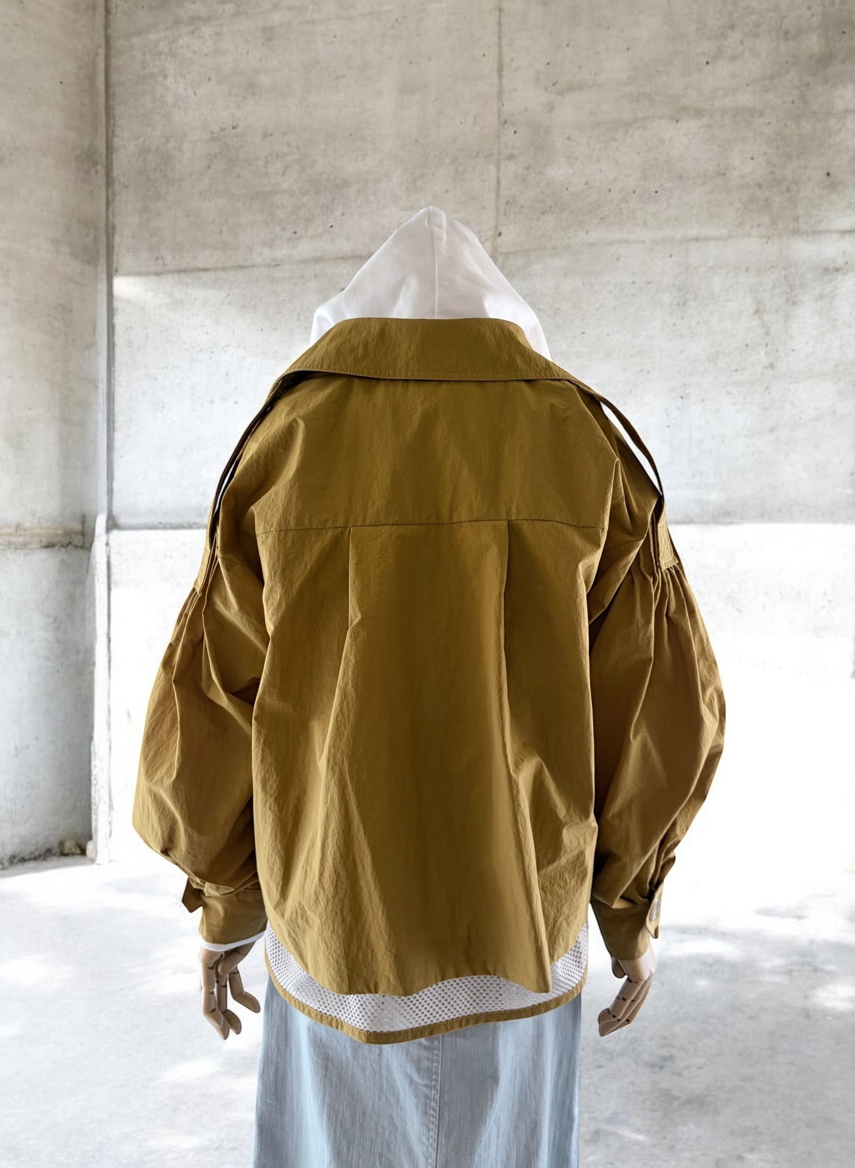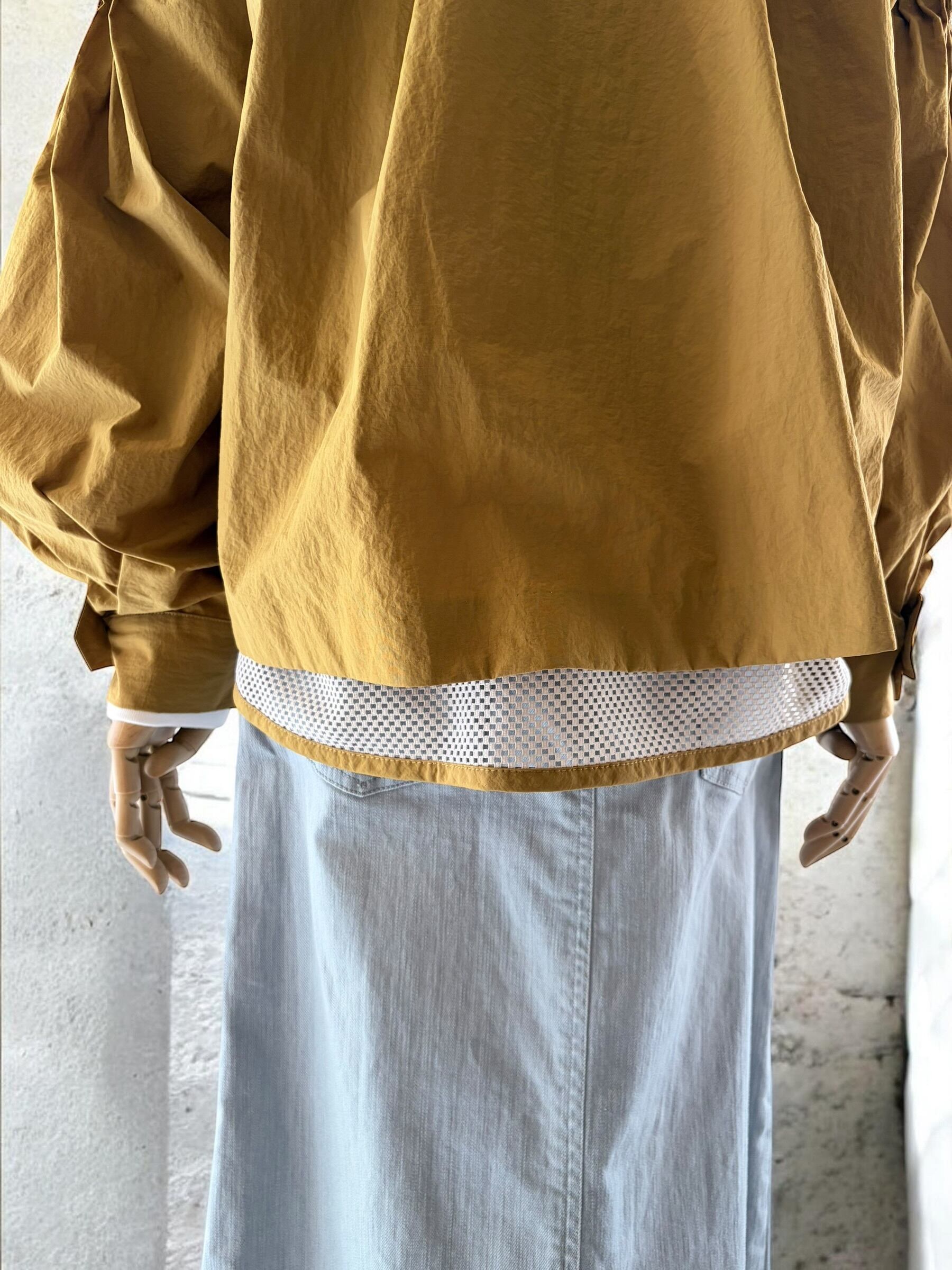 後ろ裾にはメッシュ素材をドッキング。動くたびに空気が通って、見た目にも着心地にも軽快さが生まれます。