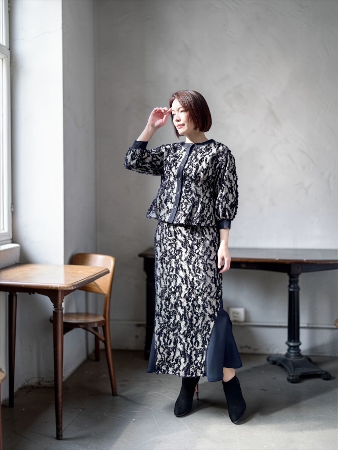 ネイビーは、同素材のスカートと合わせたセットアップスタイルもおすすめ。