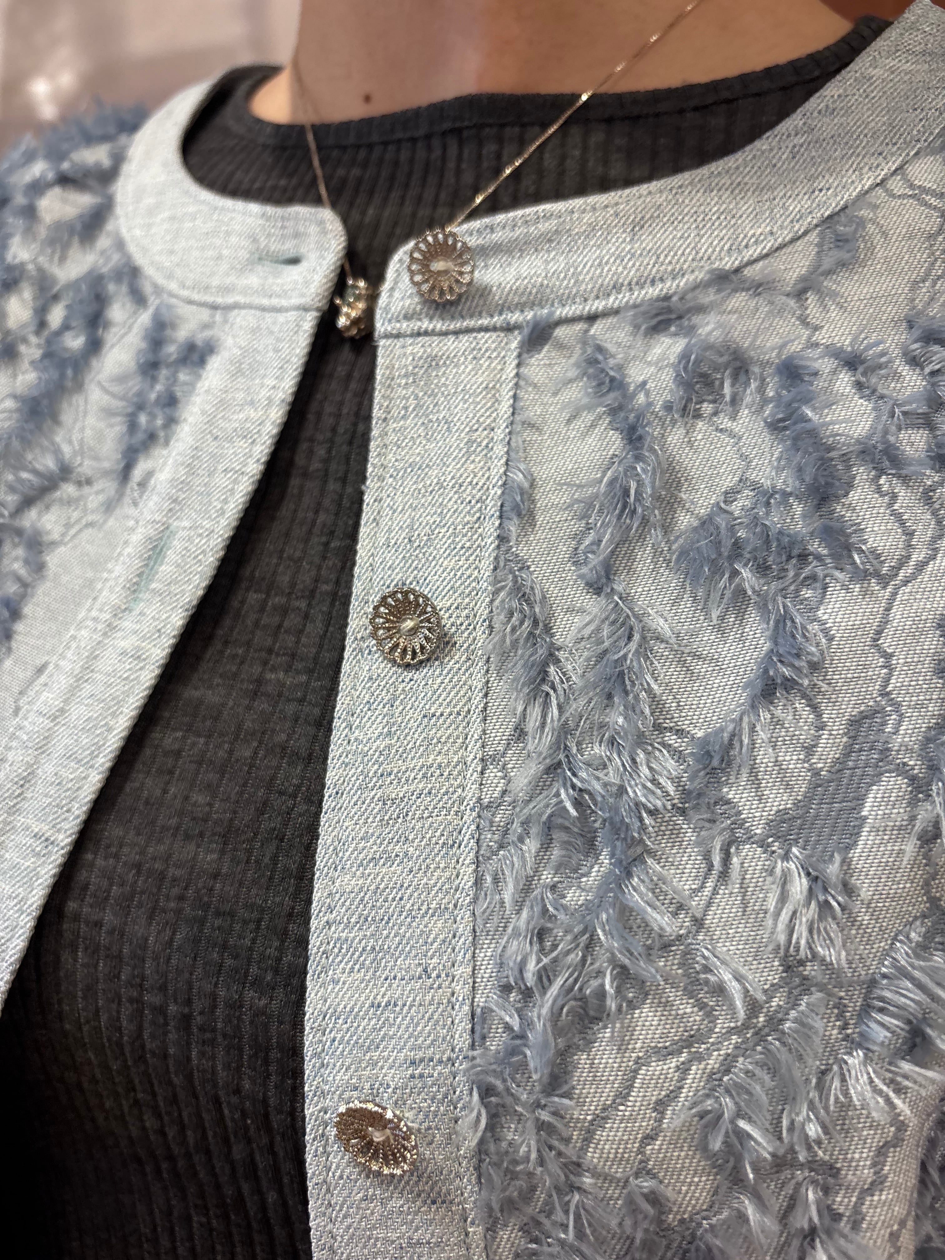 This elegant jacket is crafted from a delicate cut jacquard with a softly textured surface, reminiscent of climbing botanical vines.