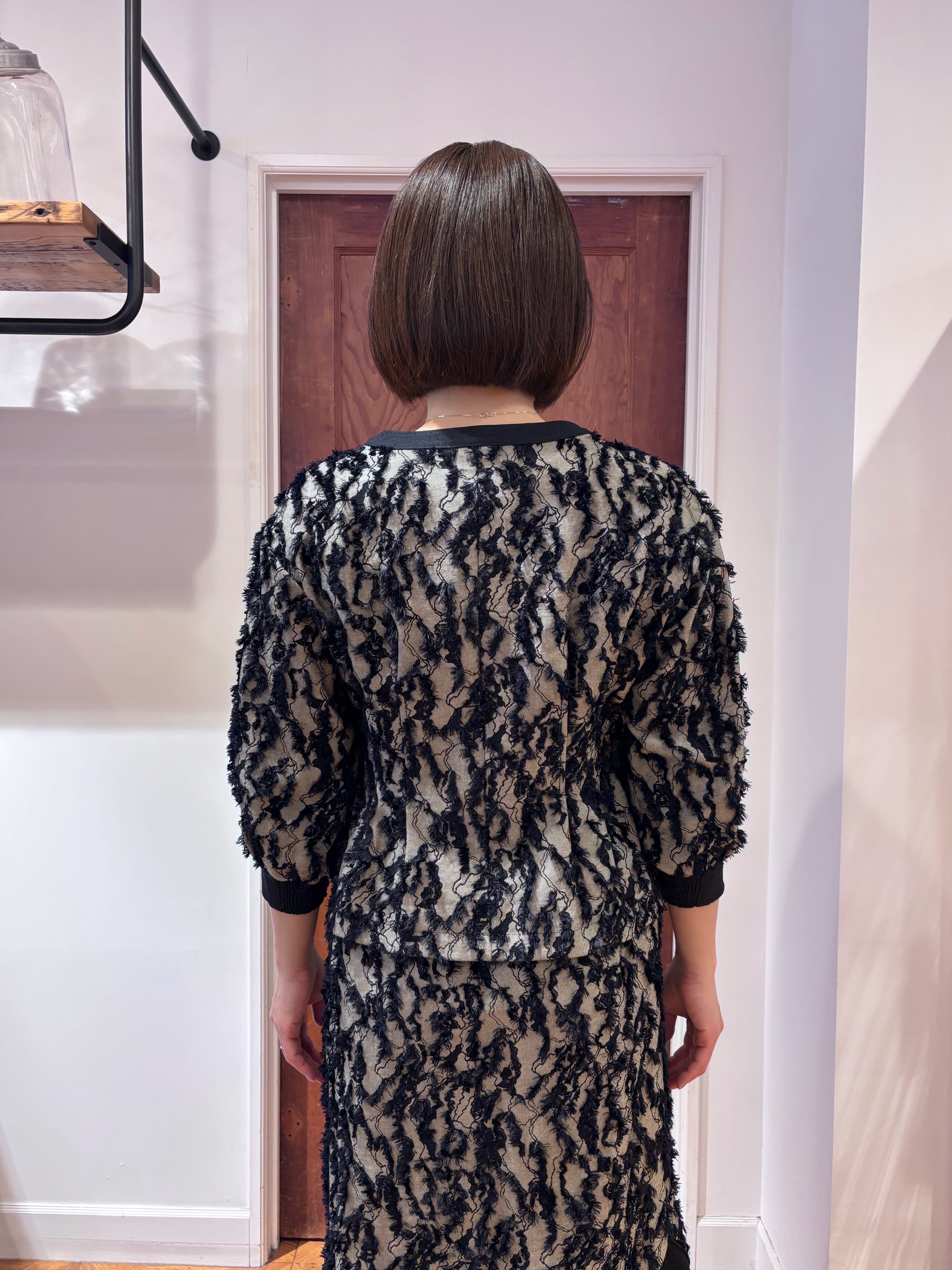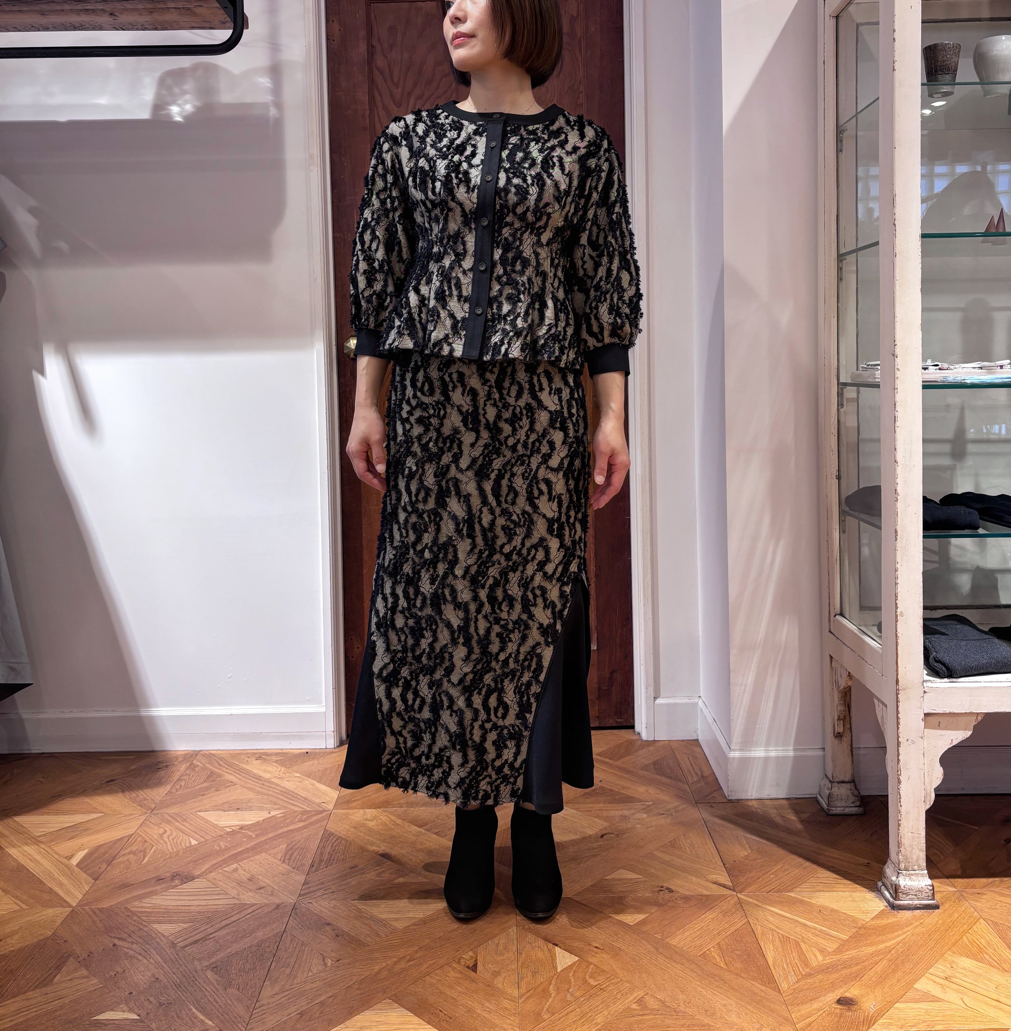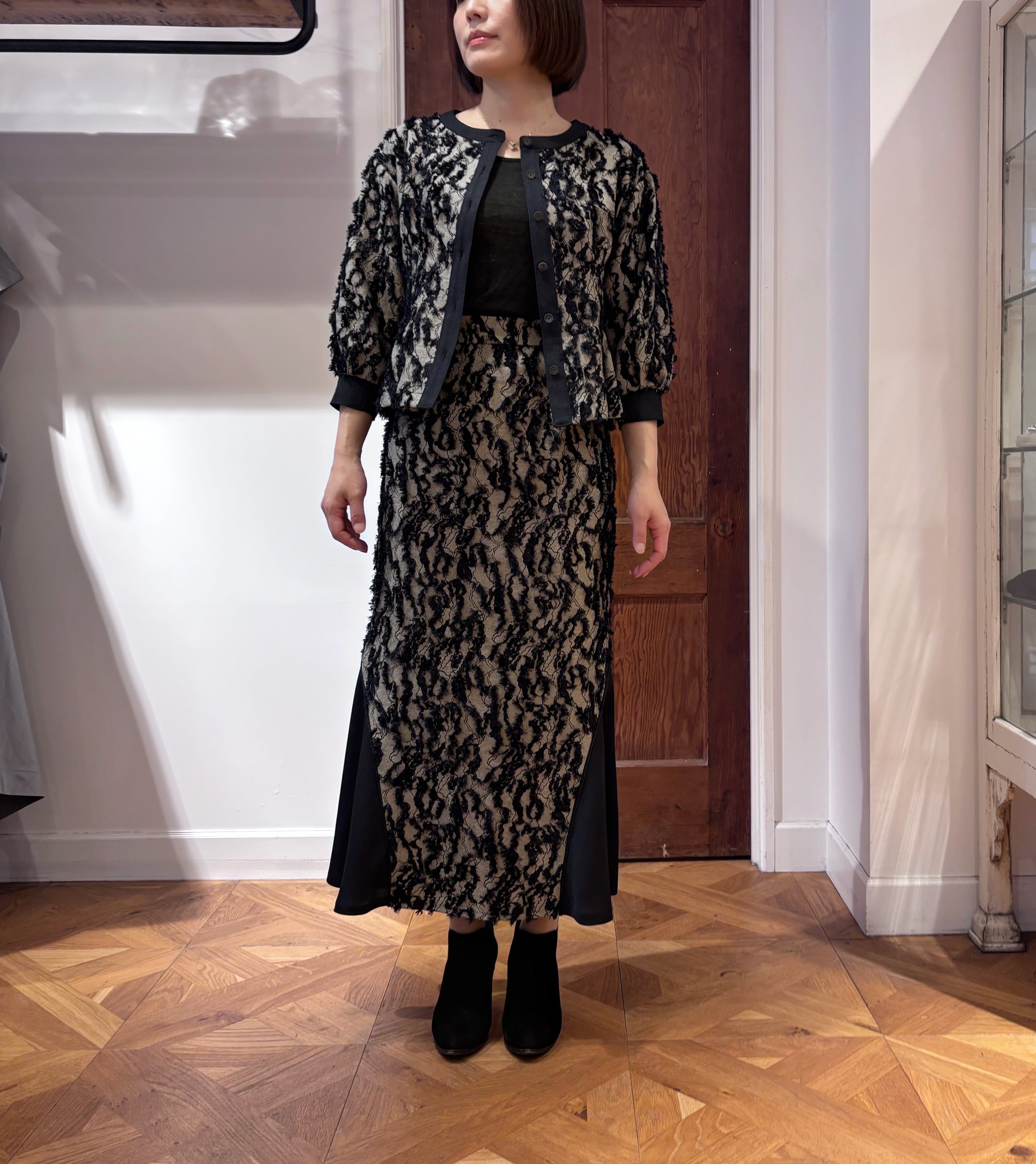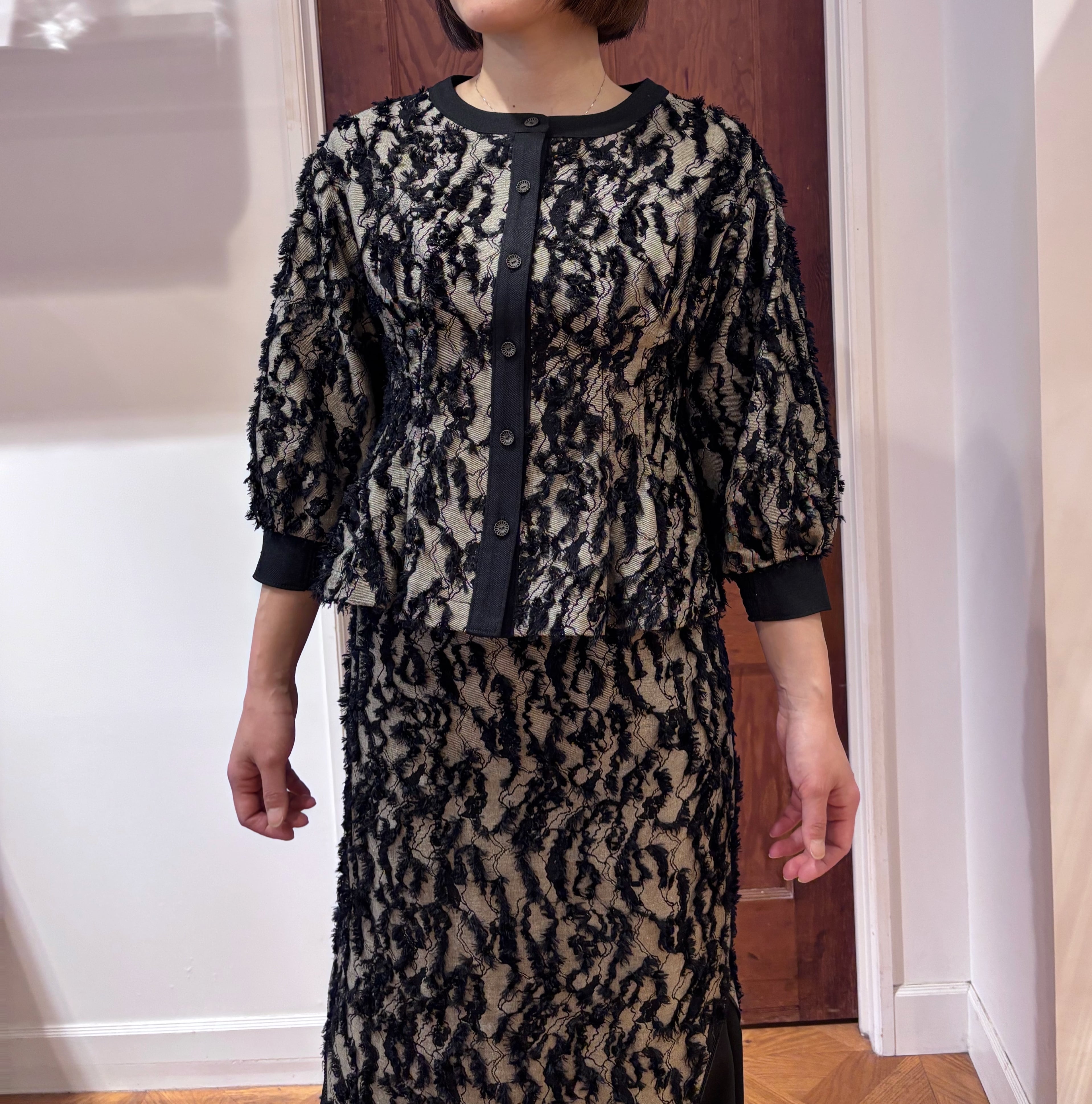 植物の蔓を思わせる、繊細で立体感のあるカットジャカードが印象的なジャケットです。