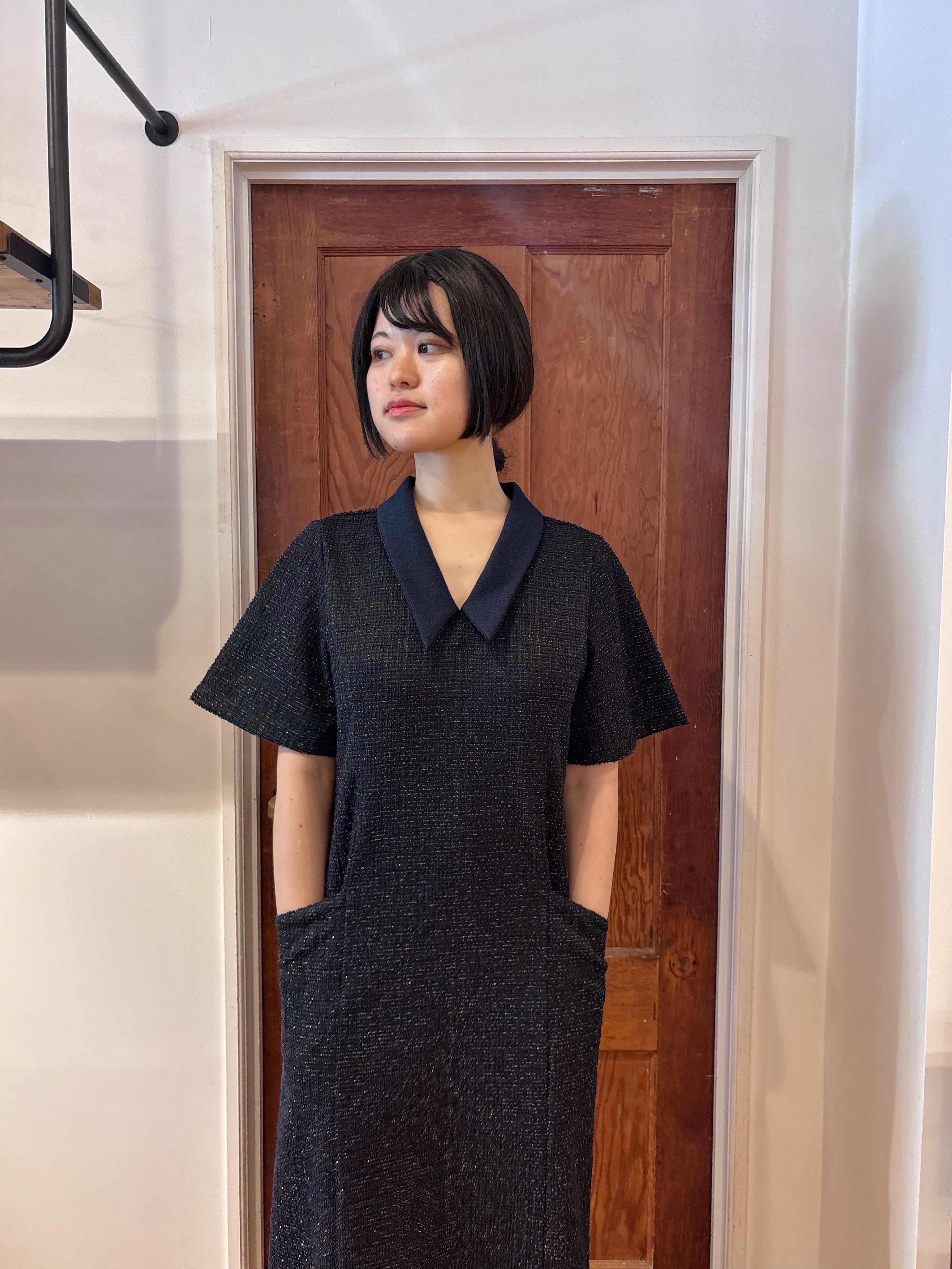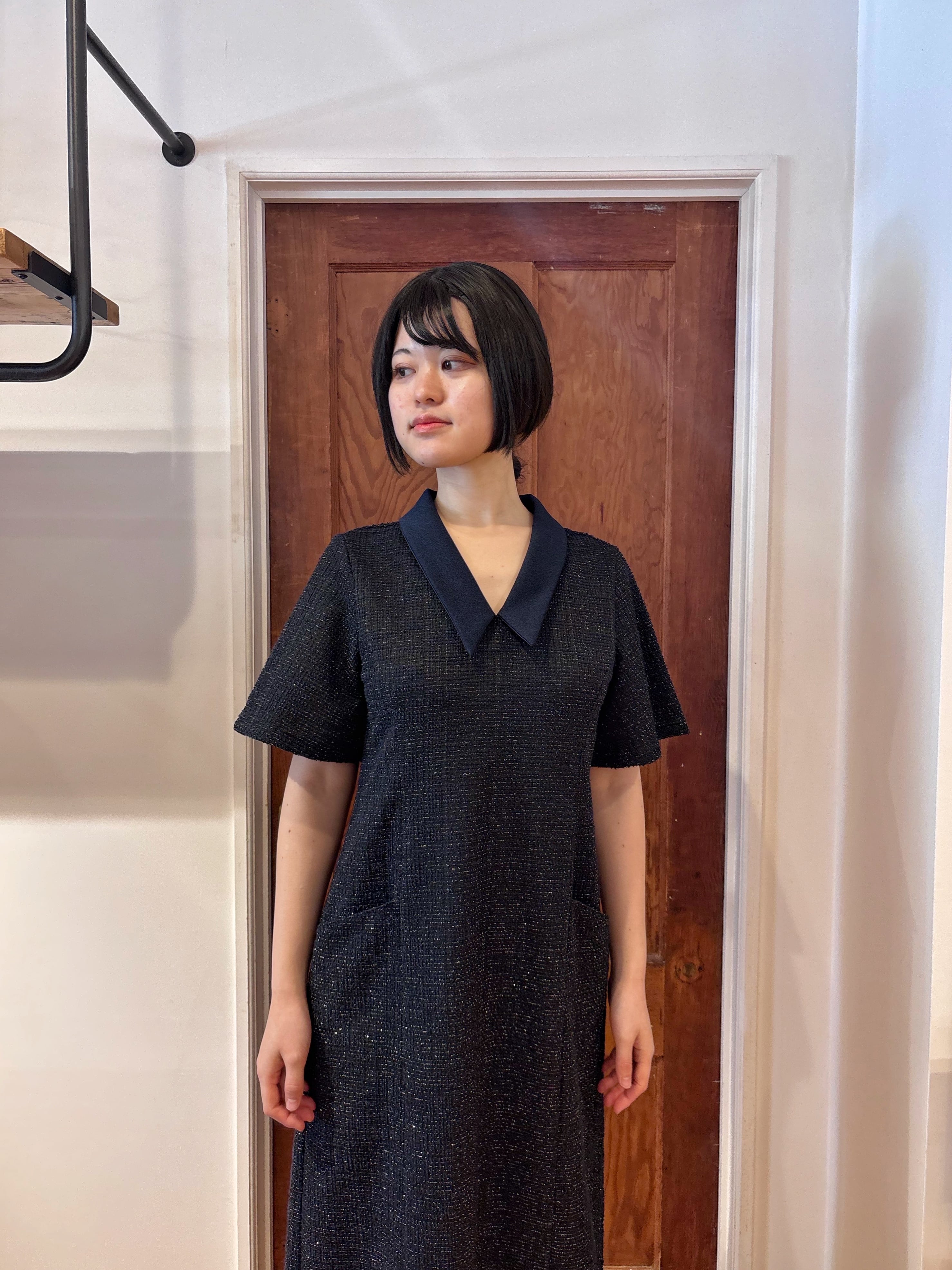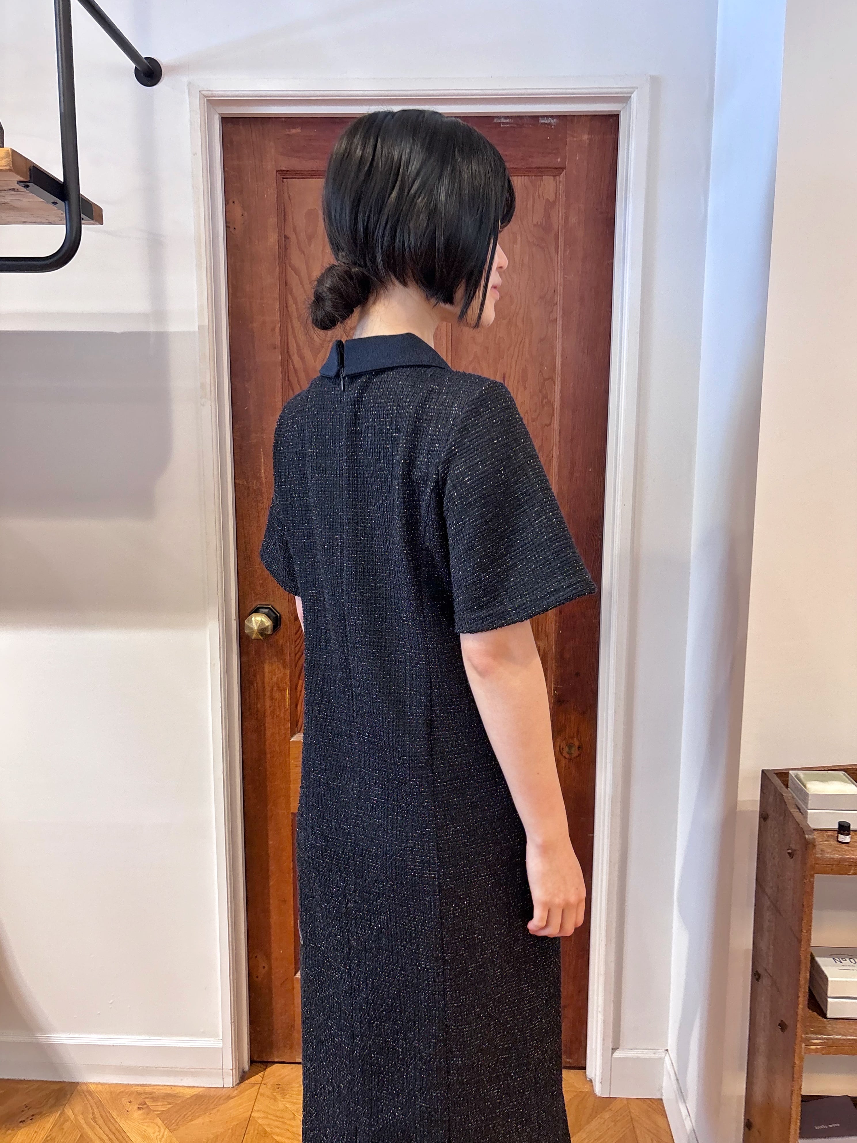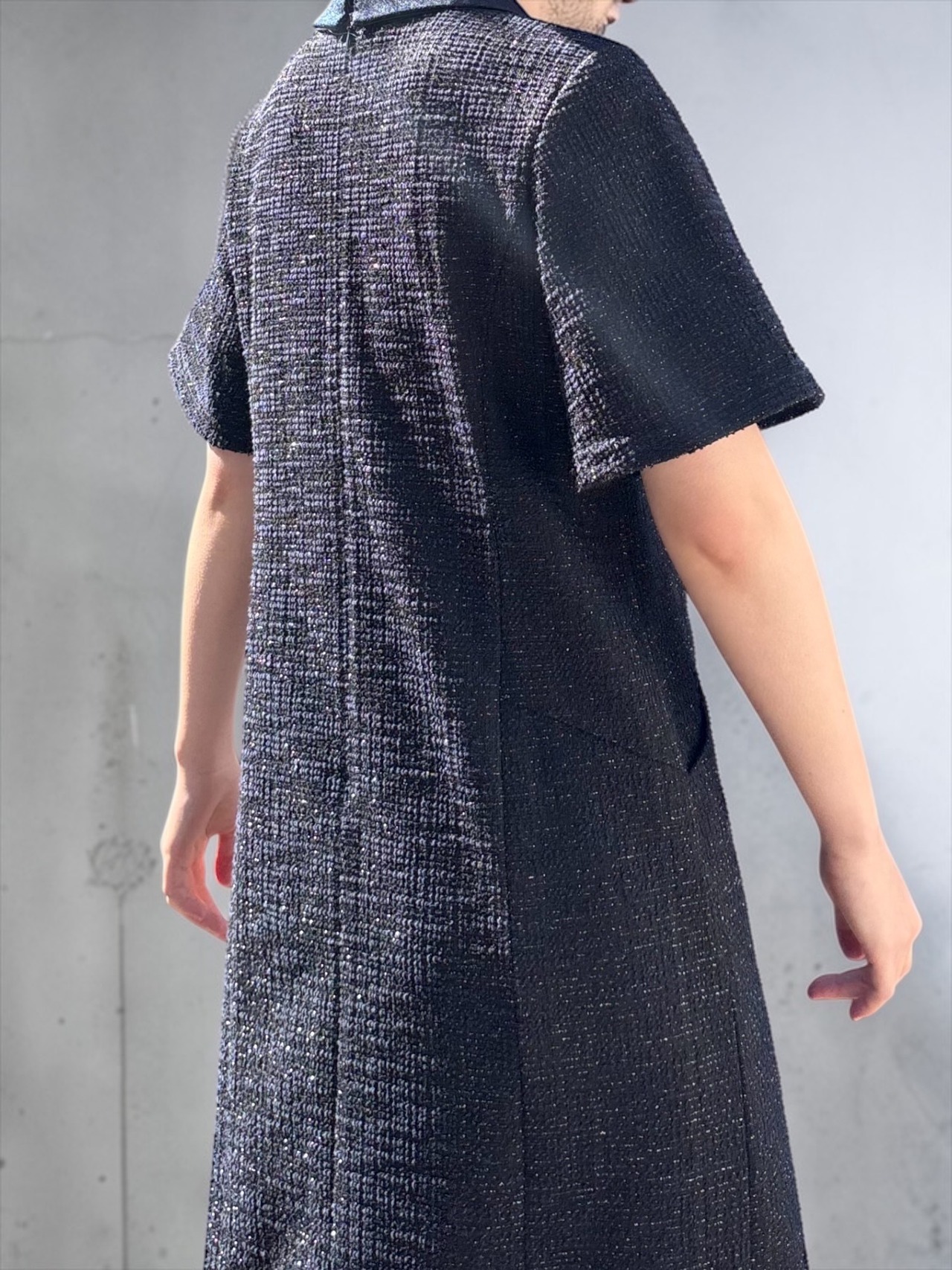 The fabric is a tweed-like cut-and-sew material woven with delicate shimmer, adding quiet elegance and a lightly dressed-up feel. Its rich texture gives the dress depth, making it easy to wear both for everyday outings and for more polished occasions.