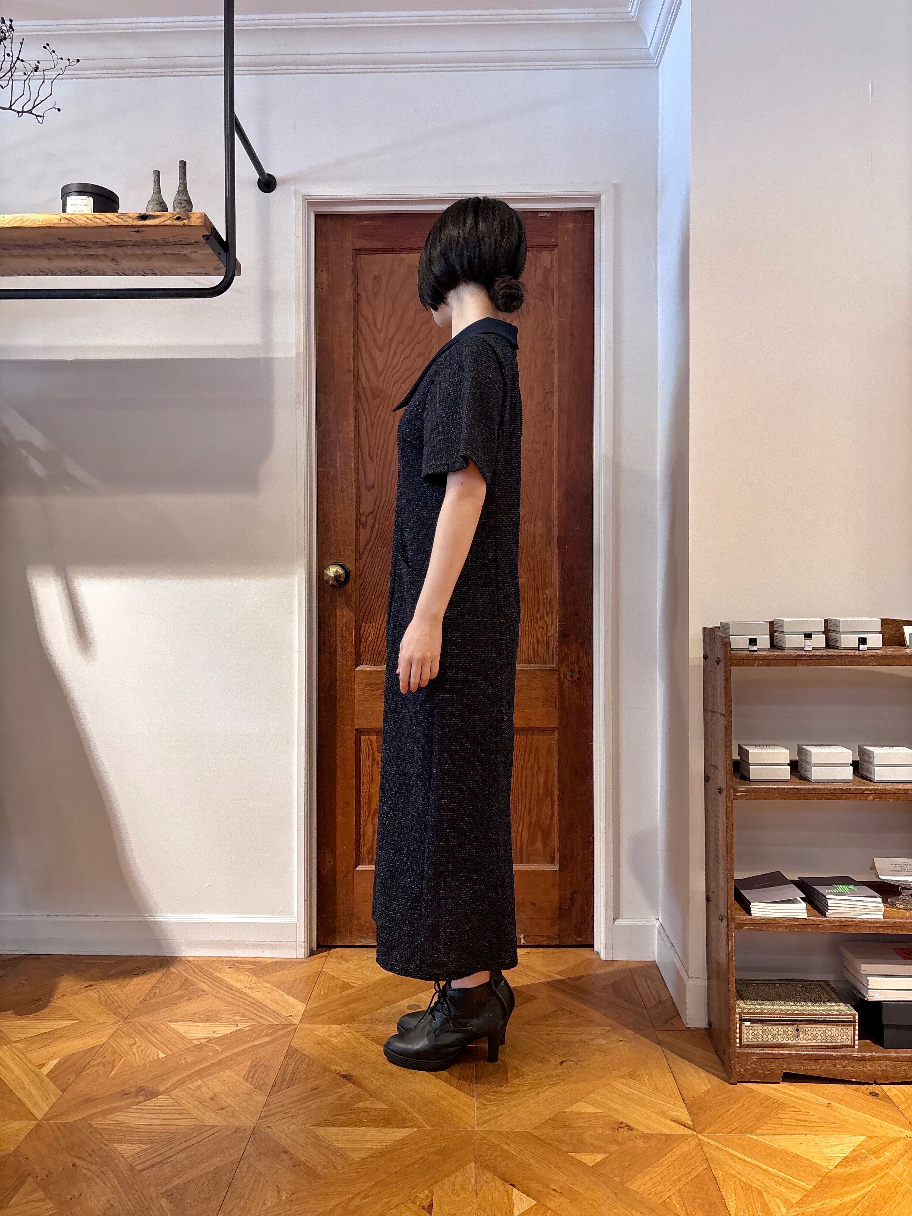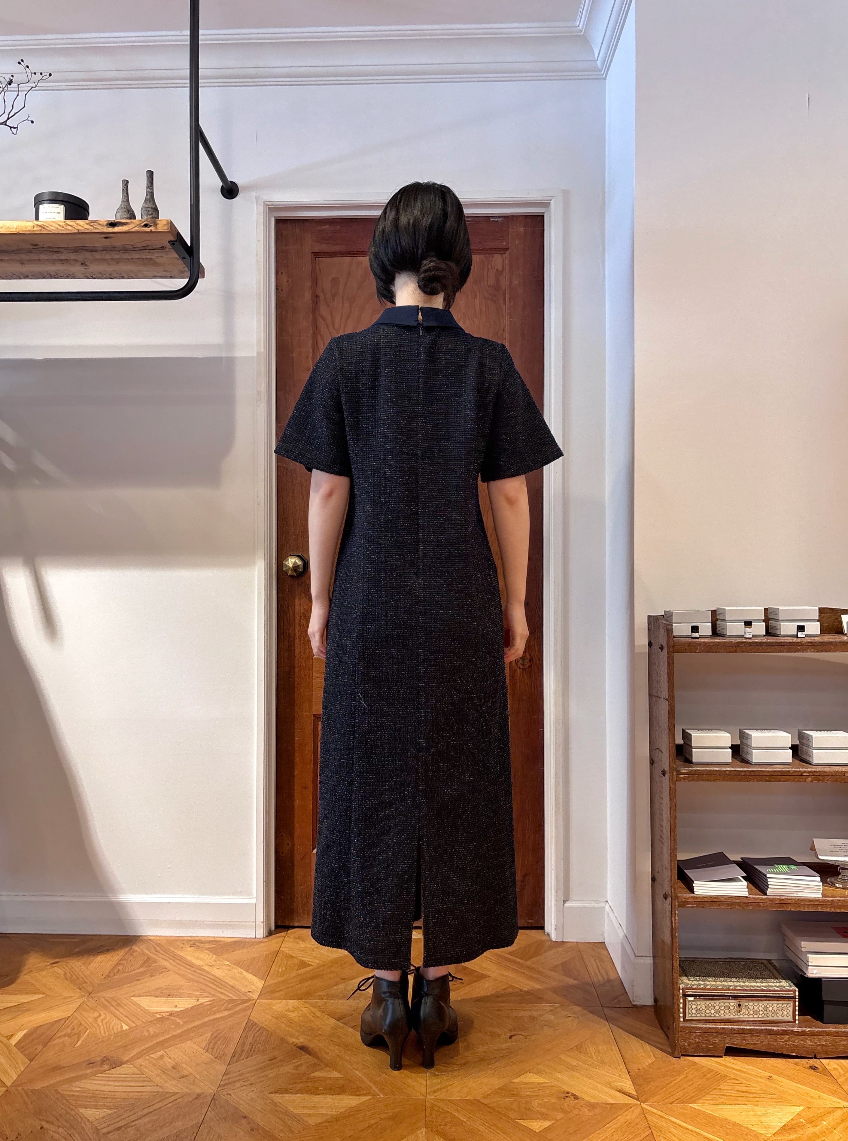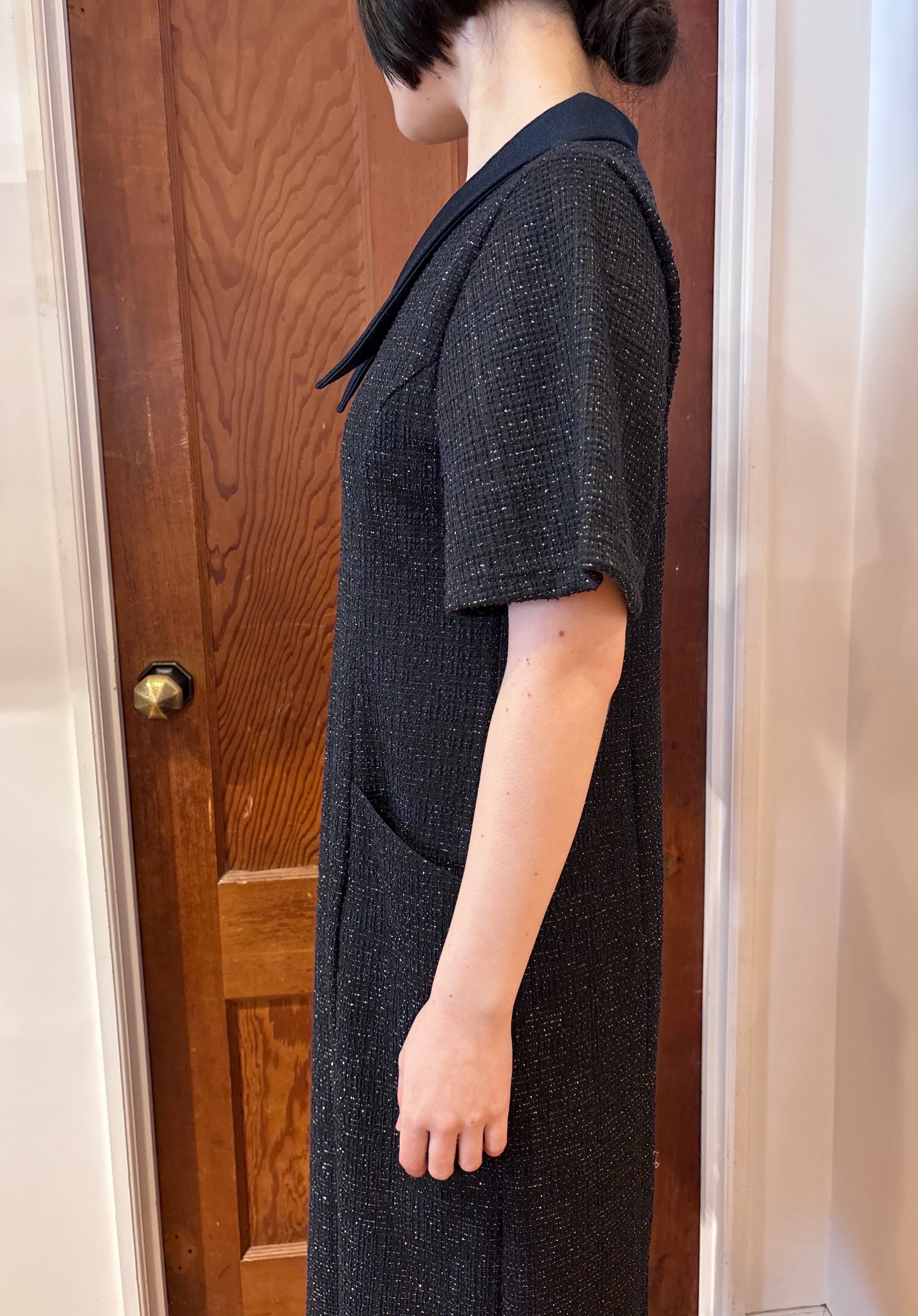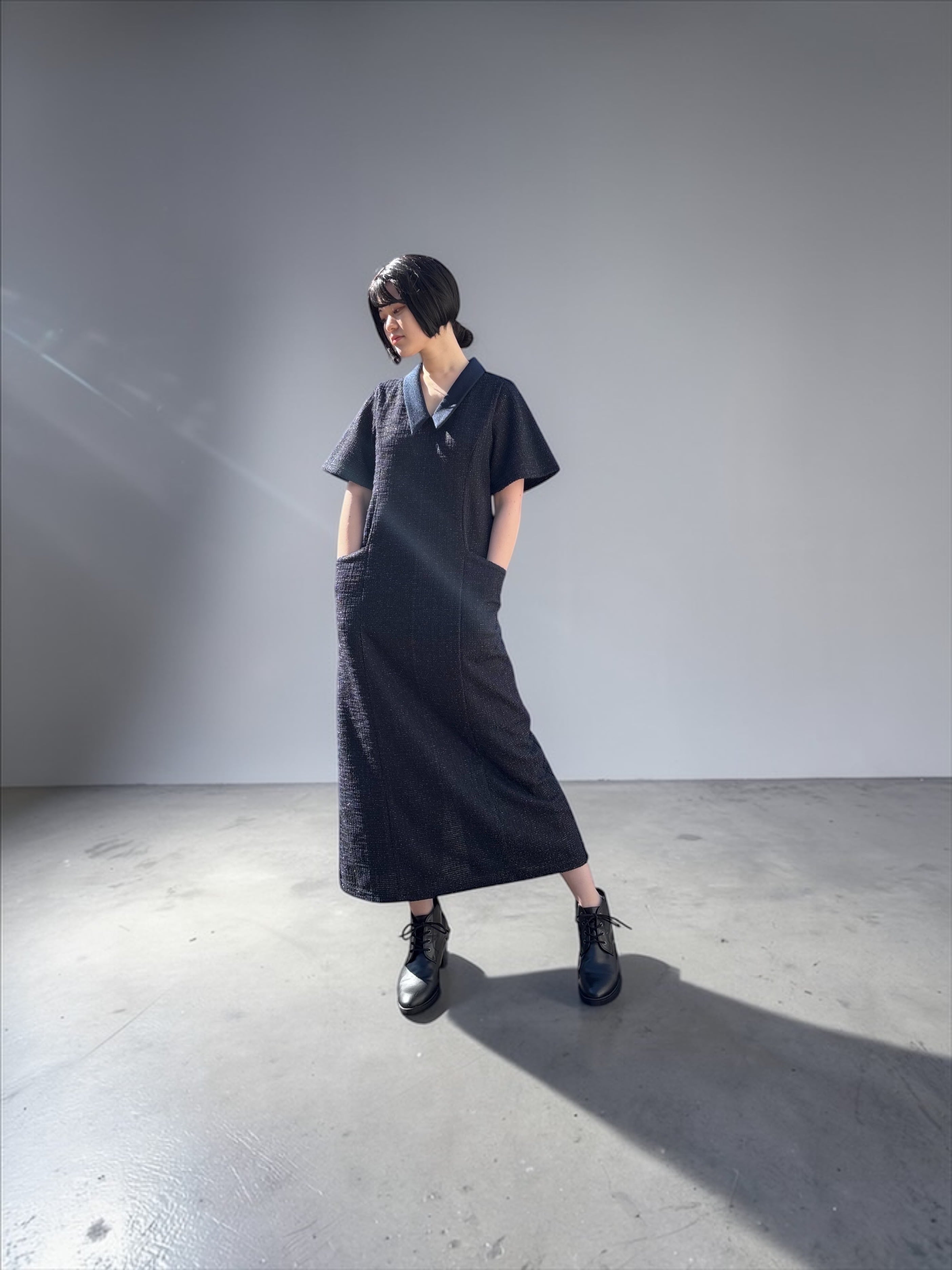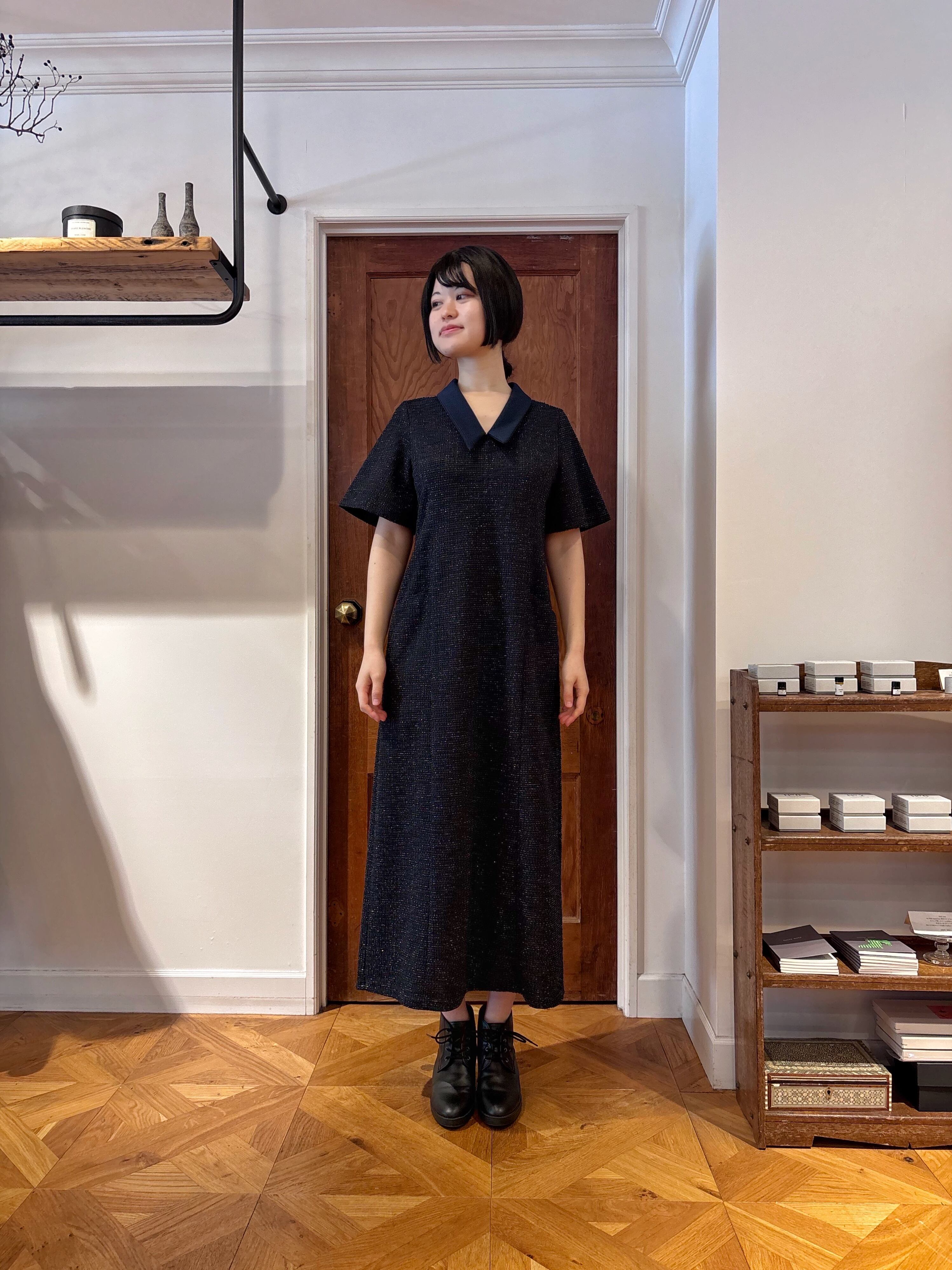 The fabric is a tweed-like cut-and-sew material woven with delicate shimmer, adding quiet elegance and a lightly dressed-up feel. Its rich texture gives the dress depth, making it easy to wear both for everyday outings and for more polished occasions.