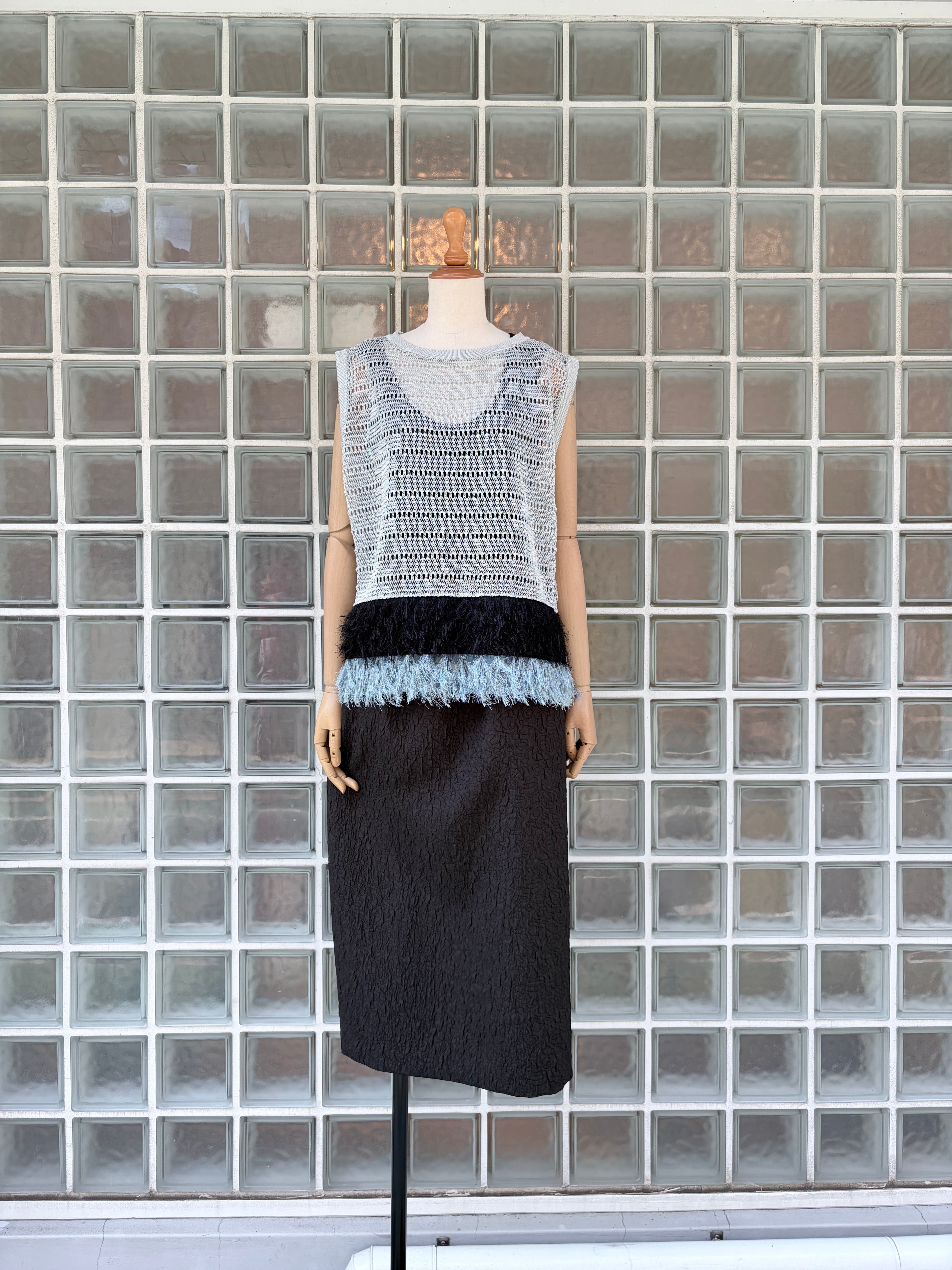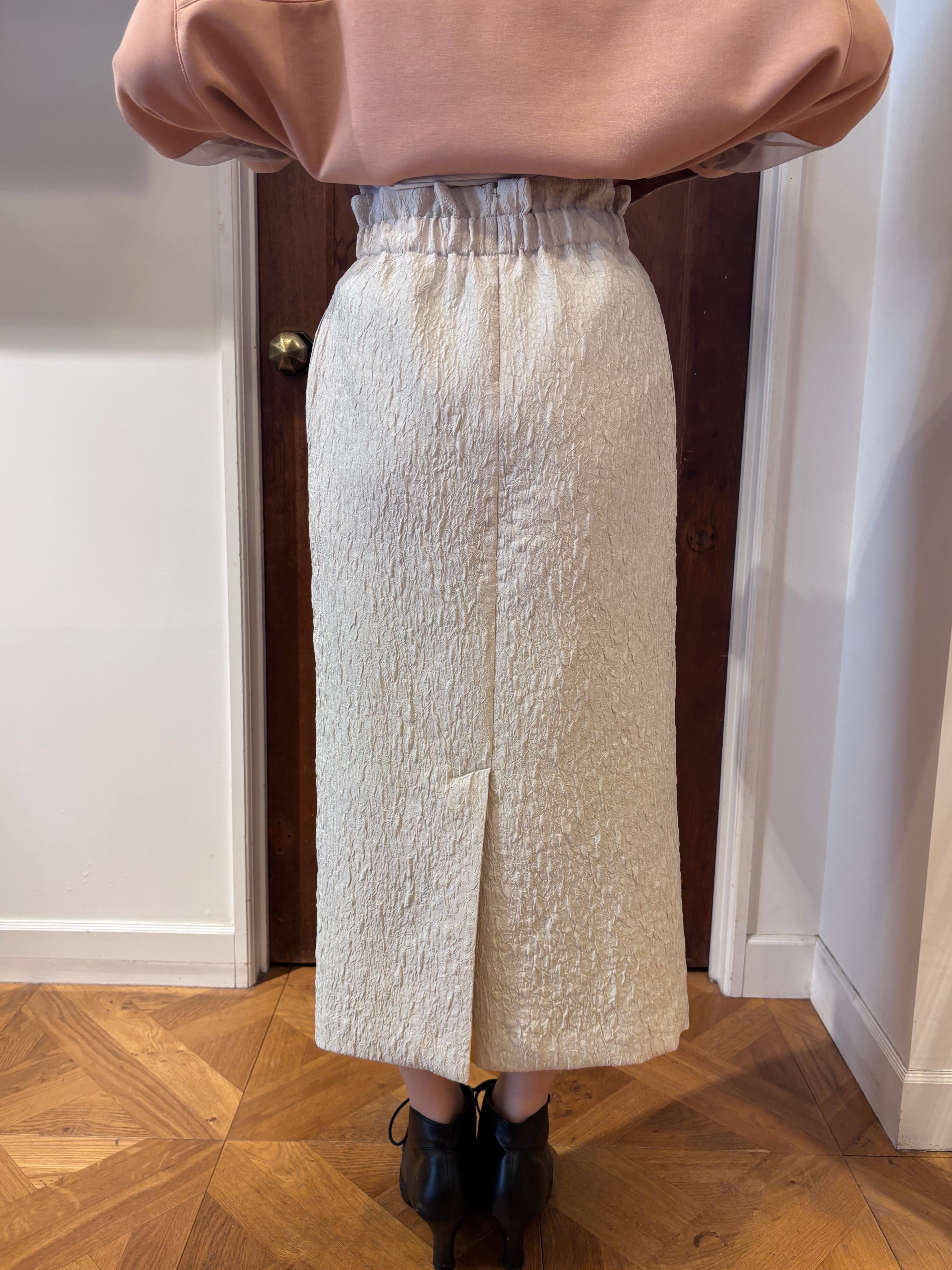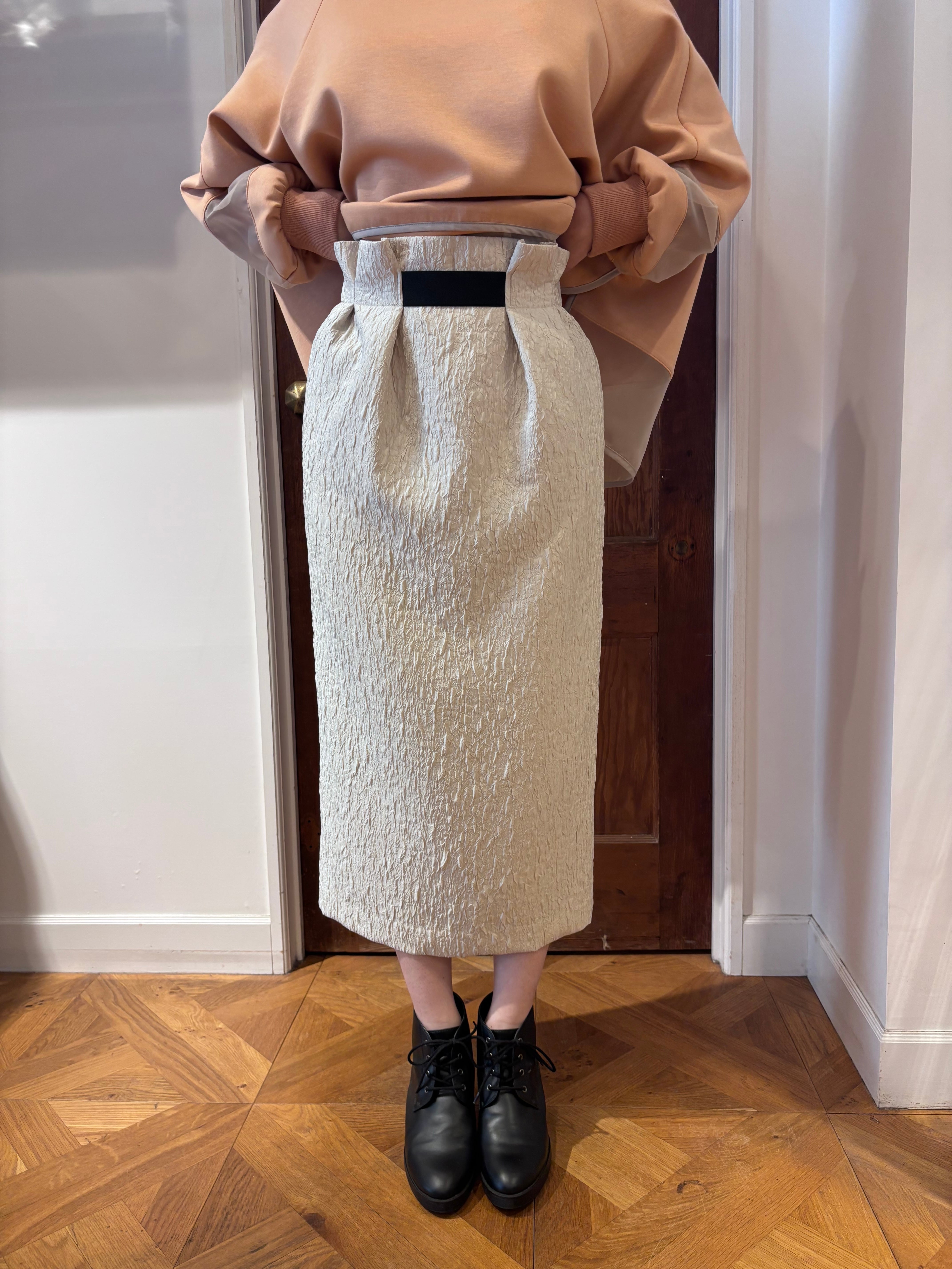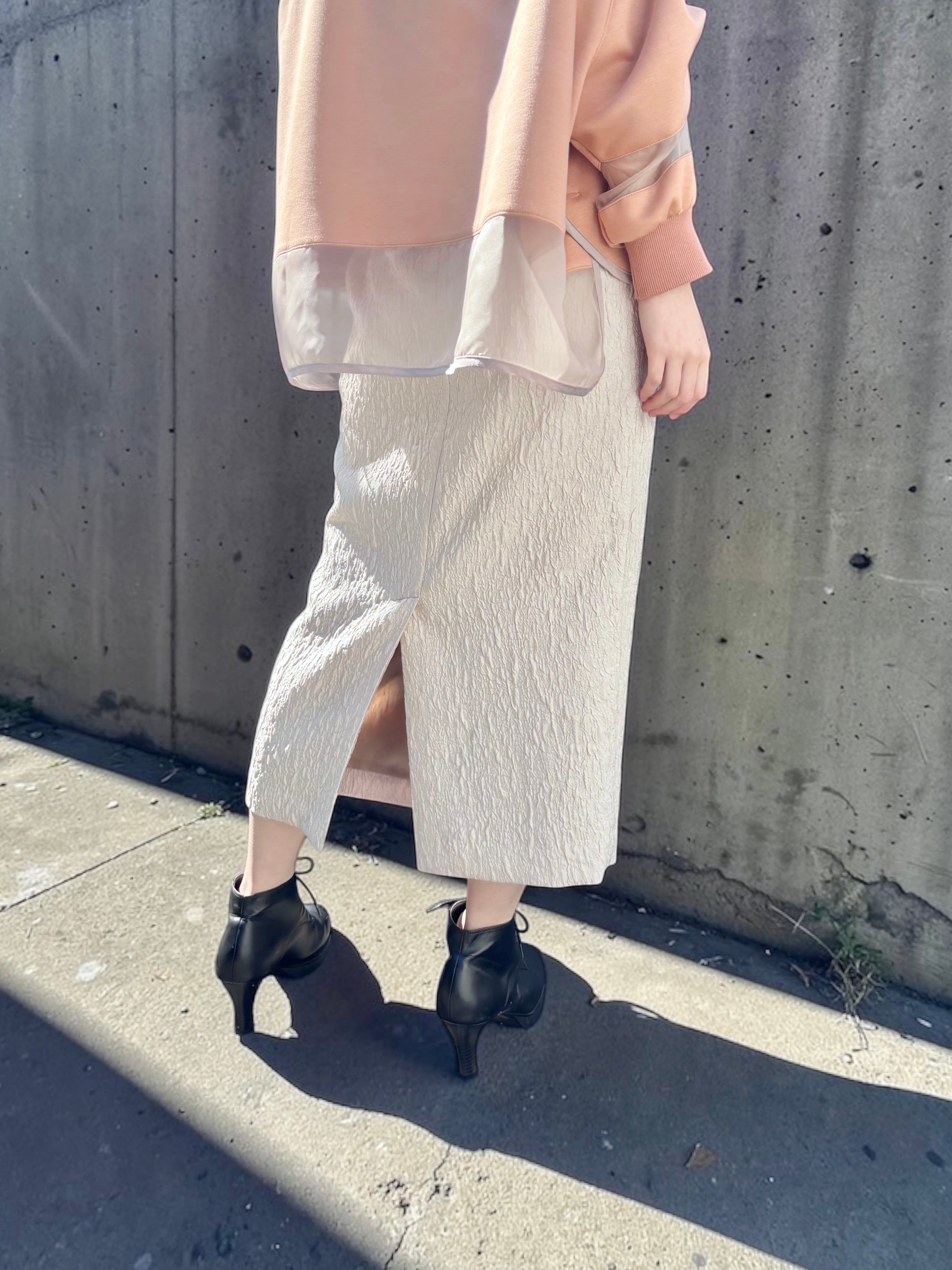 ベーシックになりがちなタイトスカートも、膨れジャカード素材を使うことで、ぐっと奥行きのある表情に。
