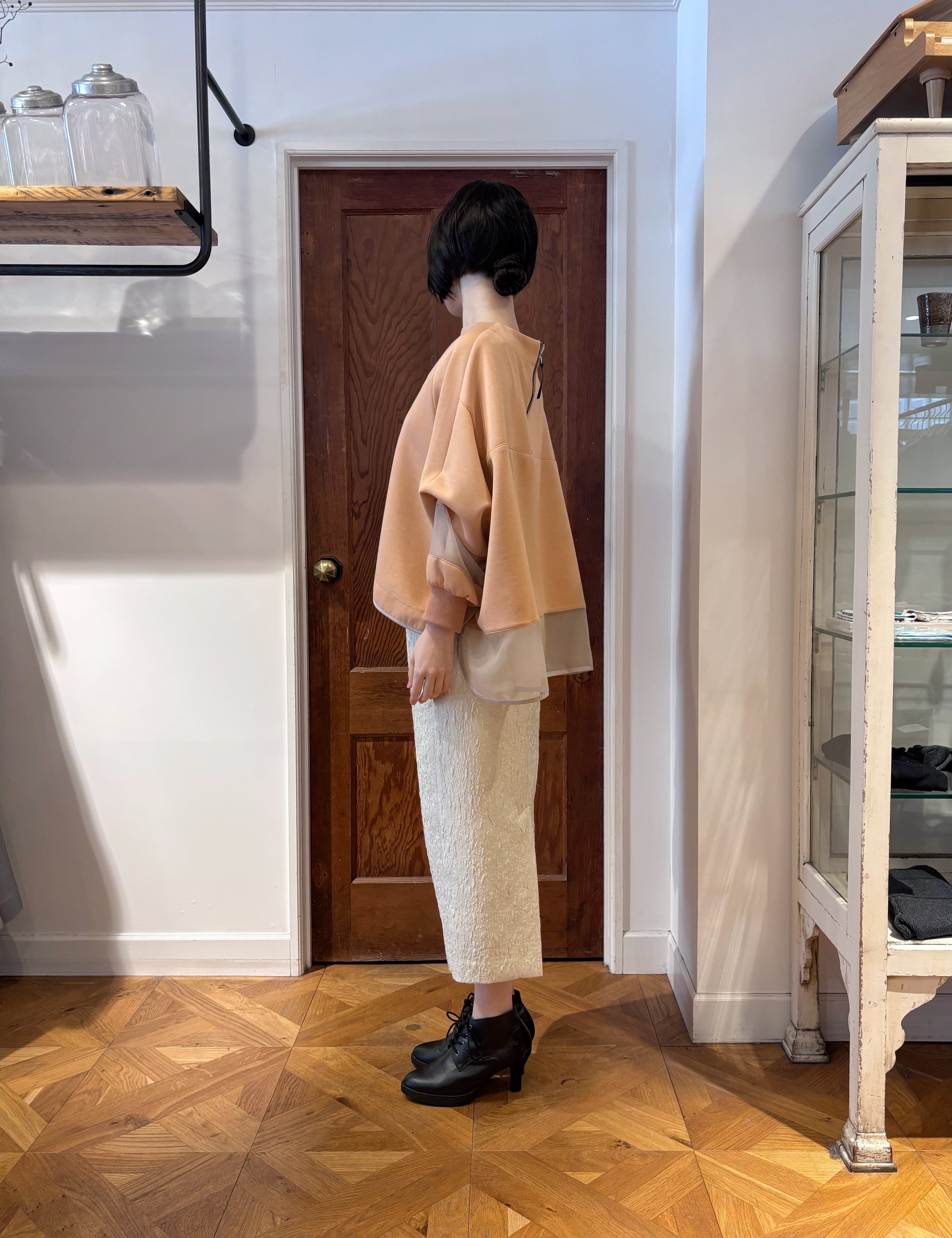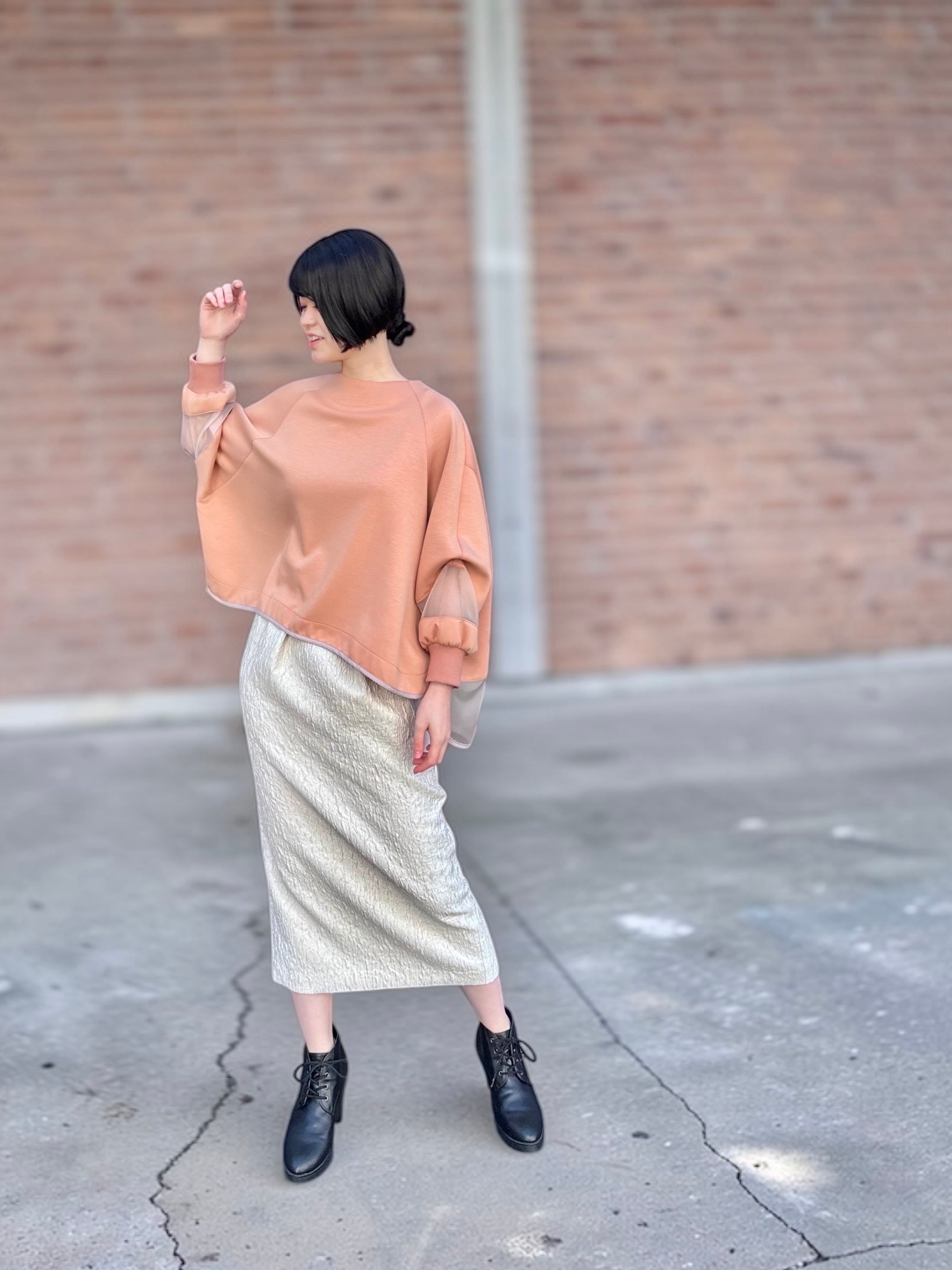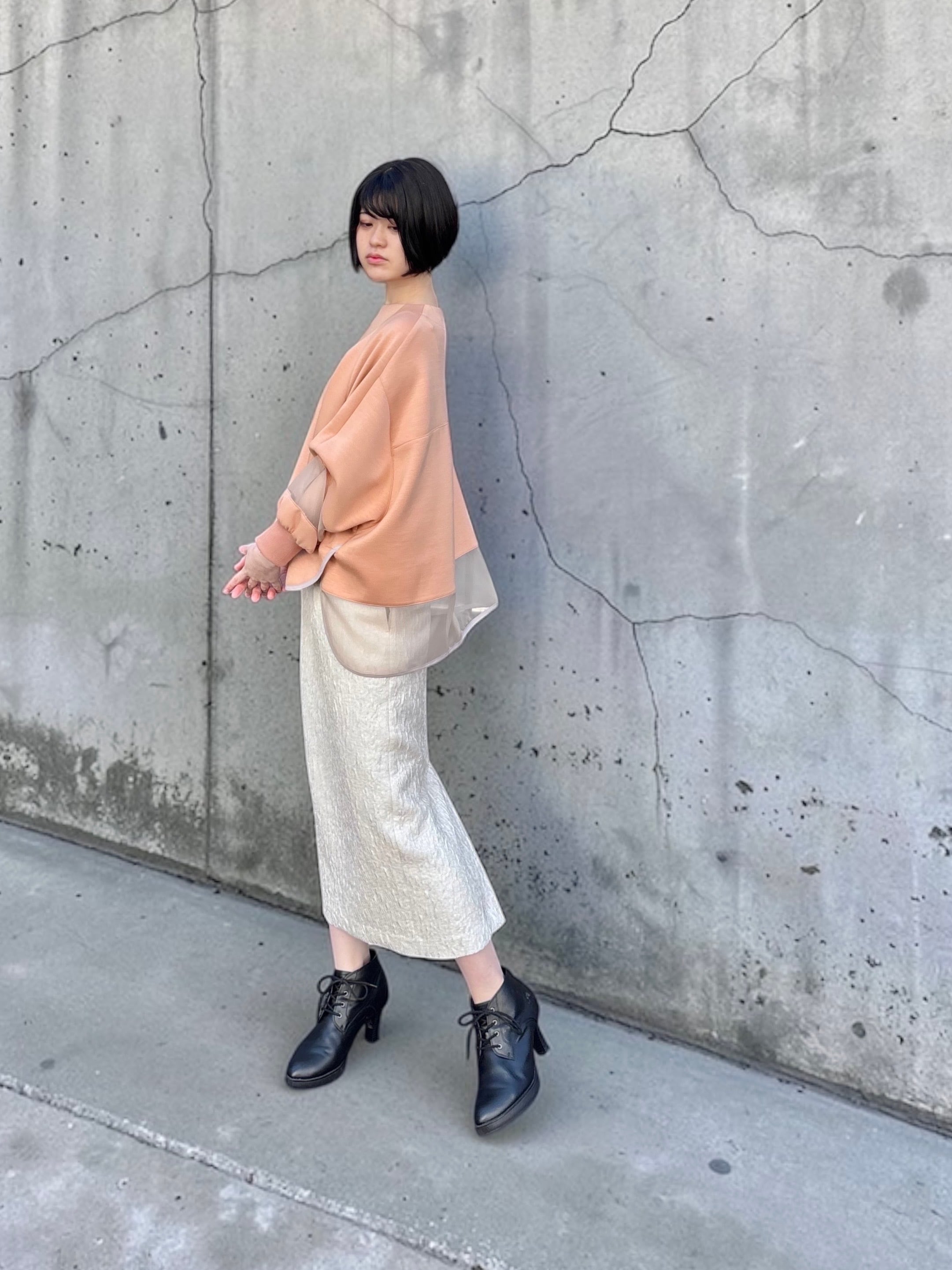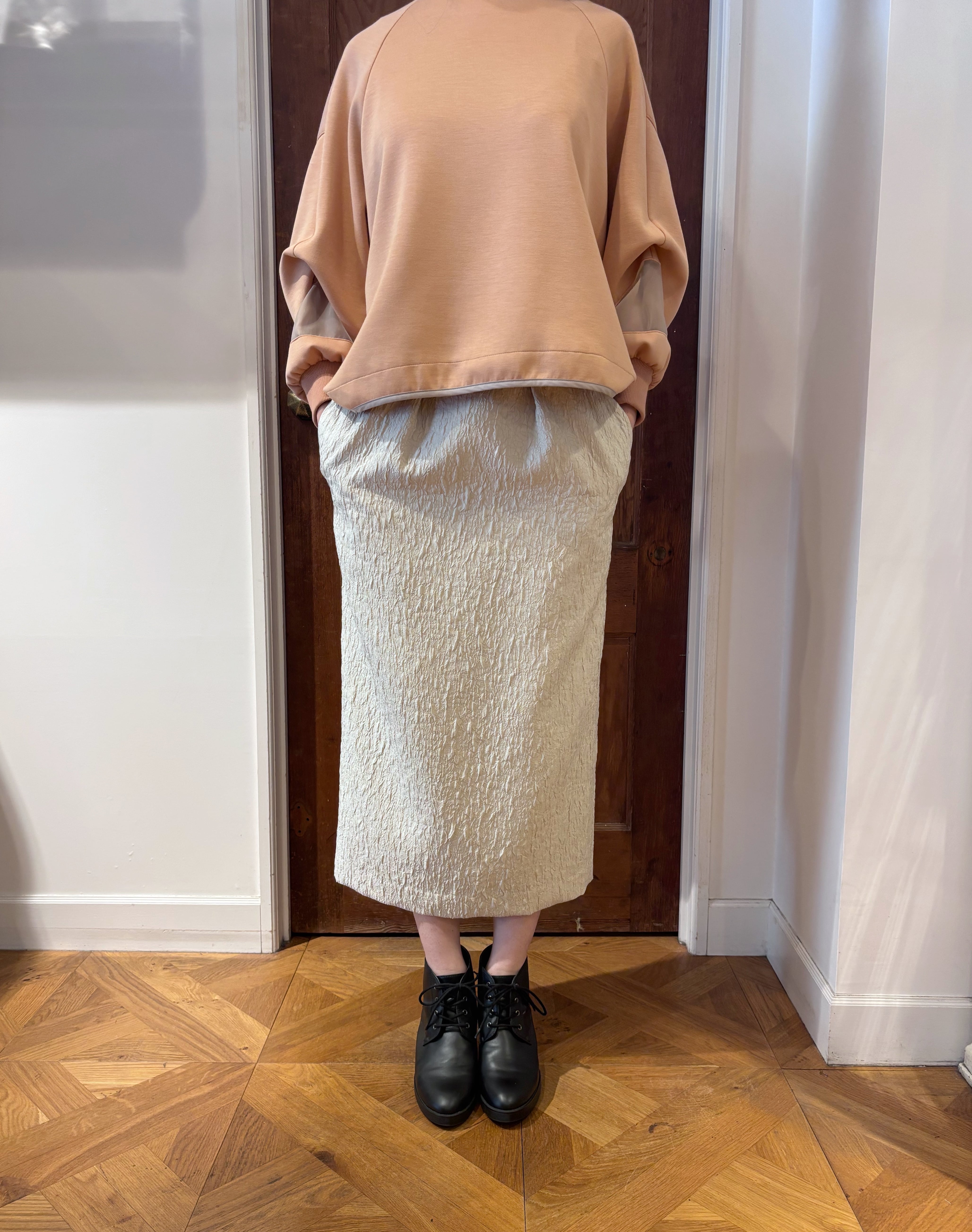 さらに、裾にかけて緩やかに細くなるコクーンシルエットが、タイトスカートならではのすっきり感を保ちながら、やわらかく女性らしいバランスを演出してくれます。