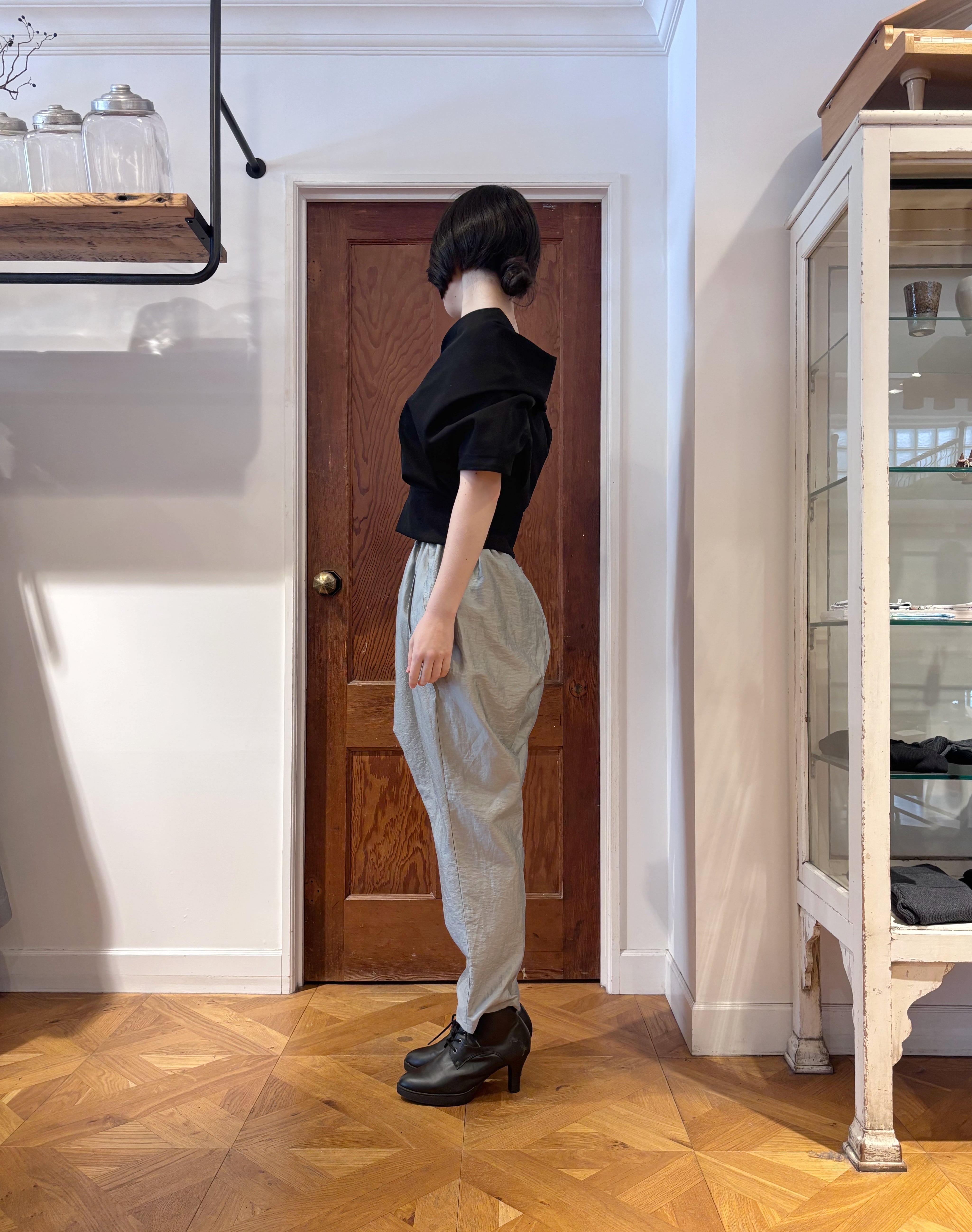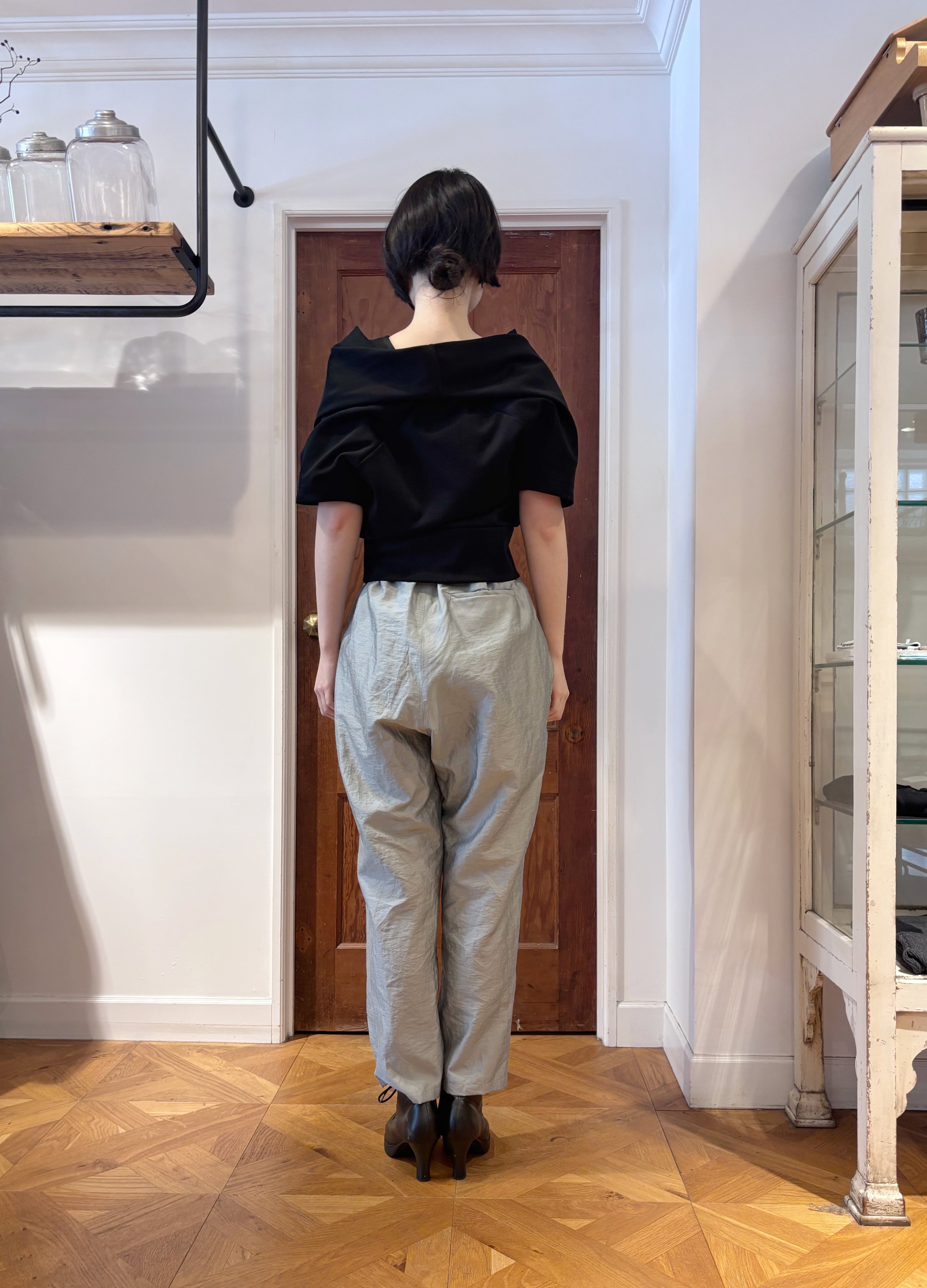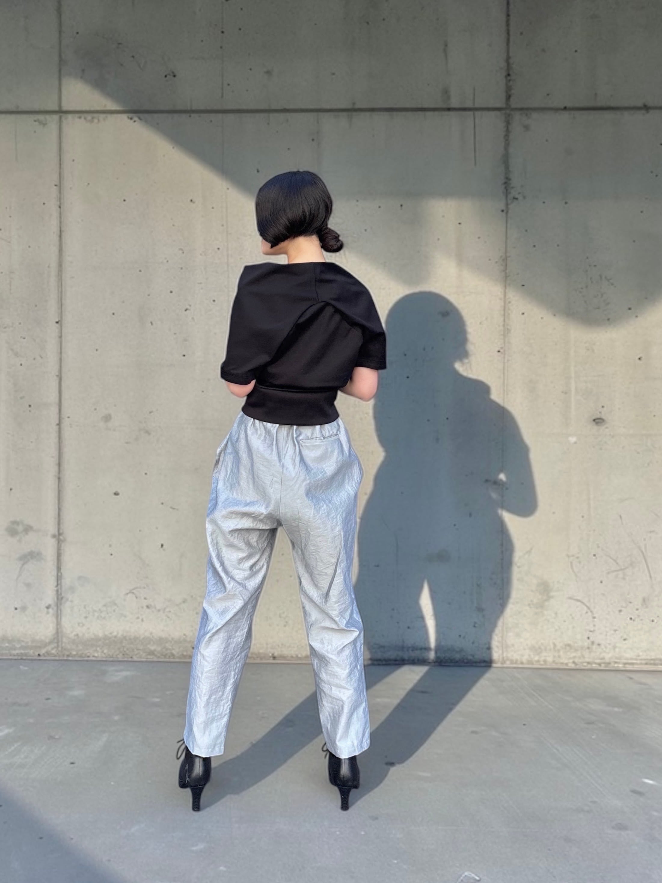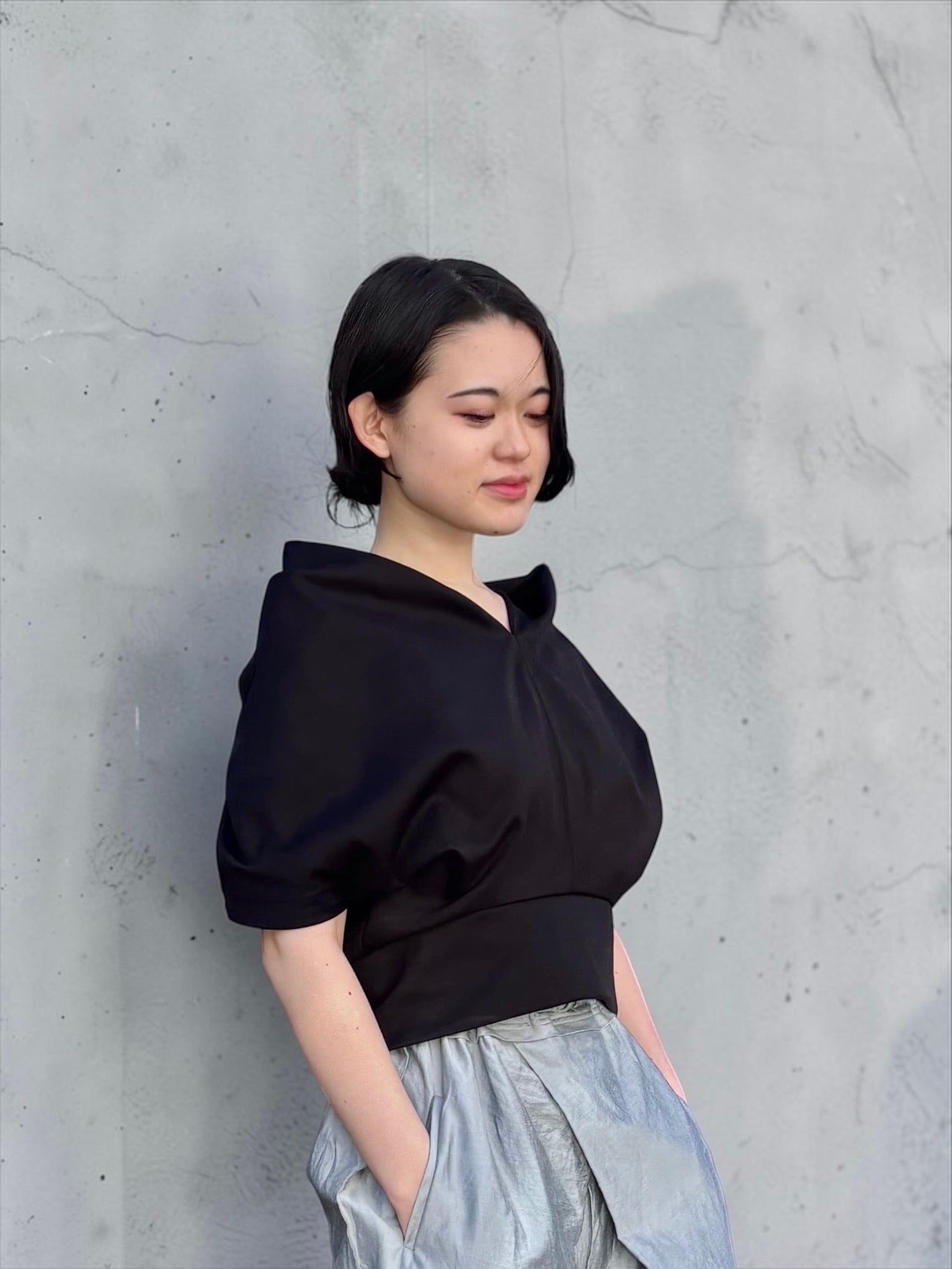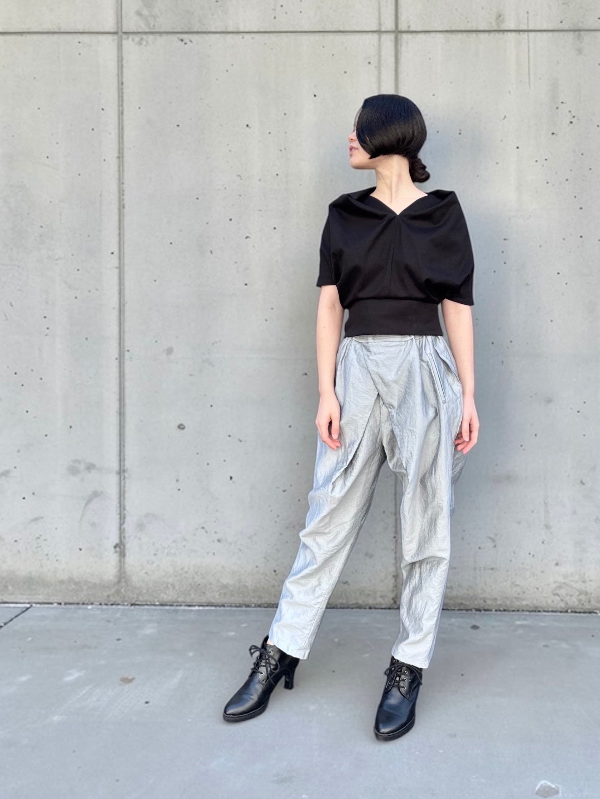 視線を惹きつけるのは、折り重なるように立体を描くネックラインと、肩まわりに生まれる彫刻的なフォルム。服の面白さと美しさを、改めて実感させてくれる一枚です。