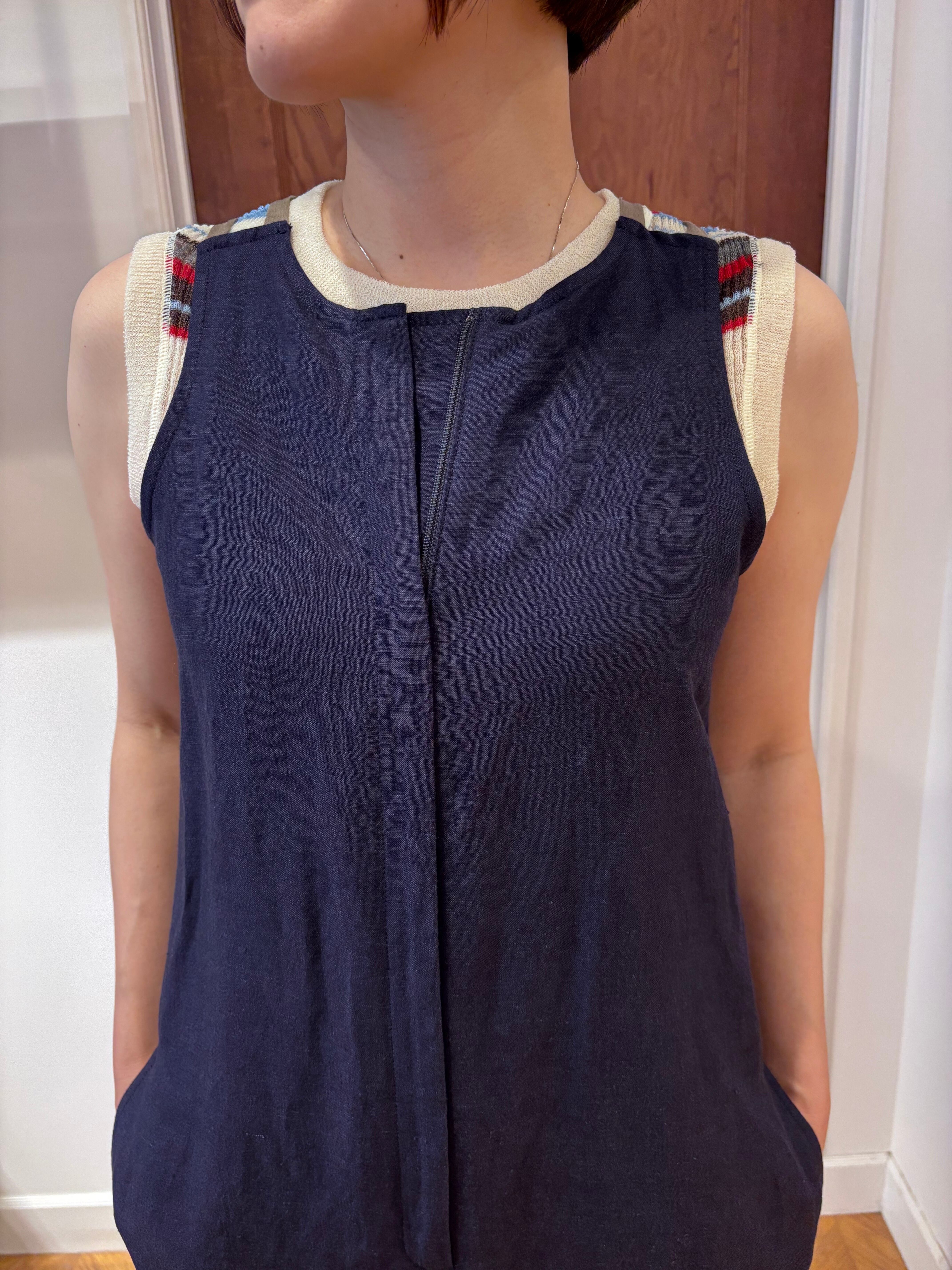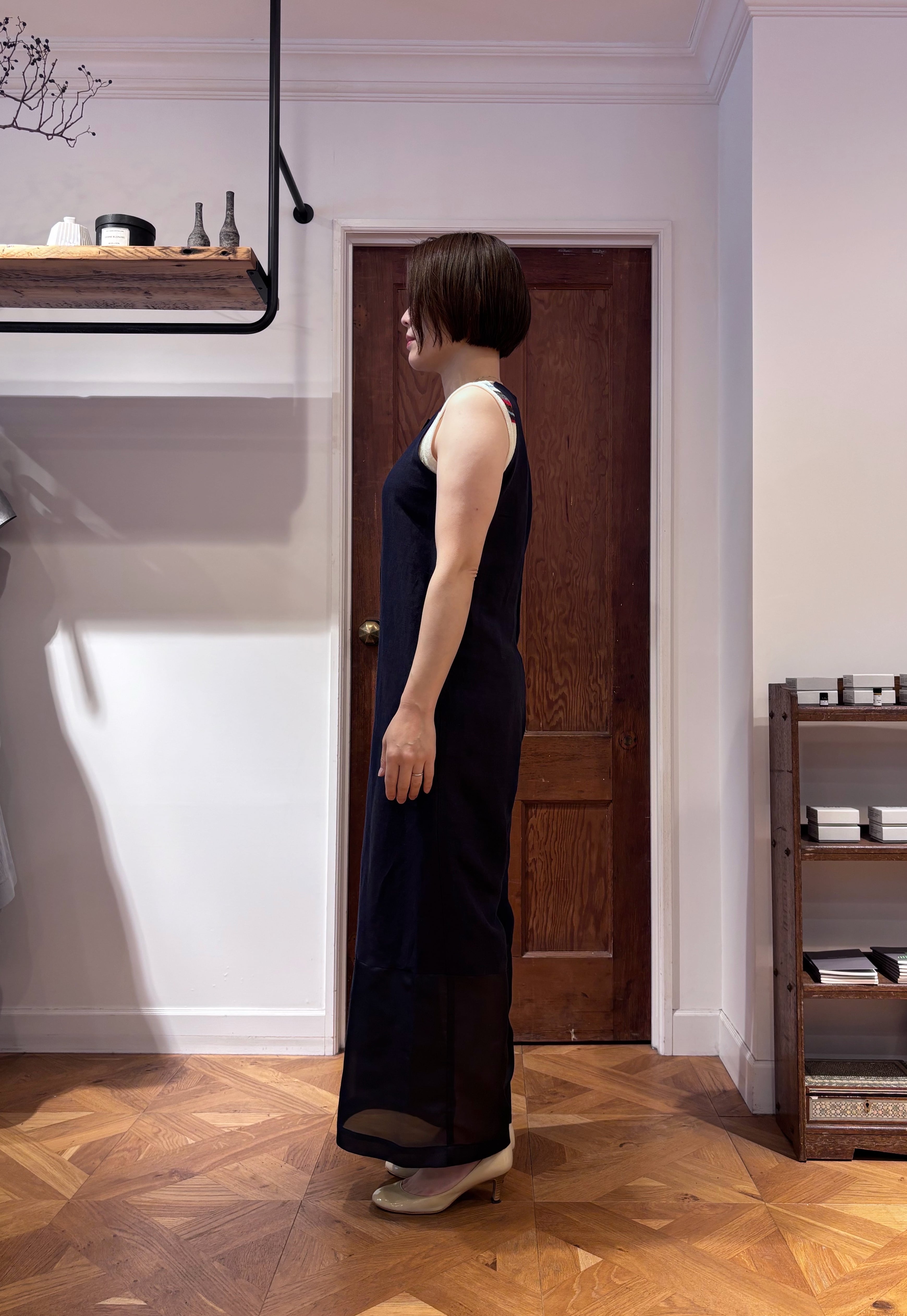 Its rich aubergine-navy shade is beautifully refined, while the slender tape detail at the shoulders and the sheer contrast fabric at the hem add just the right amount of character. The design itself remains minimal, but these subtle accents give it a distinctly sophisticated presence.