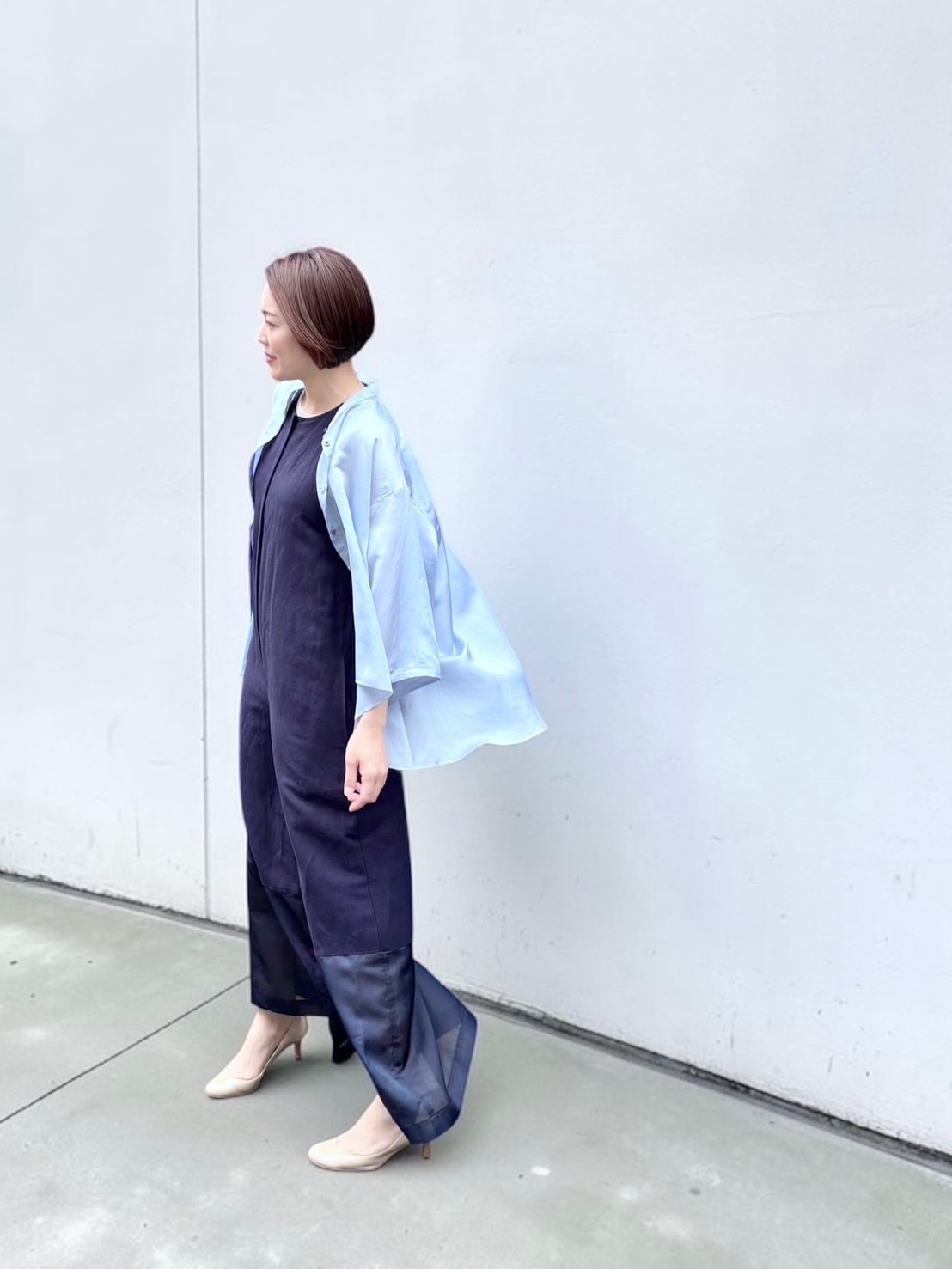 スニーカーでラフに崩すより、シアー感のあるブラウスやロングカーディガン、あるいはボックスシルエットのジャケットを重ねて。足元はヒールや艶のあるシューズでまとめると、余裕のある大人の女性らしいバランスに仕上がります。