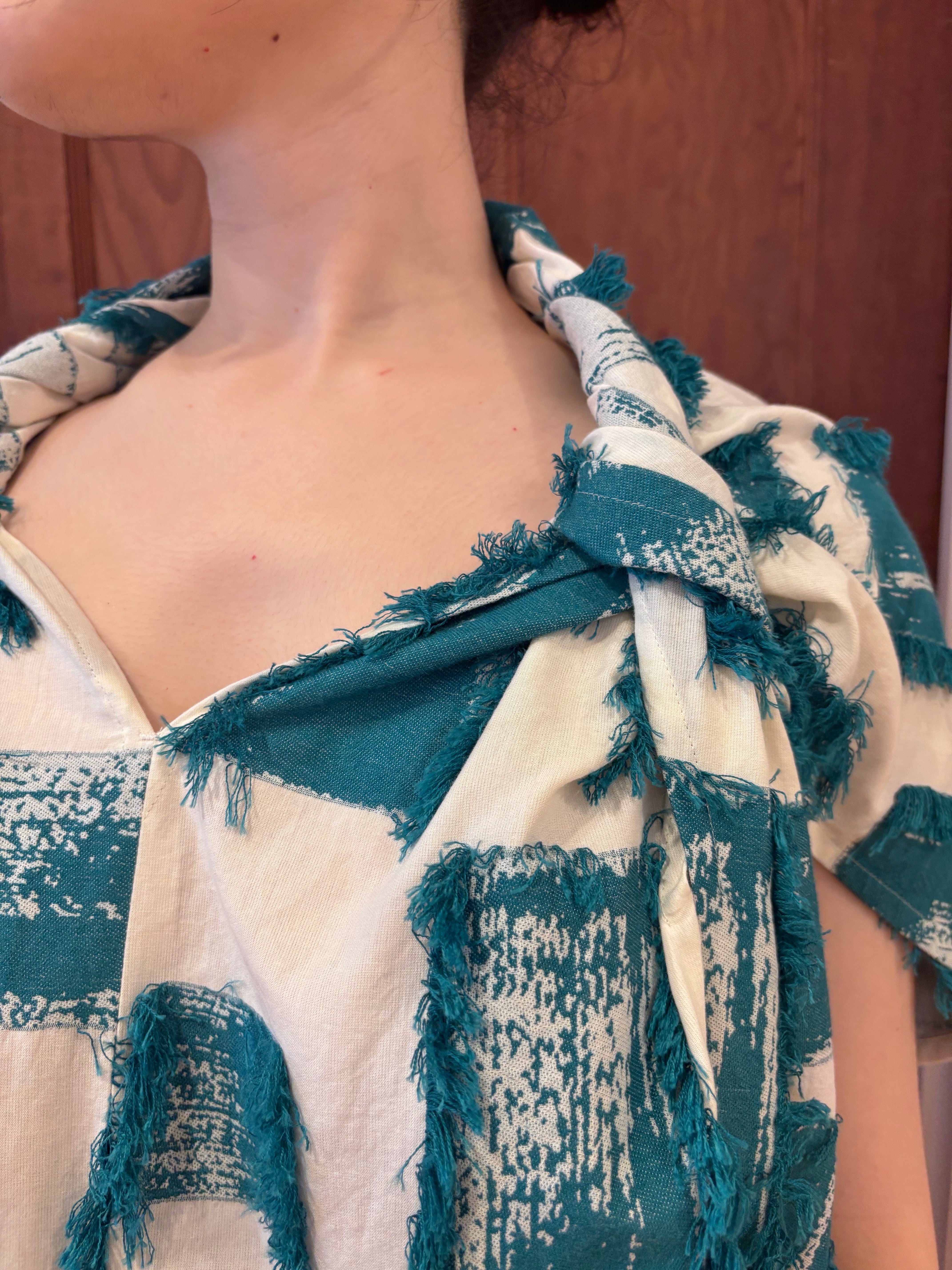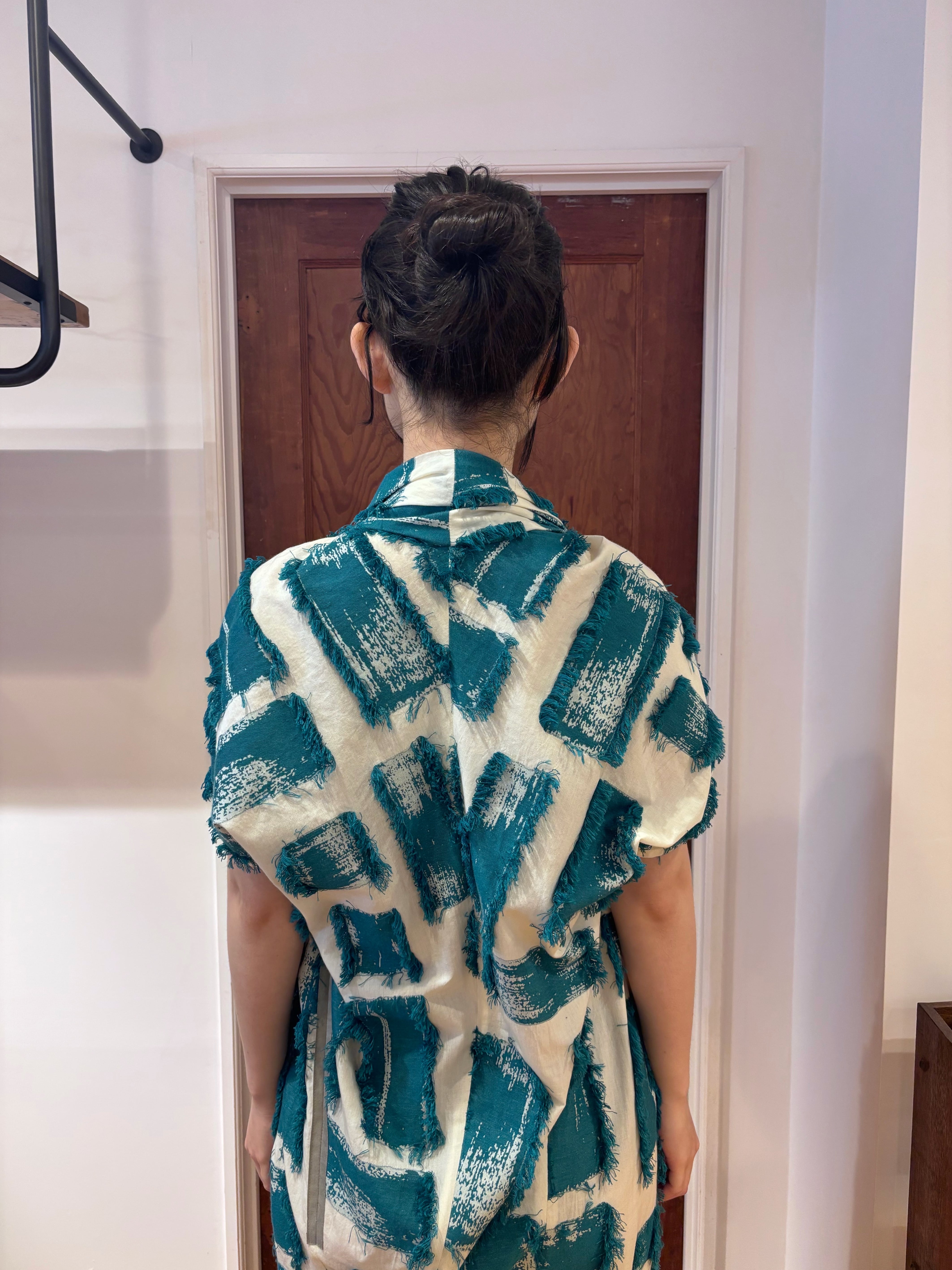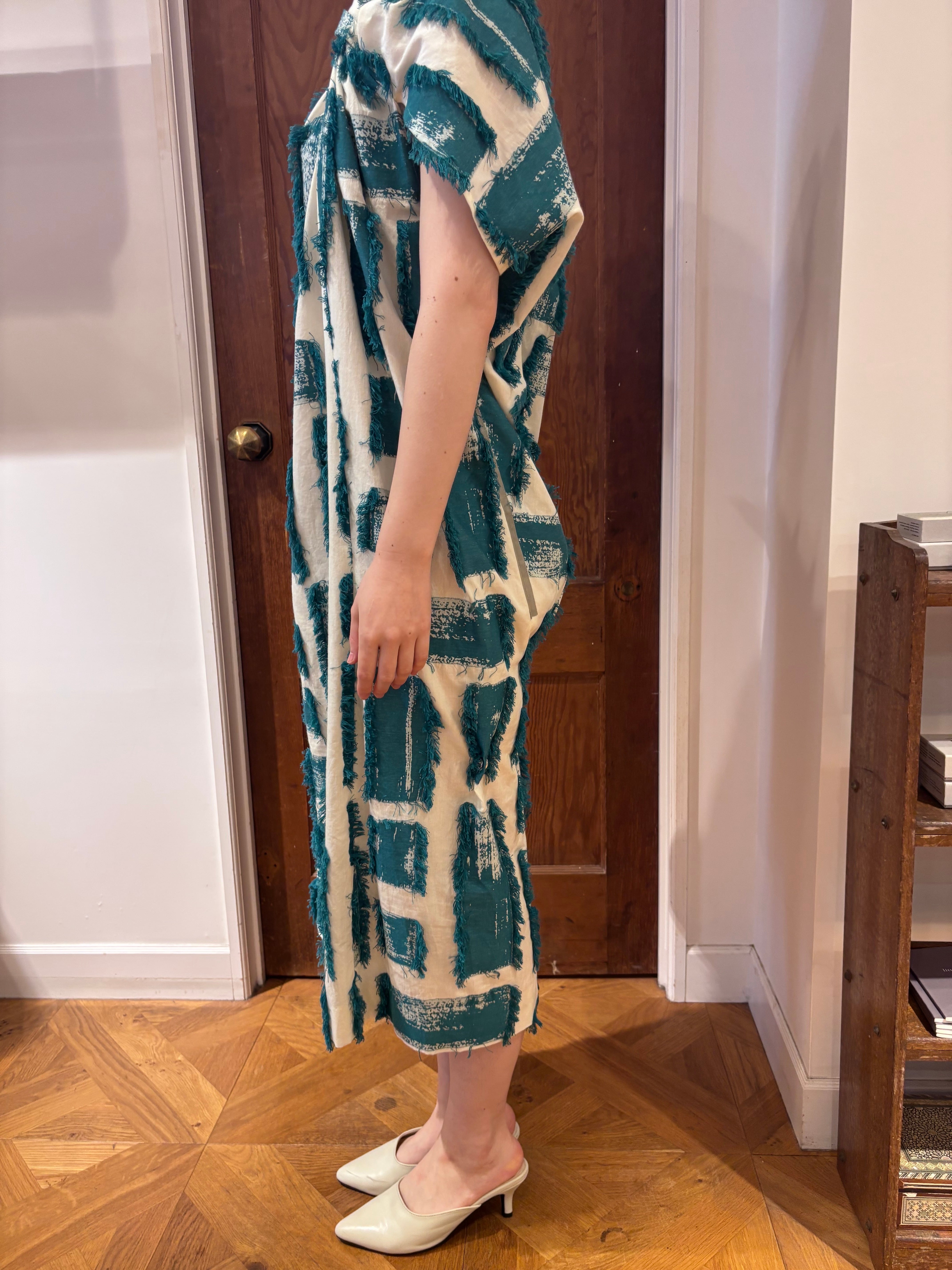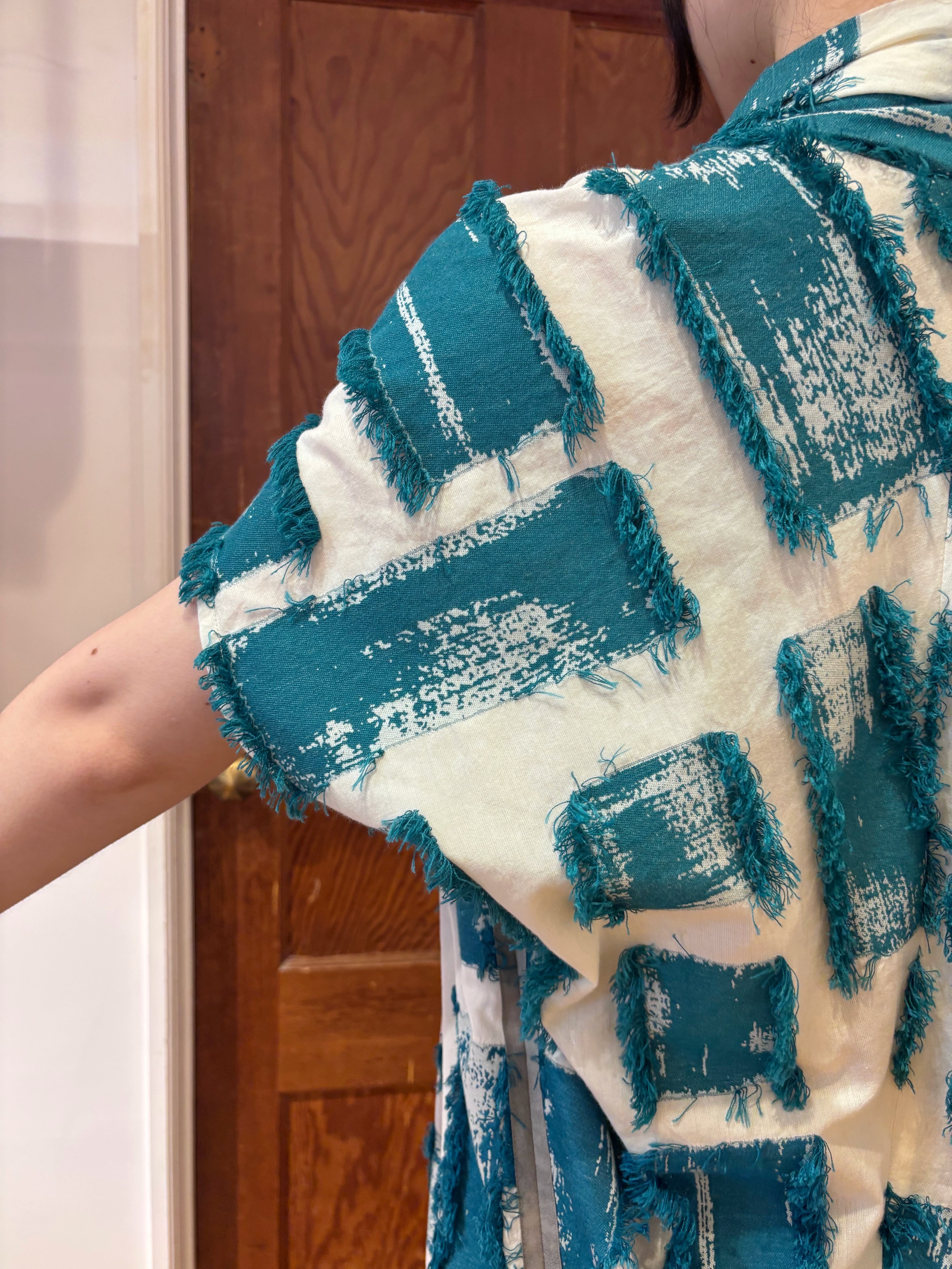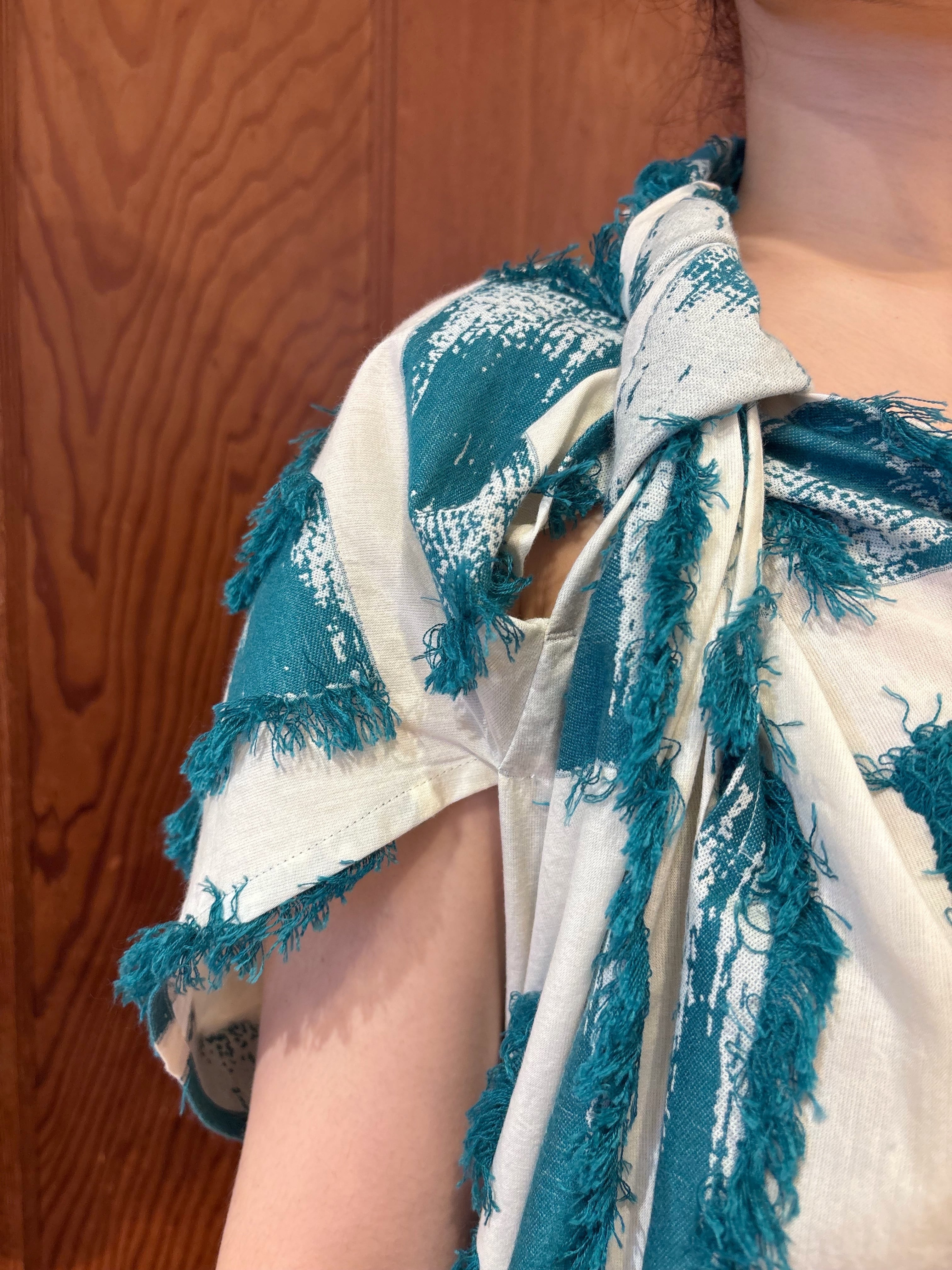 真っ白なコットン地に、ターコイズグリーンのフリンジを重ねた、涼やかで印象的な一枚。