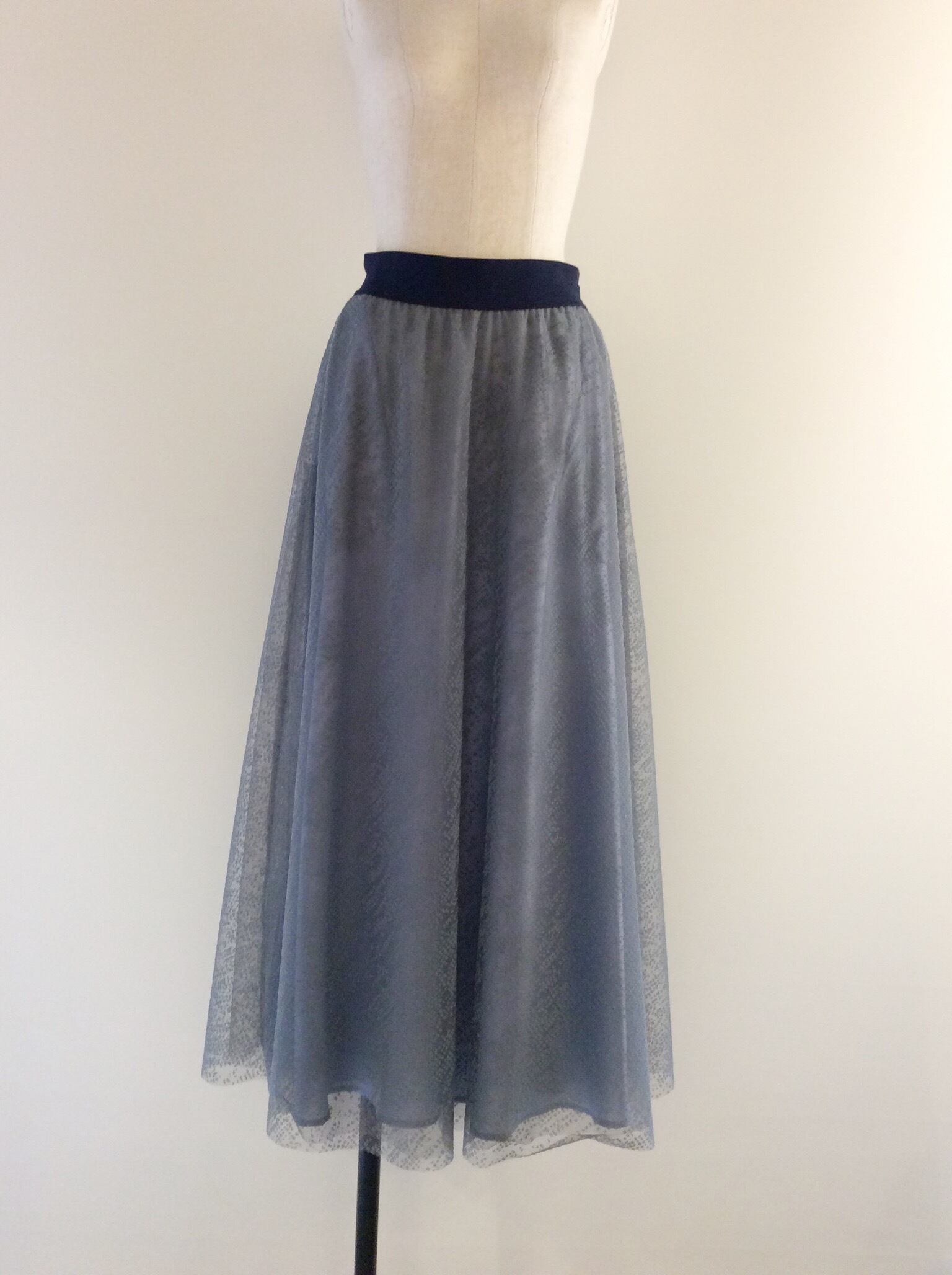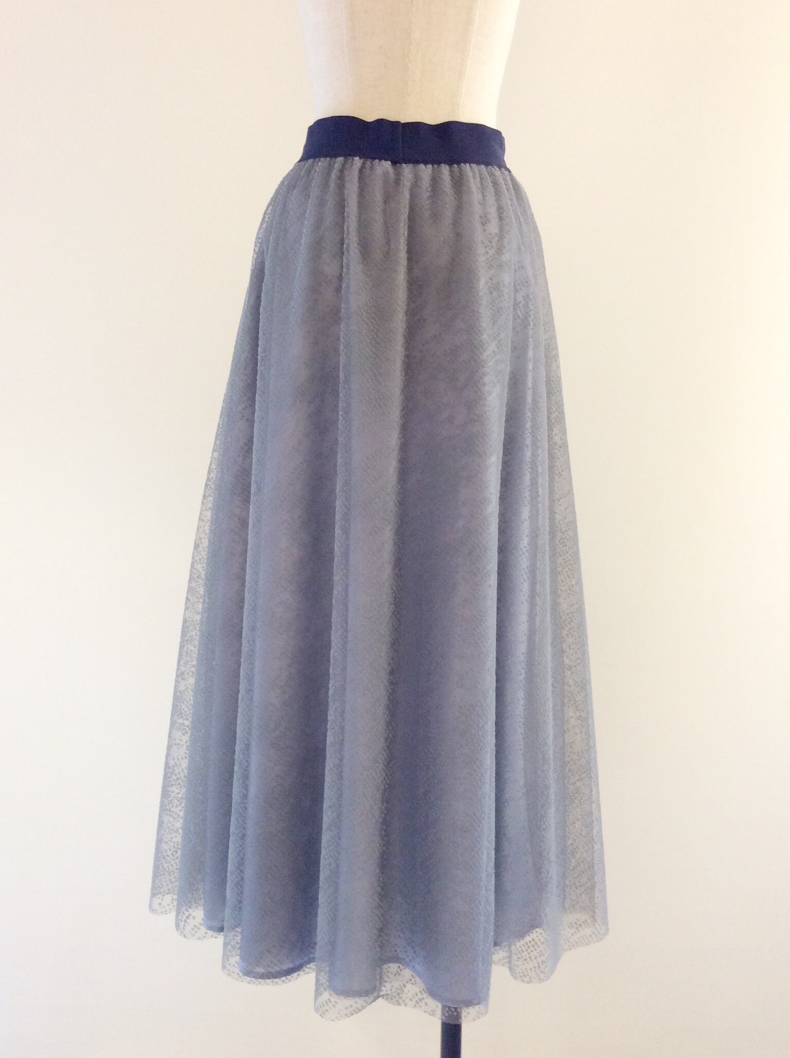 <Colour>グレーブルーのチュール素材に、凸凹のベルベット生地を吹き付け、更に水色の裏地の3重構造になっています。陰影があり立体感もあります。