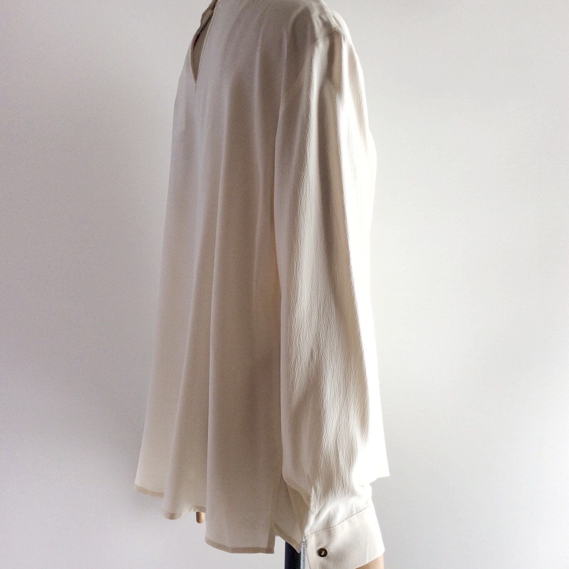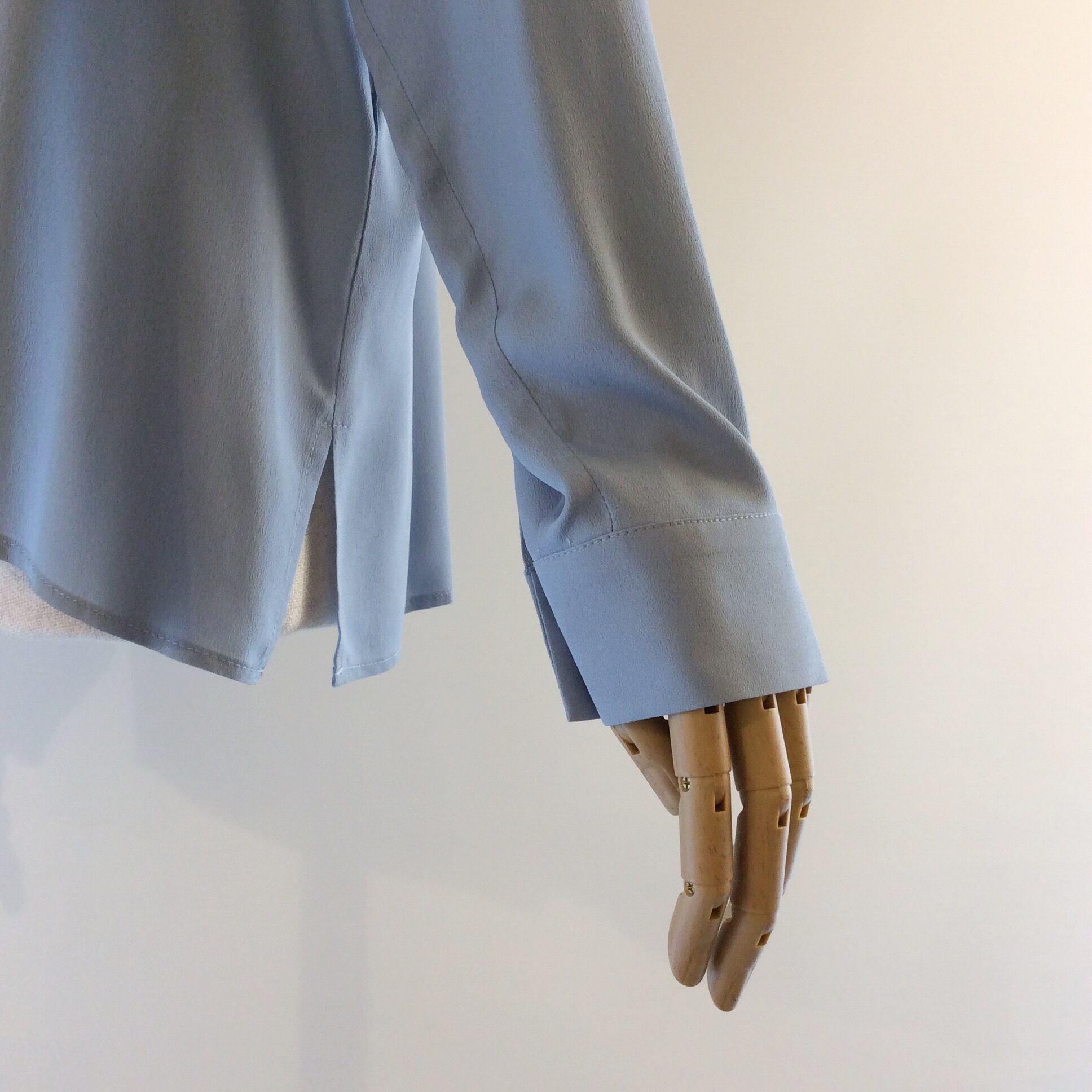シャツ・インや羽織りモノの下を綺麗に演出してくれます。貝ボタン使いや、シルクの含有量が多いことからくる上品な光沢もブラウスの見え方を高めてくれます。