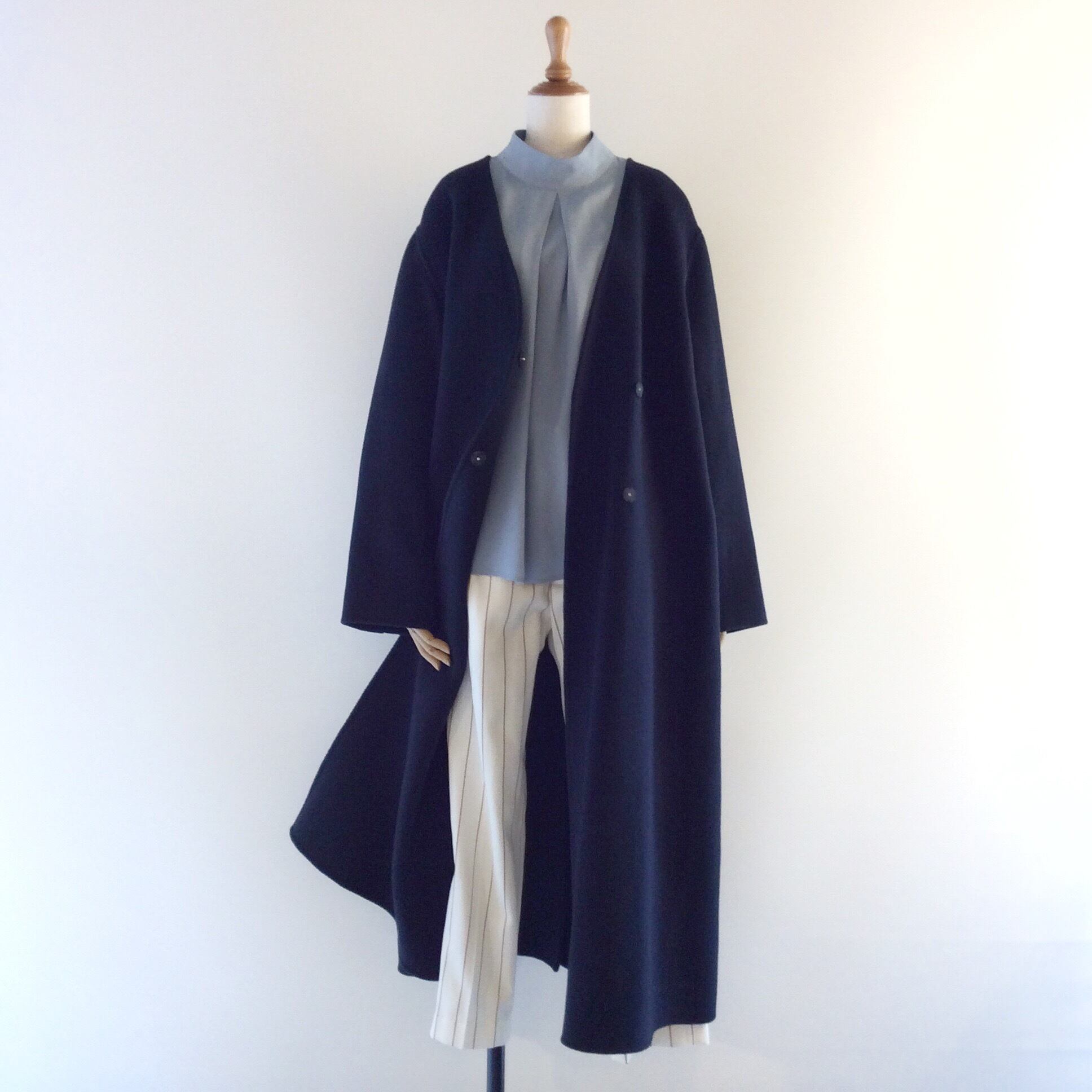 <Design Detail>程よい高さのスタンドカラーと前で割れたデザイン。