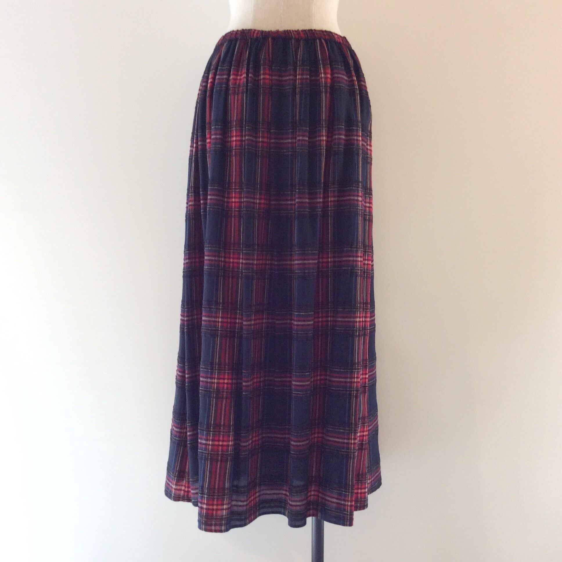 横チェックのラインの一部に、別の糸を使って織ることによって生地に凹凸の表情が出ています。シワにならず、そんなに重めの色合いでは無いので春先にも着れる、シーズンの長いスカートです。