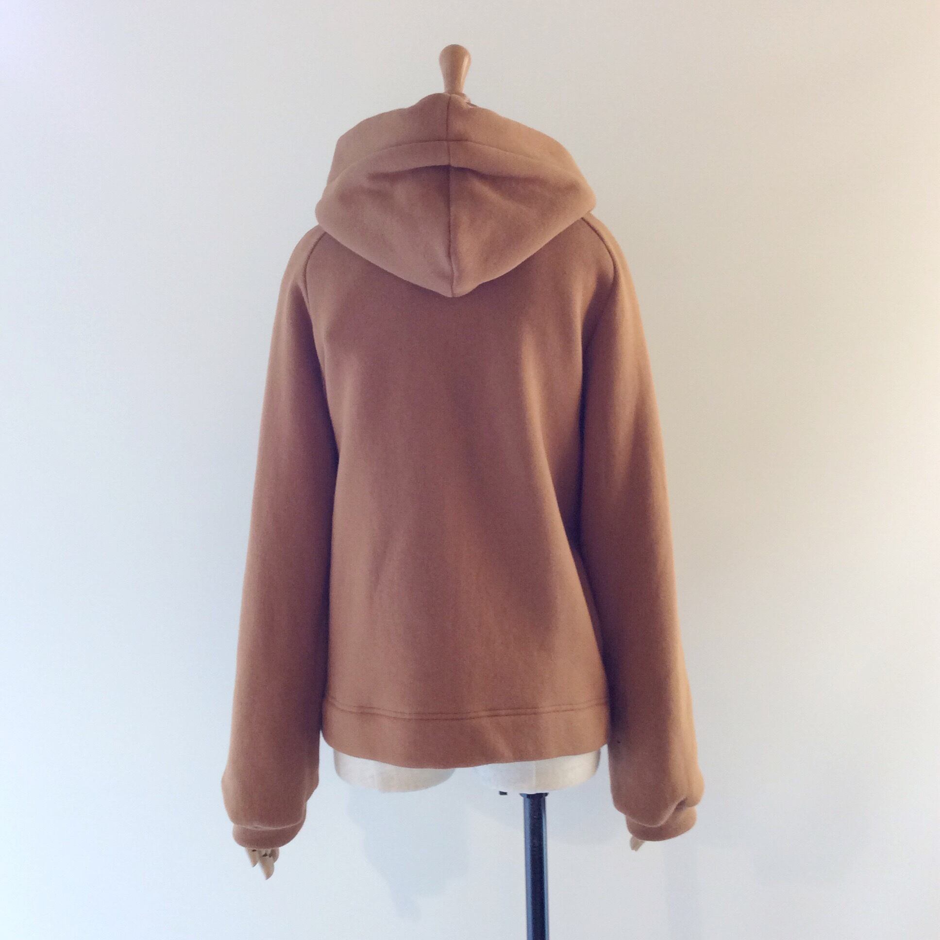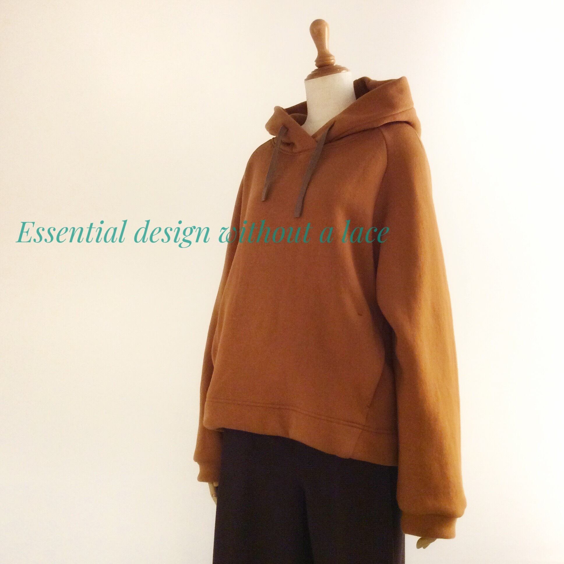 <Design Detail>フードがきちんと綺麗に立つ大人のHoodie。ボリュームある身幅ですが、脇の縫い目を前に斜めに入れることで、スッキリ細く見せてくれます。