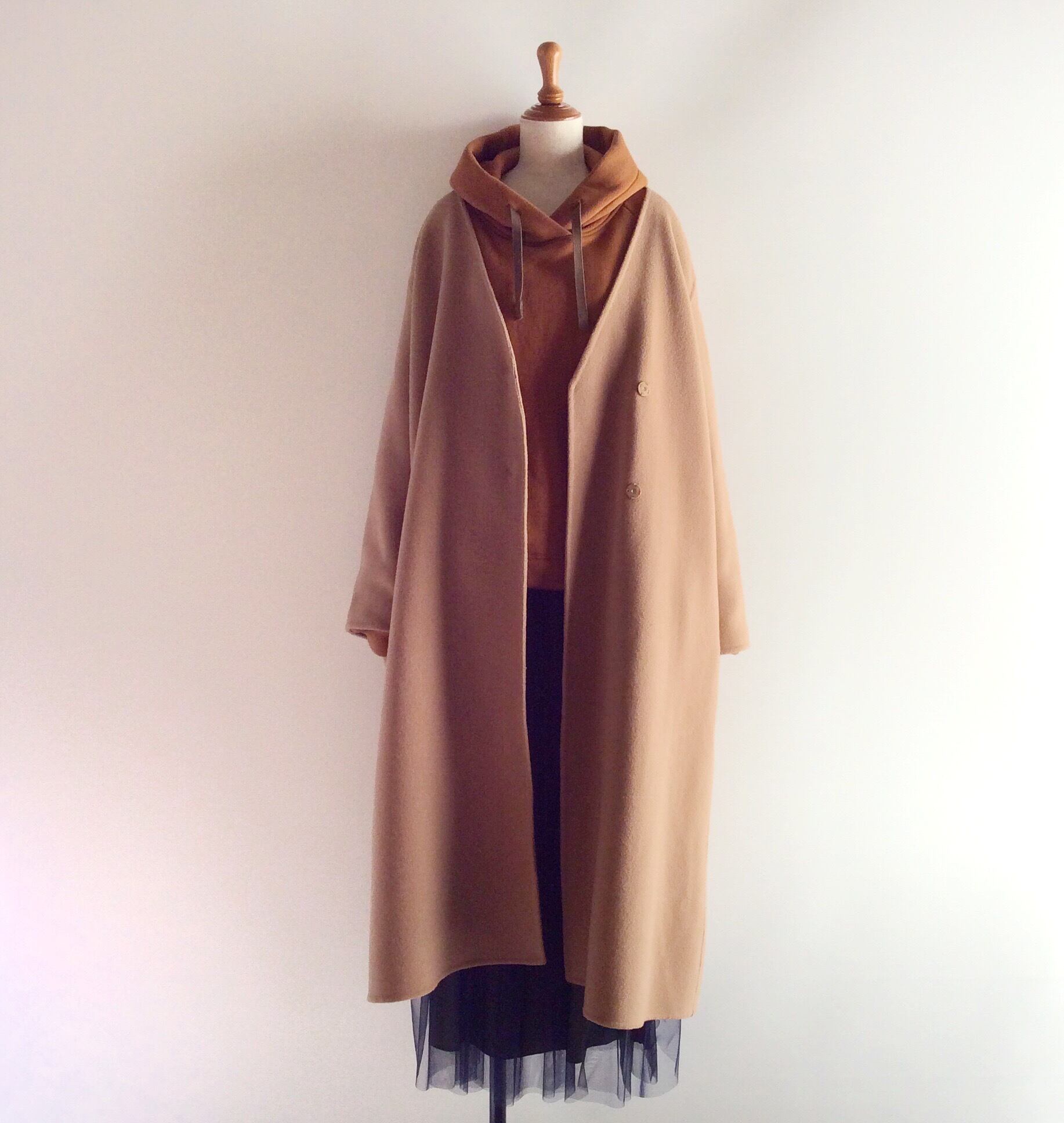 上に着るコートは肩が落ちているものや、ノーカラーのモノを選べば上手くまとまりますよ。