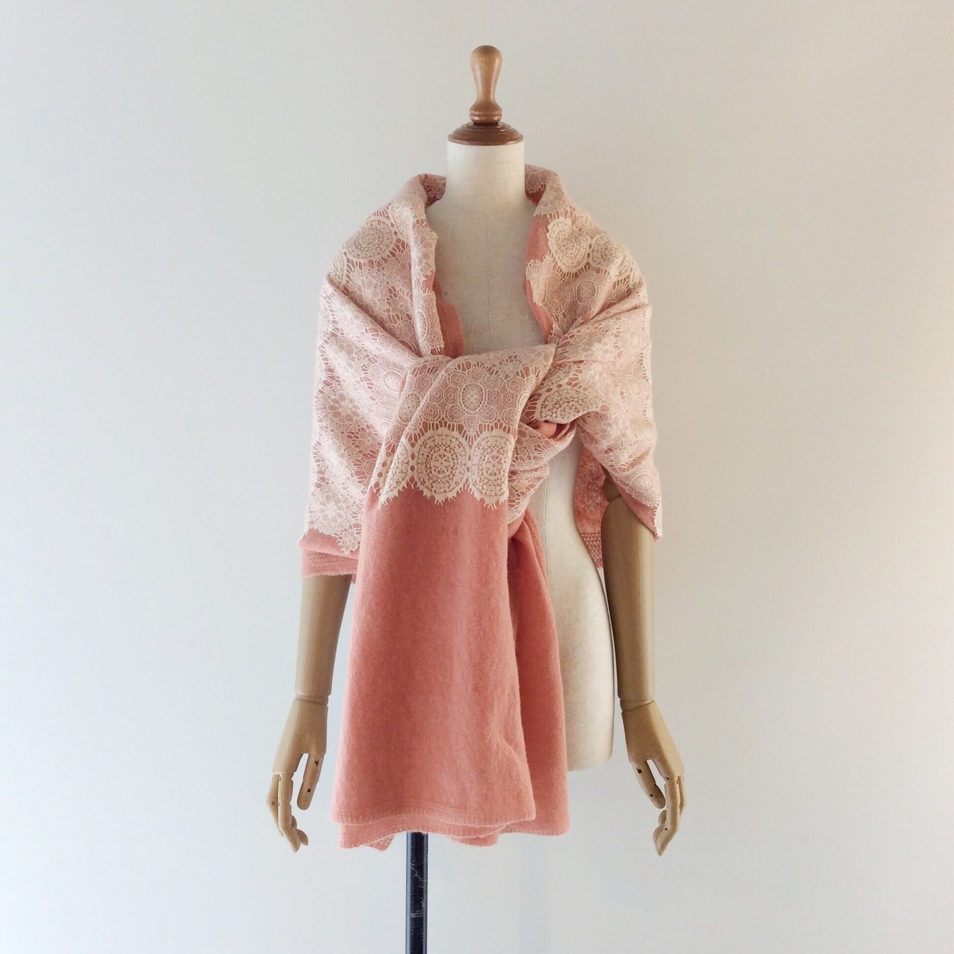 <Design Detail> 繊細なレースがストールの半分以上にあしらわれている贅沢なスカーフ。(刺繍してあるのではなく、貼り付けてあります)。どう巻いても、しっかりレースの存在感があり、黒や赤のお色はシンプルなトップスを重厚な雰囲気に。ピンクや水色、ブラウンは合わせるモノをより楽しく、お洒落している風に見せてくれます。ベイビーアルパカが多く入り肌当たりも柔らかです。