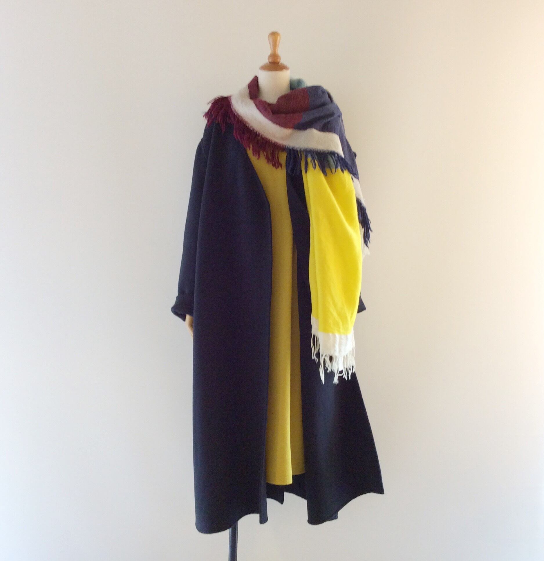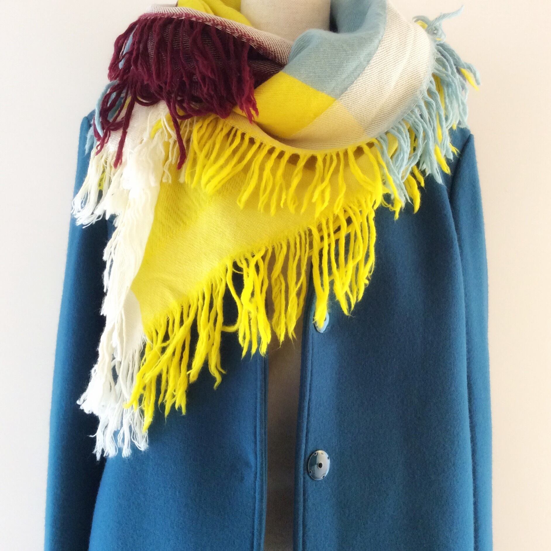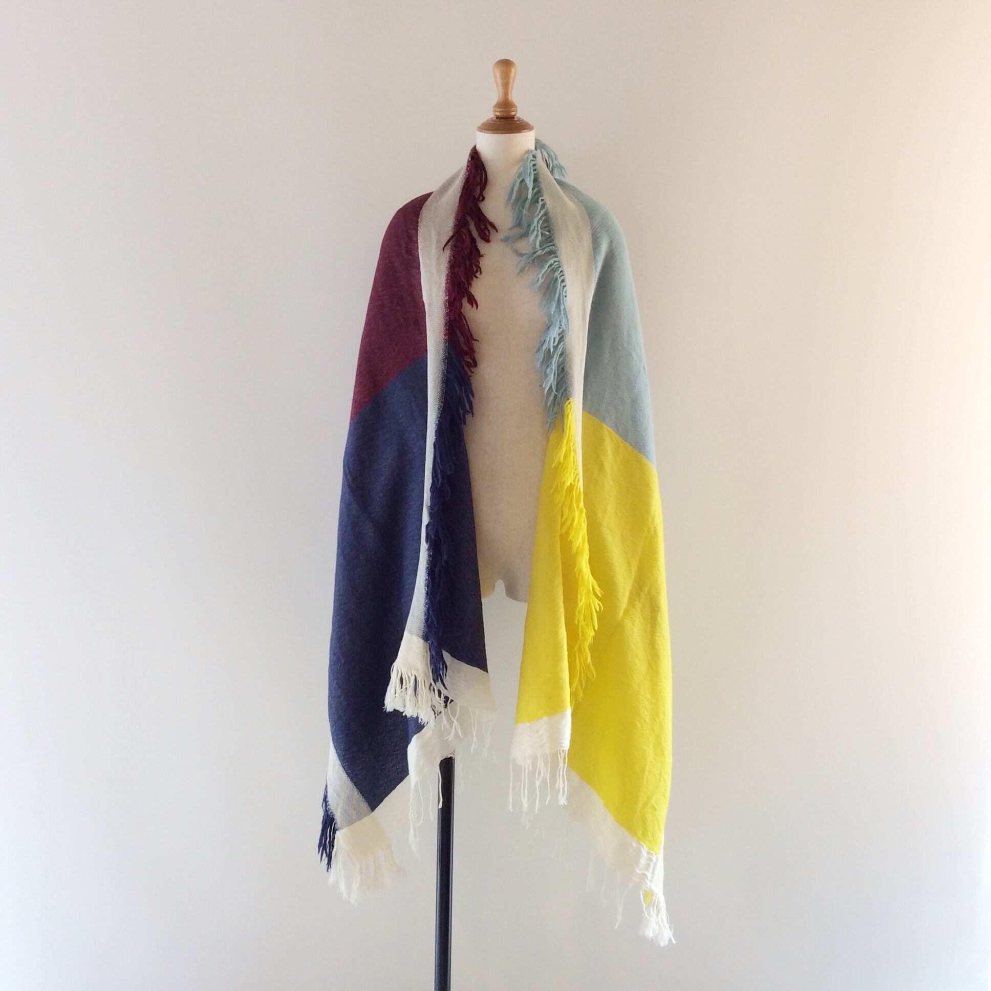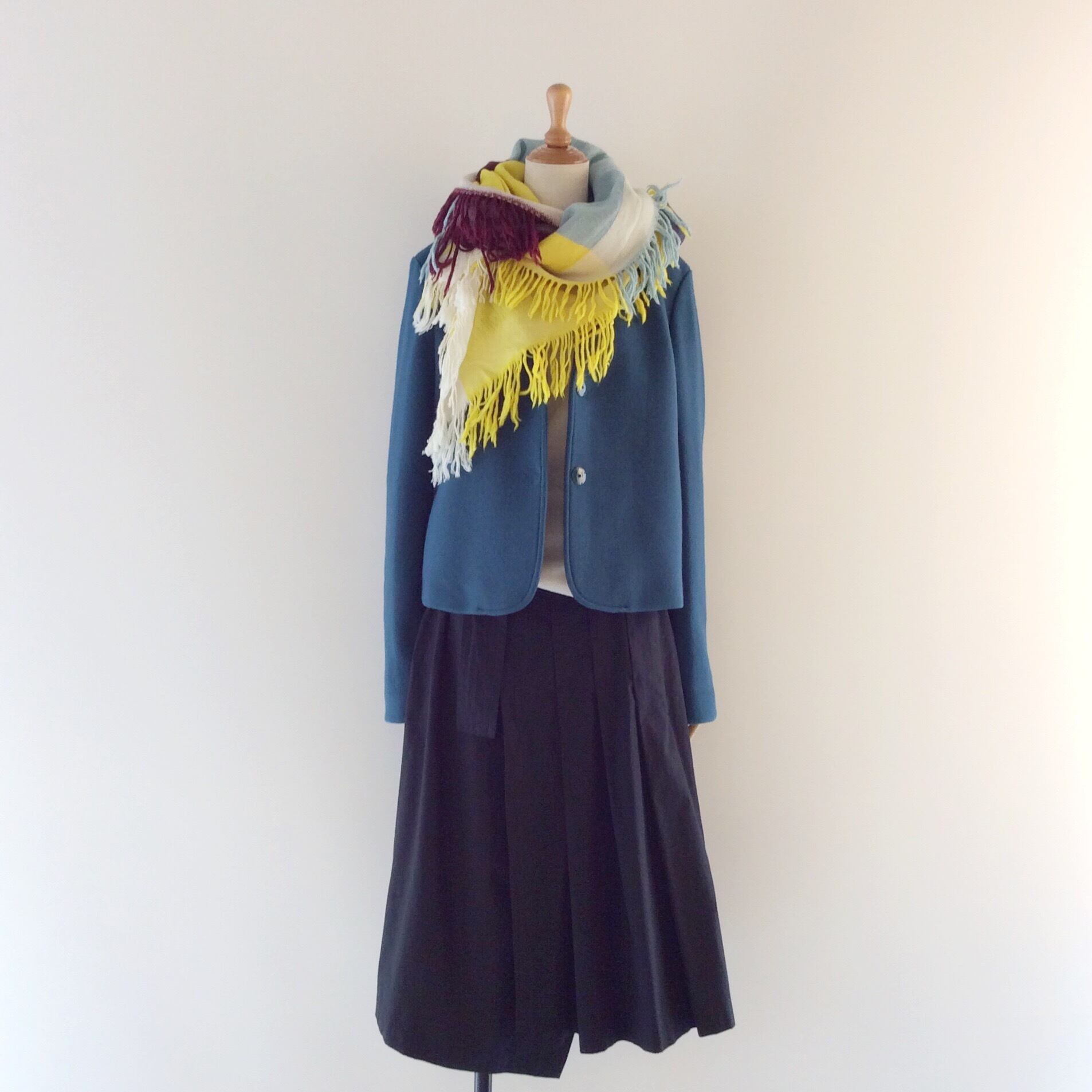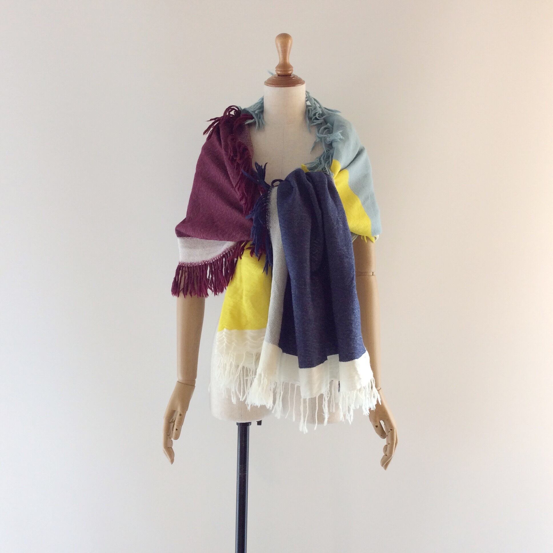 <Colour> ハッキリとした印象にはなるイエローベースのお色。黄色とボルドーや水色?と思うけど巻くとベースの白やネイビーが中和してくれます。