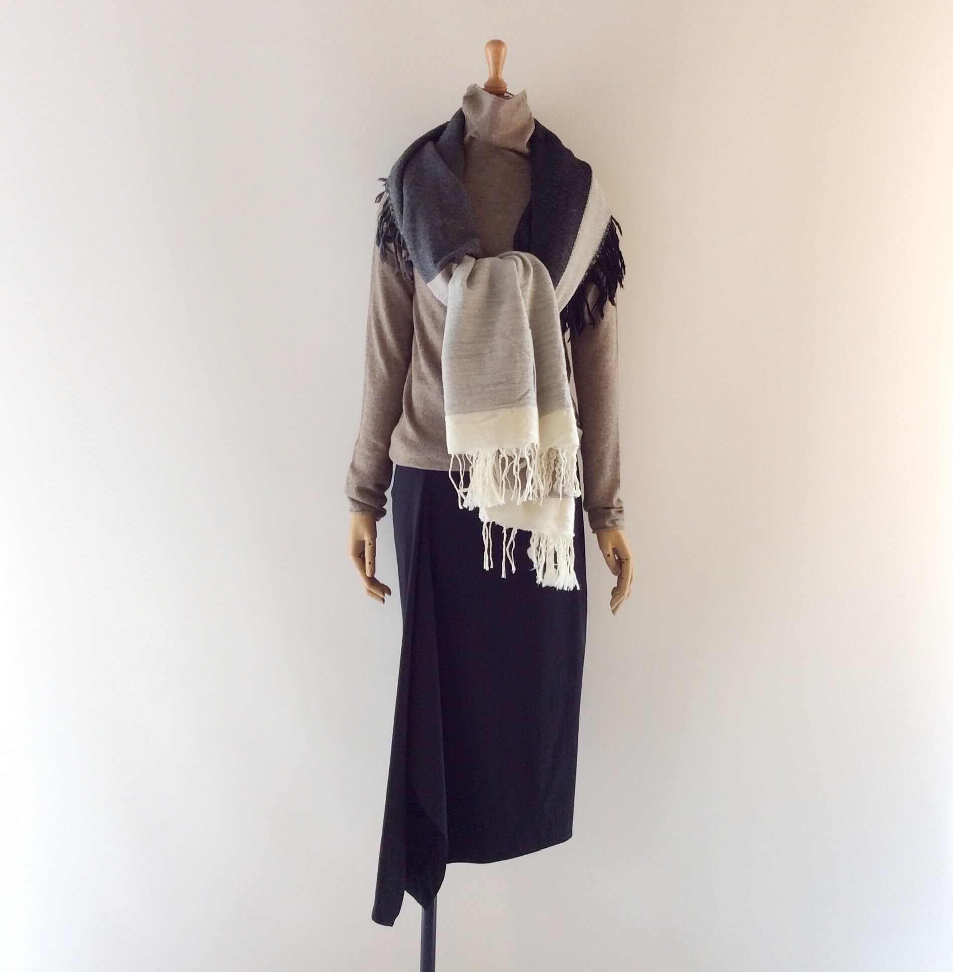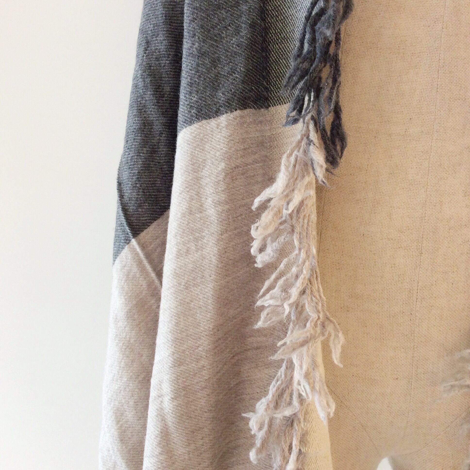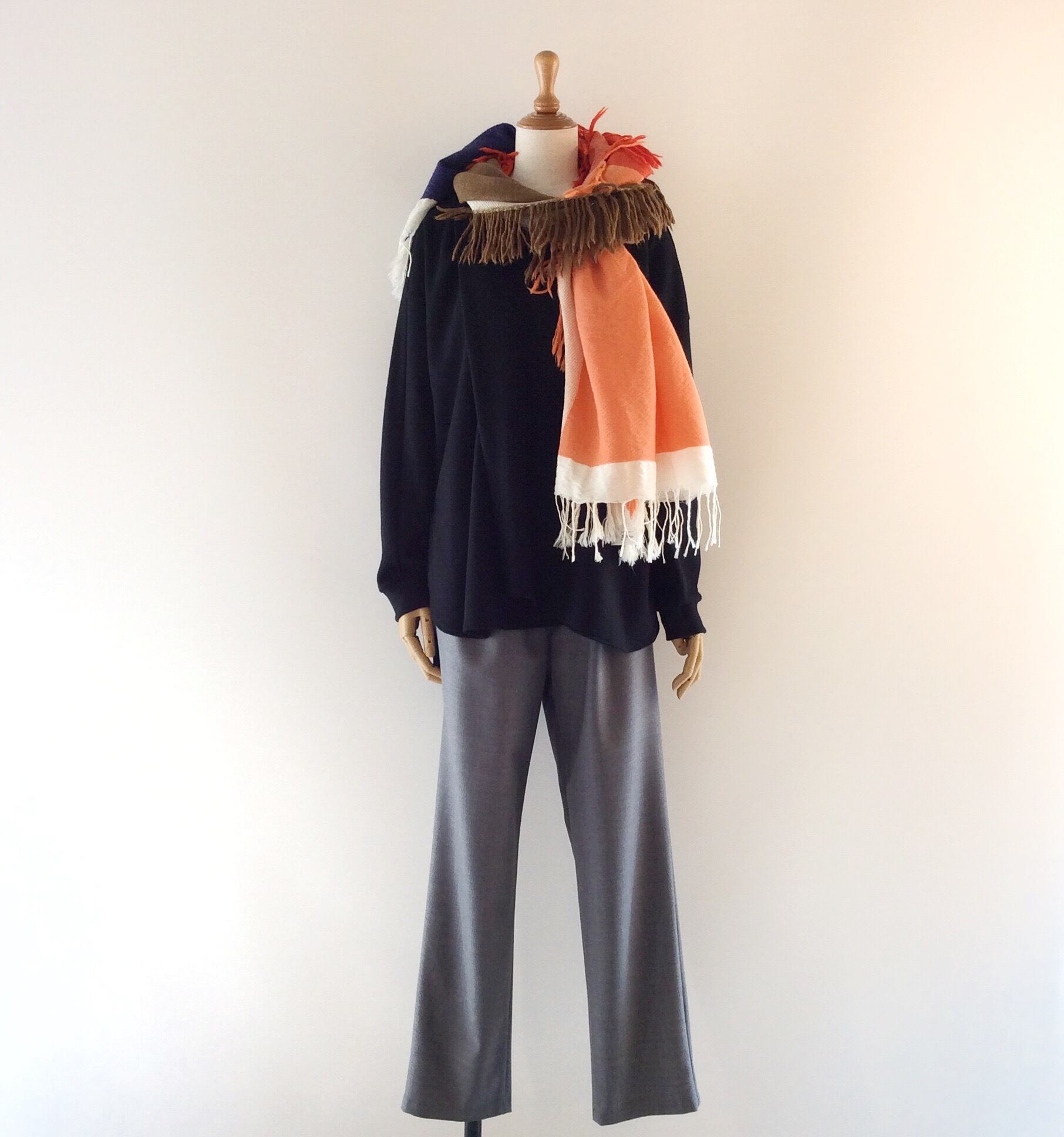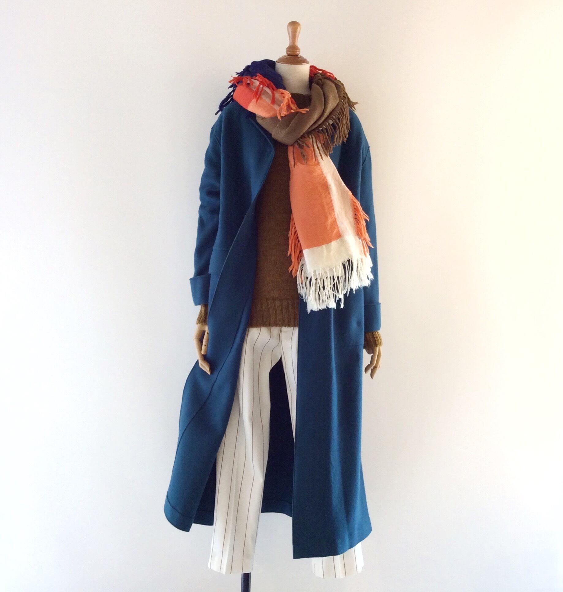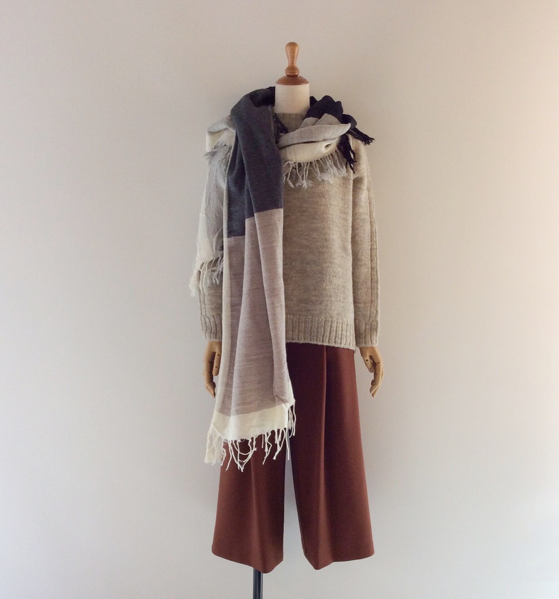 <Coordinate tips> フリンジがポイントのスカーフですが、前述の通りボリュームがですぎないので綺麗めなコーデにもお使いいただけます。その場合、ジャケットやコートの襟はノーカラーか襟が小さめなテーラードを選んで頂くとスッキリします。