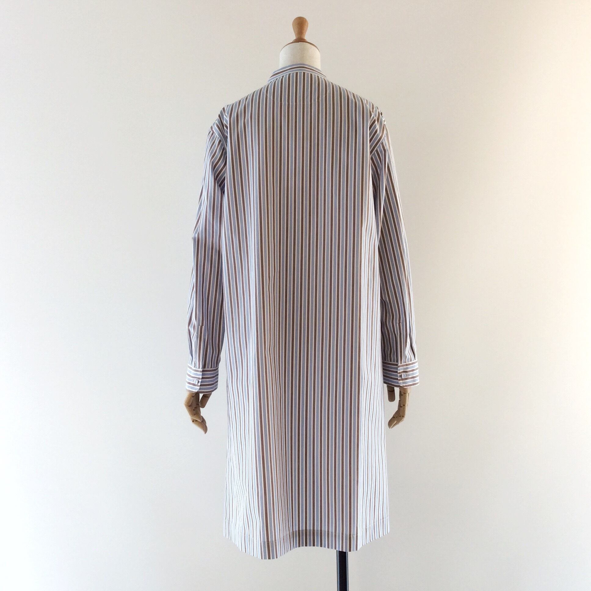 マオカラー風。下まで開かないボタンが、少年ぽさを演していますが、シャツ生地と同じくるみボタンを使っているので、安っぽくありません。前ボタン下にタックを入れるこで、立体感のあるデザインに仕上がっています。