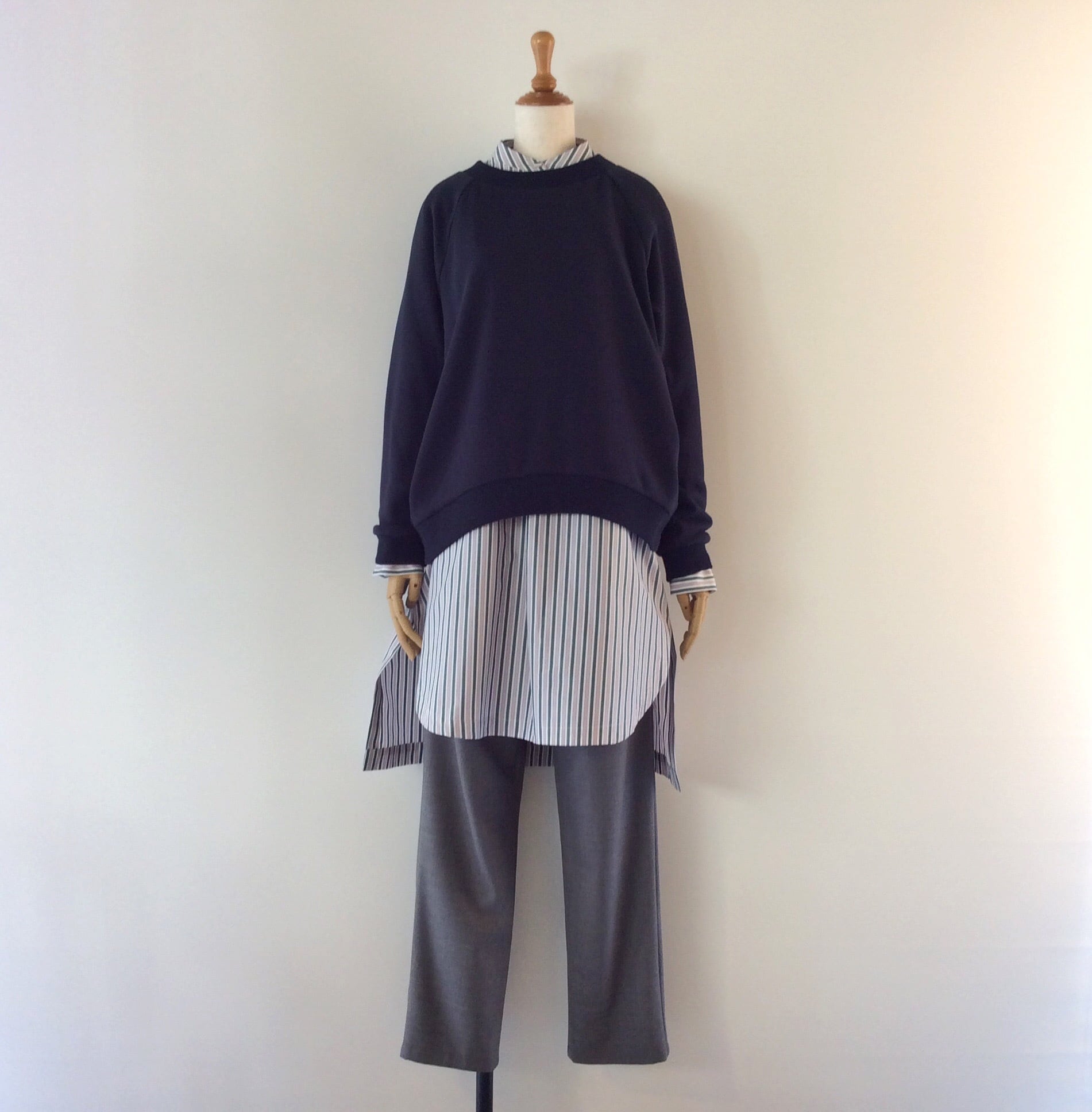 上背がない方でも、細身のくるぶし丈パンツや、テーパードパンツをロールアップすると、チュニック丈とバランスが取りやすいと思います。どちらのお色もグレー、ネイビー、ベージュ等のボトムにも良く合うと思います。