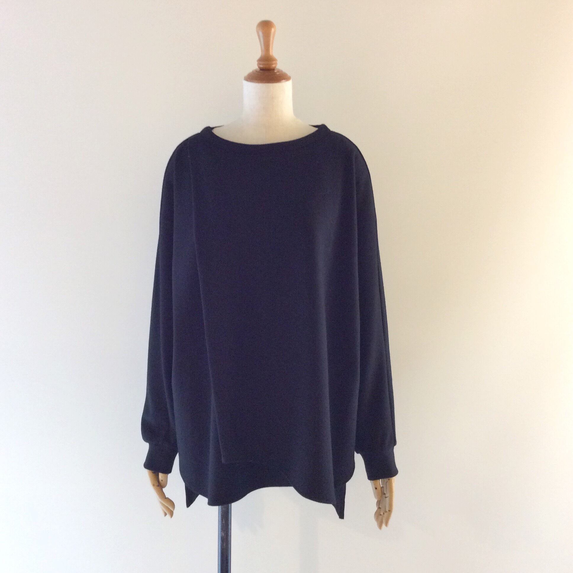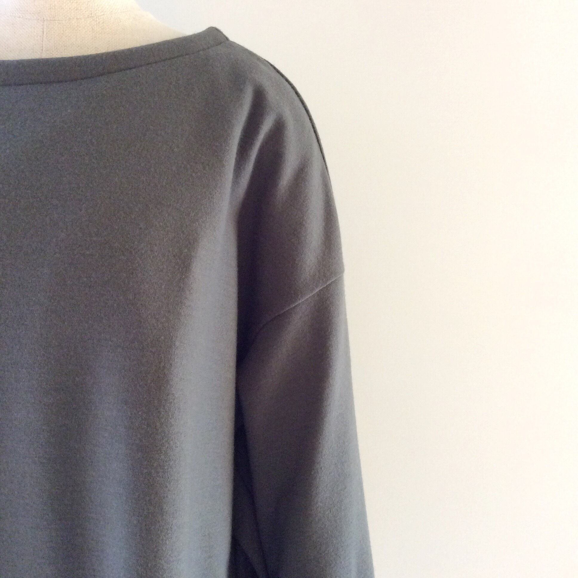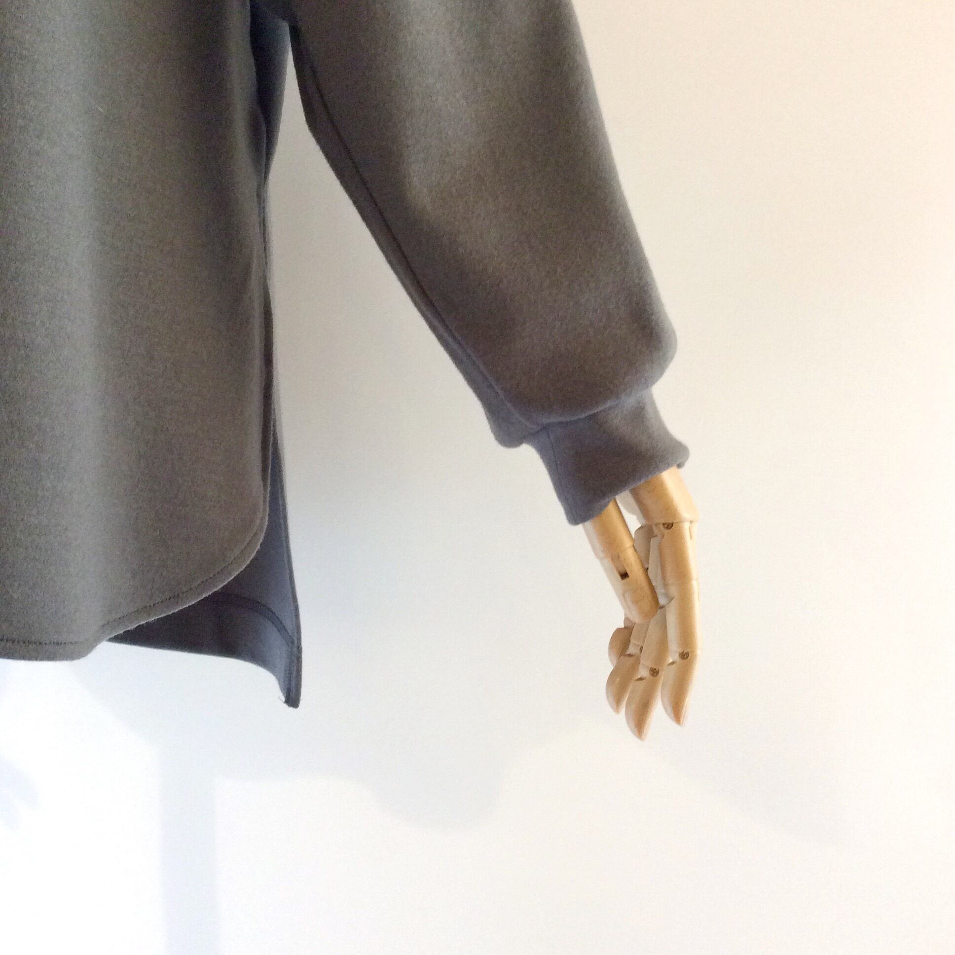 <Design Detail>生地を一部重ねることで、前面が立体的に見えるデザイン。 サイドスリットで、太目や長めのスカートとのコーディネートもOK。 後ろの上部ボタンと、スウェットのようなリブデザインがカジュアル感を演出。