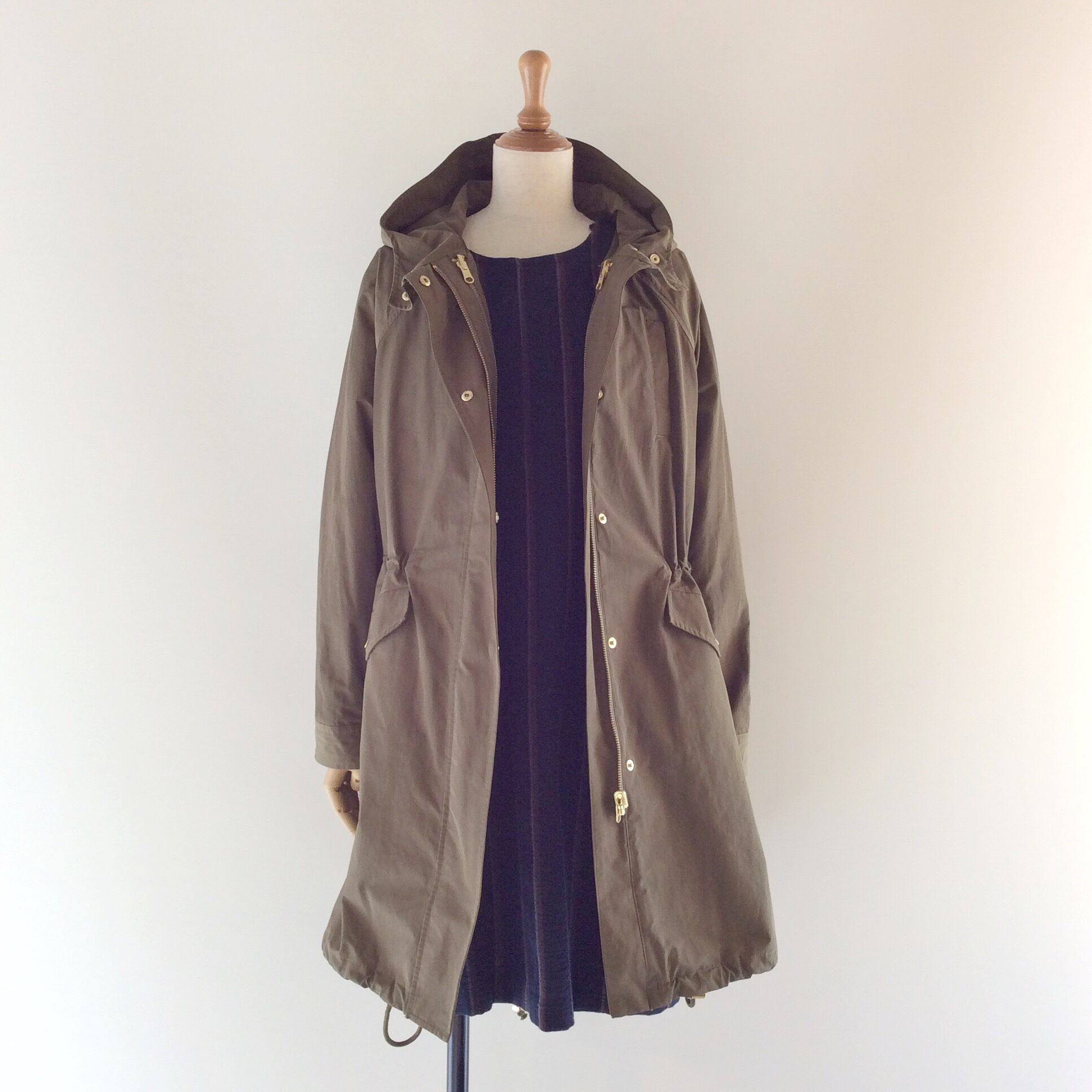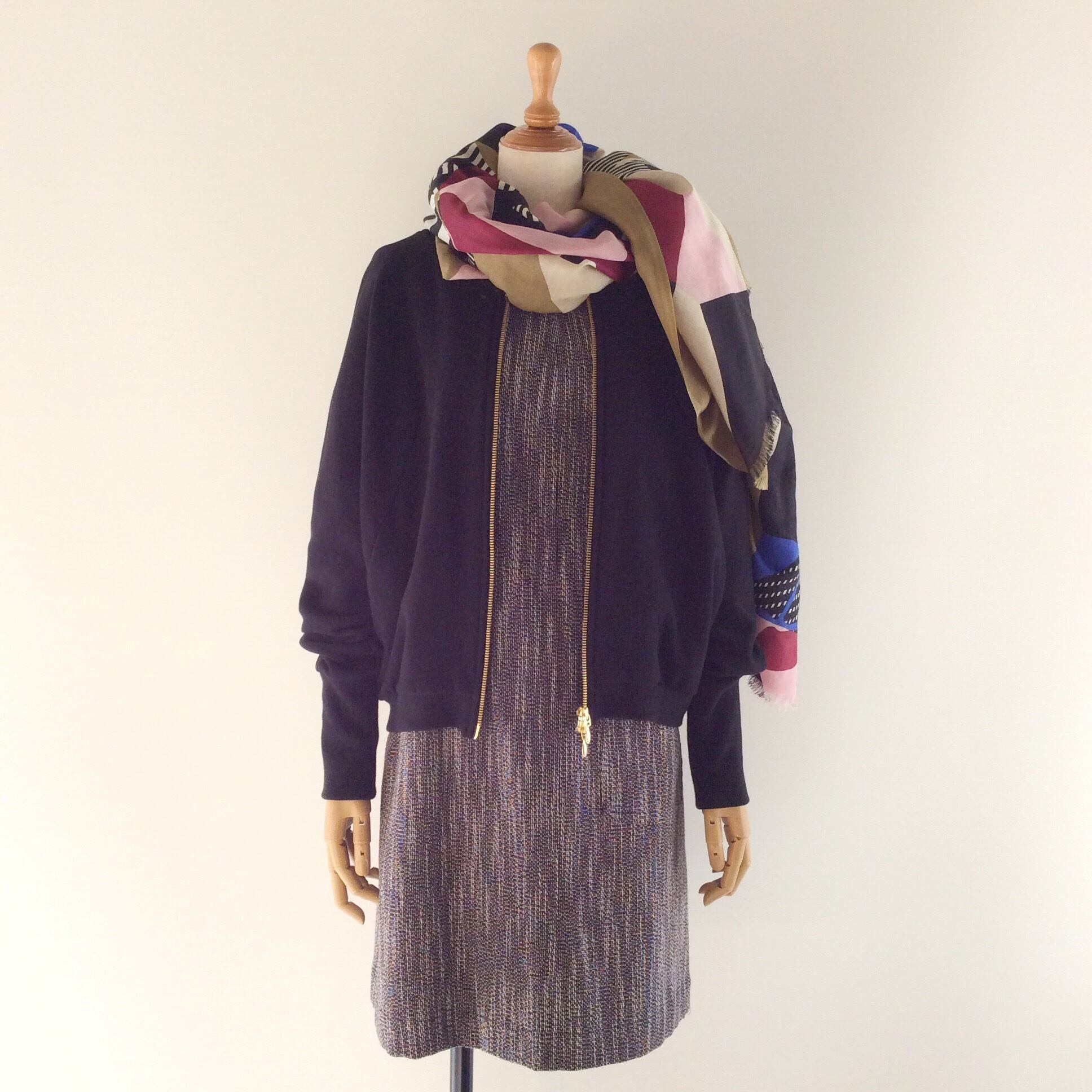 <Codordinate tips>膝上のワンピースなので、短めの羽織りを合わせる場合はフィット感のあるものより、ブルゾンのようなバフっとしたものを。