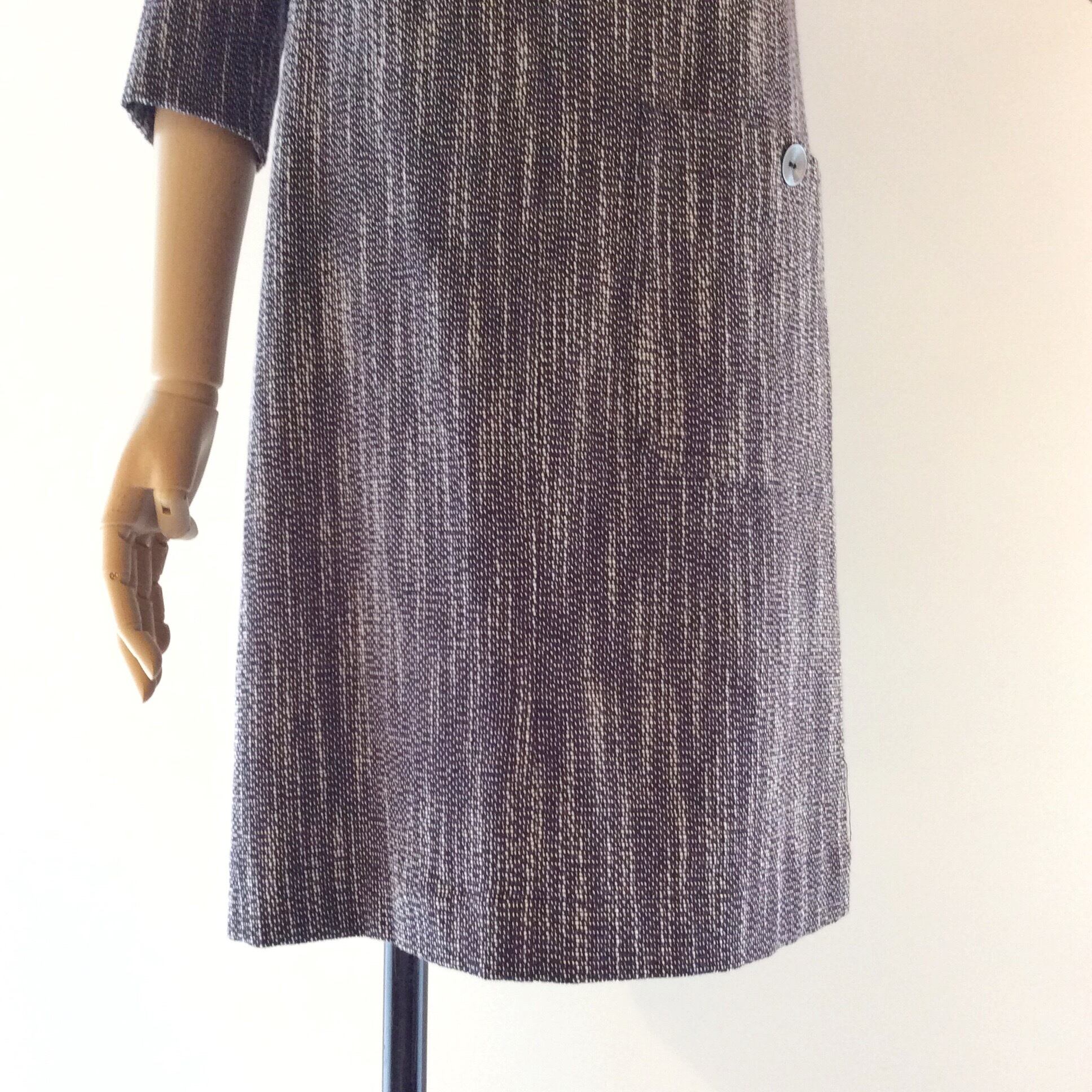 <Design Detail> 膝上のミニワンピース。背中中心にジッパー。左肩にボタンのデザイン。左下にポケット。すとんとしているようで、背中にはダーツを入れ、程よくシェイプしています。