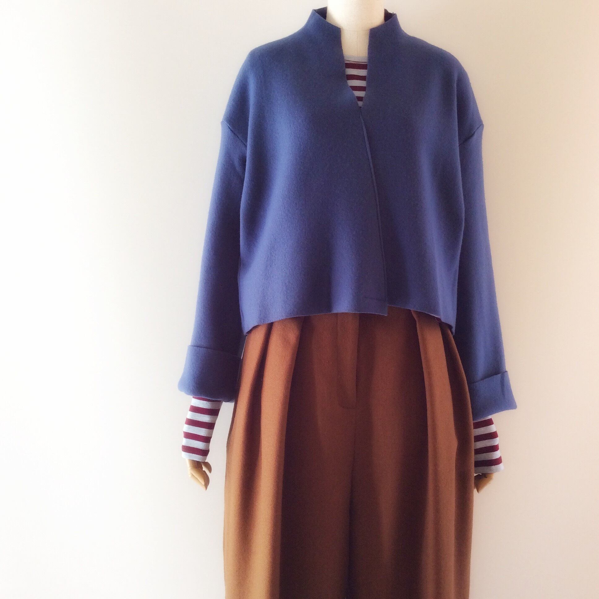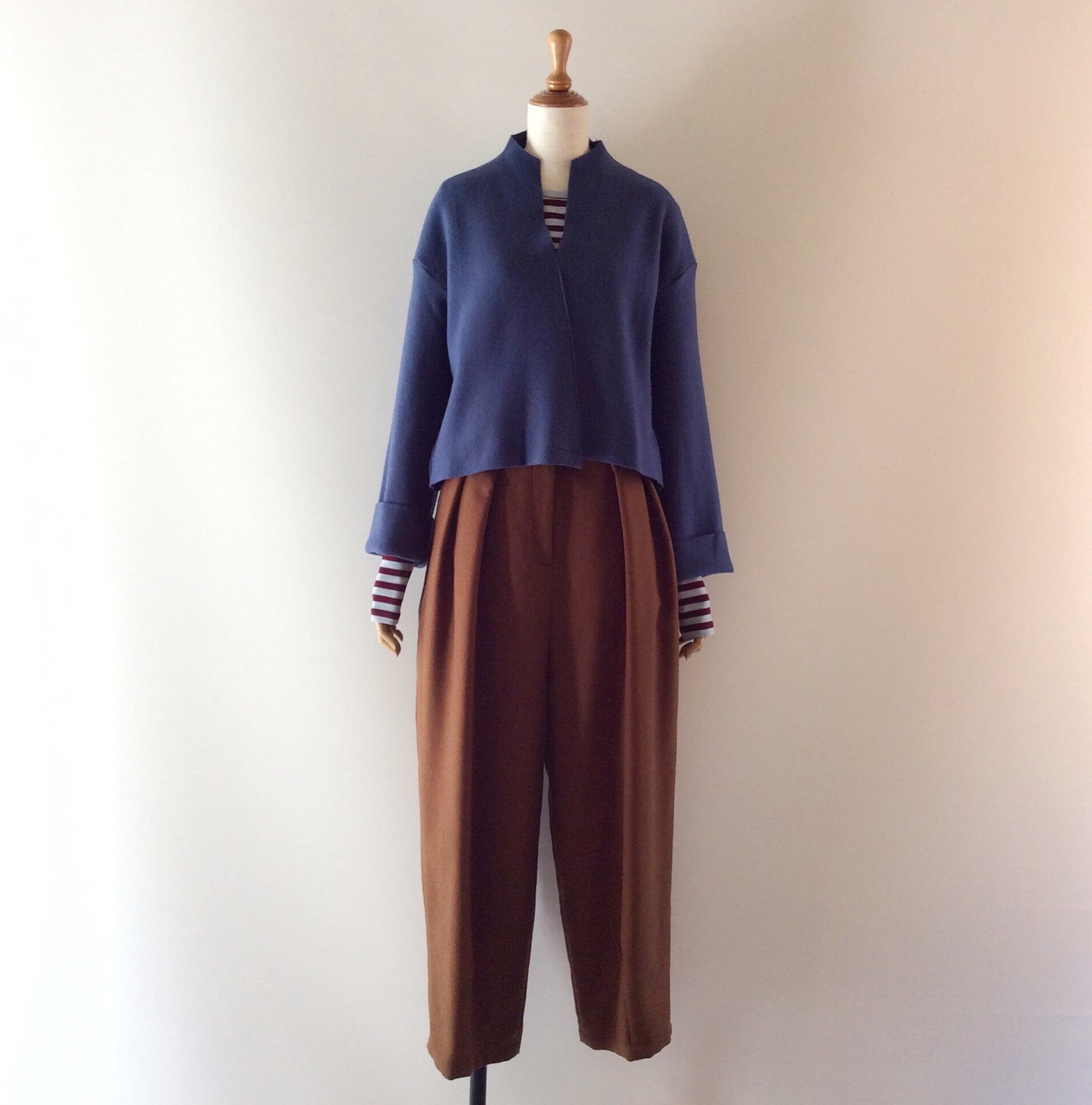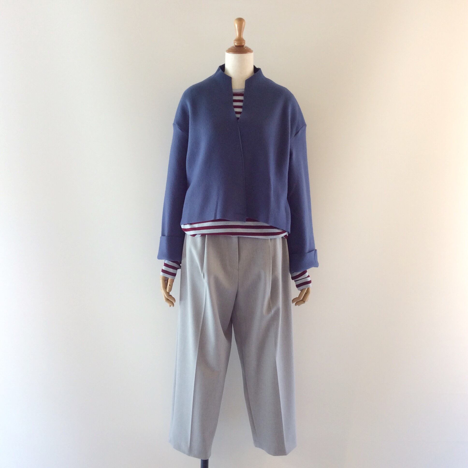 <Coordinate tips> 丈が短めなので、ボトムはスカートやハイウエストのモノ。または、インナーを5㎝くらいまで見せてレイヤードを楽しんで。丈が短めで難易度が高そうですが、丁度良いインナーを見つけてしまえば、お色も形も他には無いオリジナリティ溢れるお洋服です。