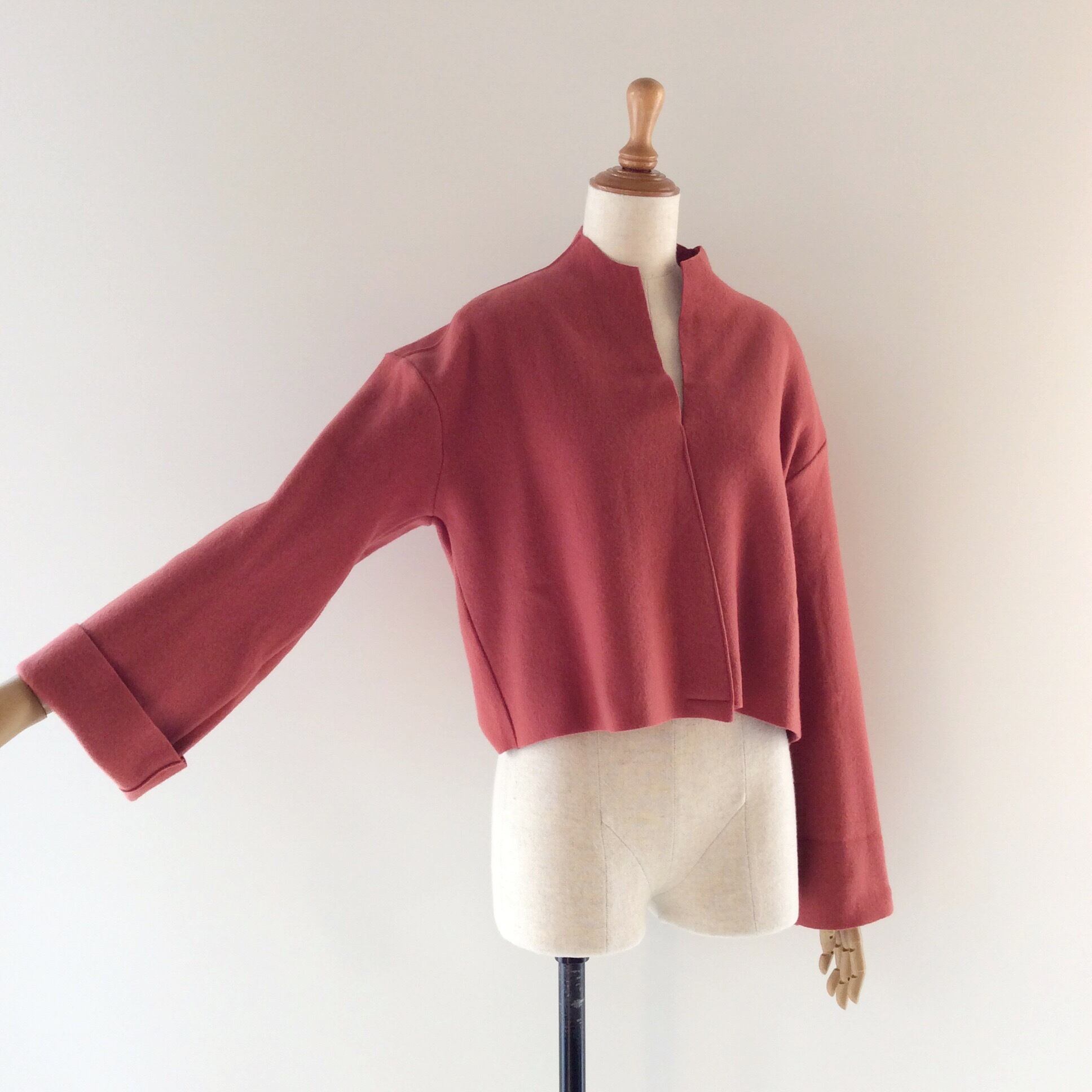 <Design Detail> 前が短く、オーバーサイズシルエットの短めトップ。切りっぱなしのフィニッシング。ドロップショルダーで、袖付けはゆったり。