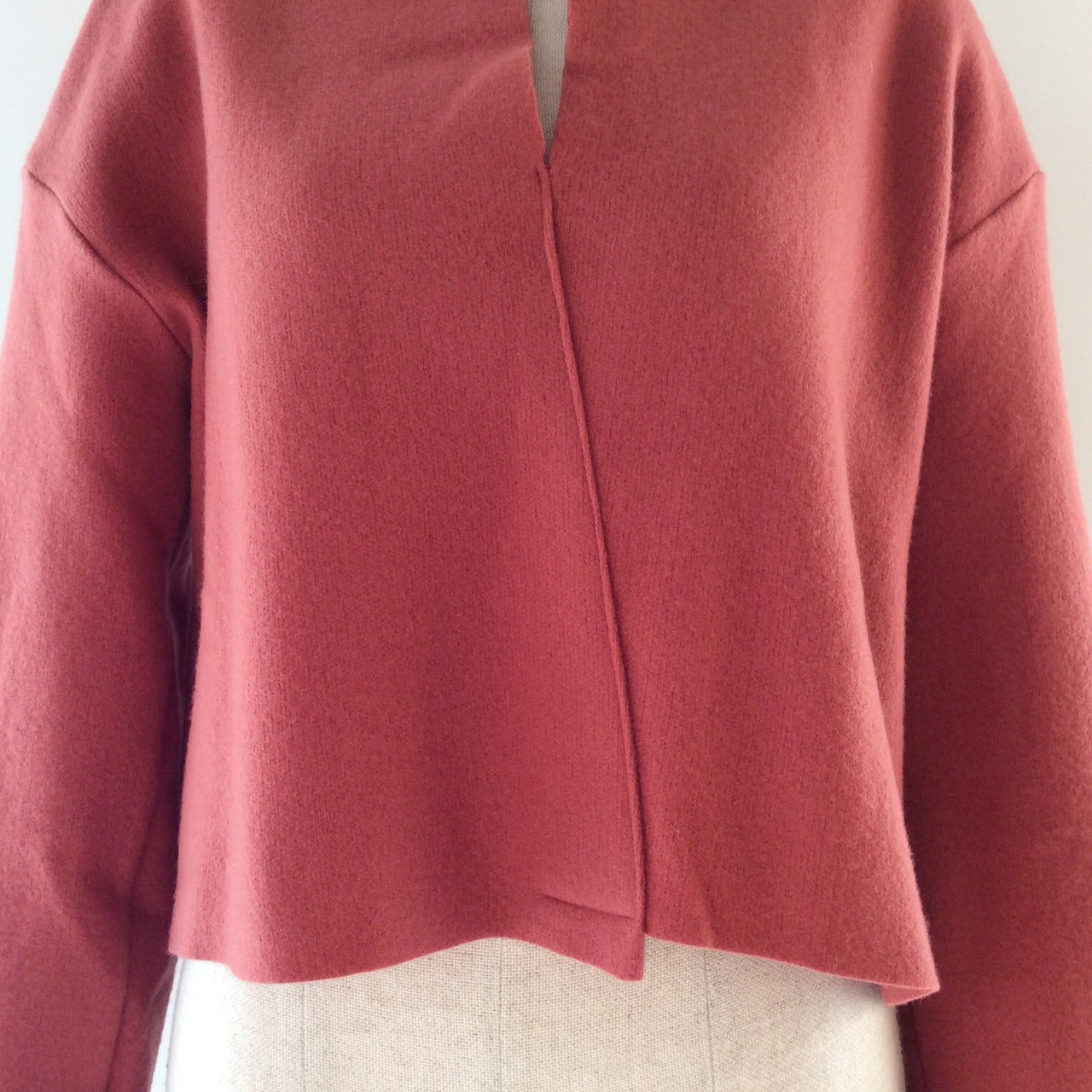 首の後ろはハイネックで温かく、前は細目で深めのV-neck、ヒートテックなどの重ね着が必要です。