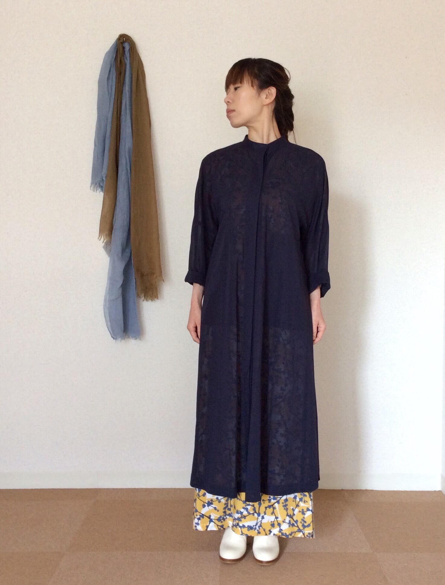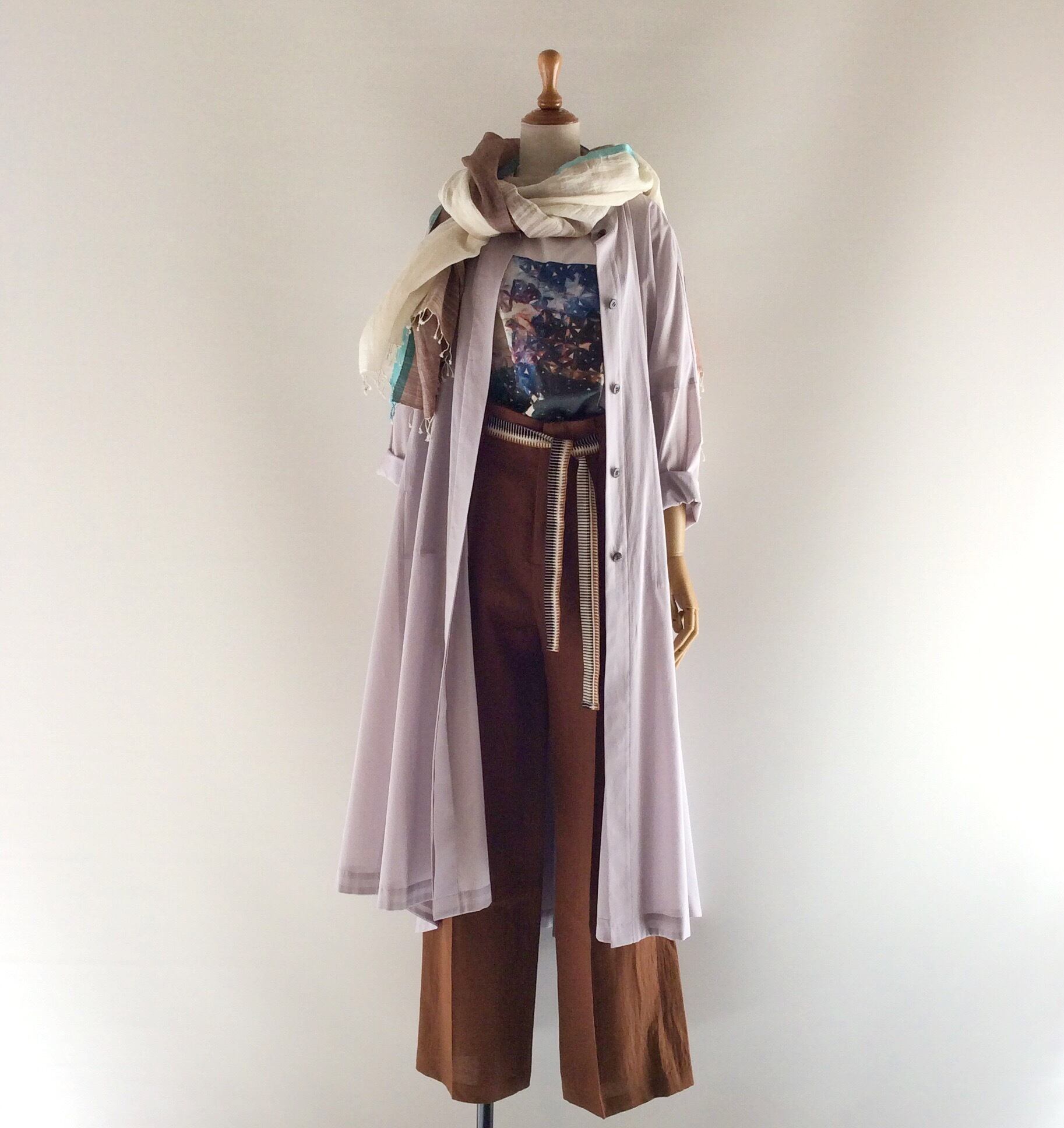 <Coordinate tips> 透け感がトレンドの1つの今季。ブラウスで透けるとインナーを考えて、敬遠される方もいらっしゃるかもですが、こちらはコートなので下にTシャツや袖の短めのトロっと素材のブラウスでも良いので、安心してトレンドを取り入れられるのでは。