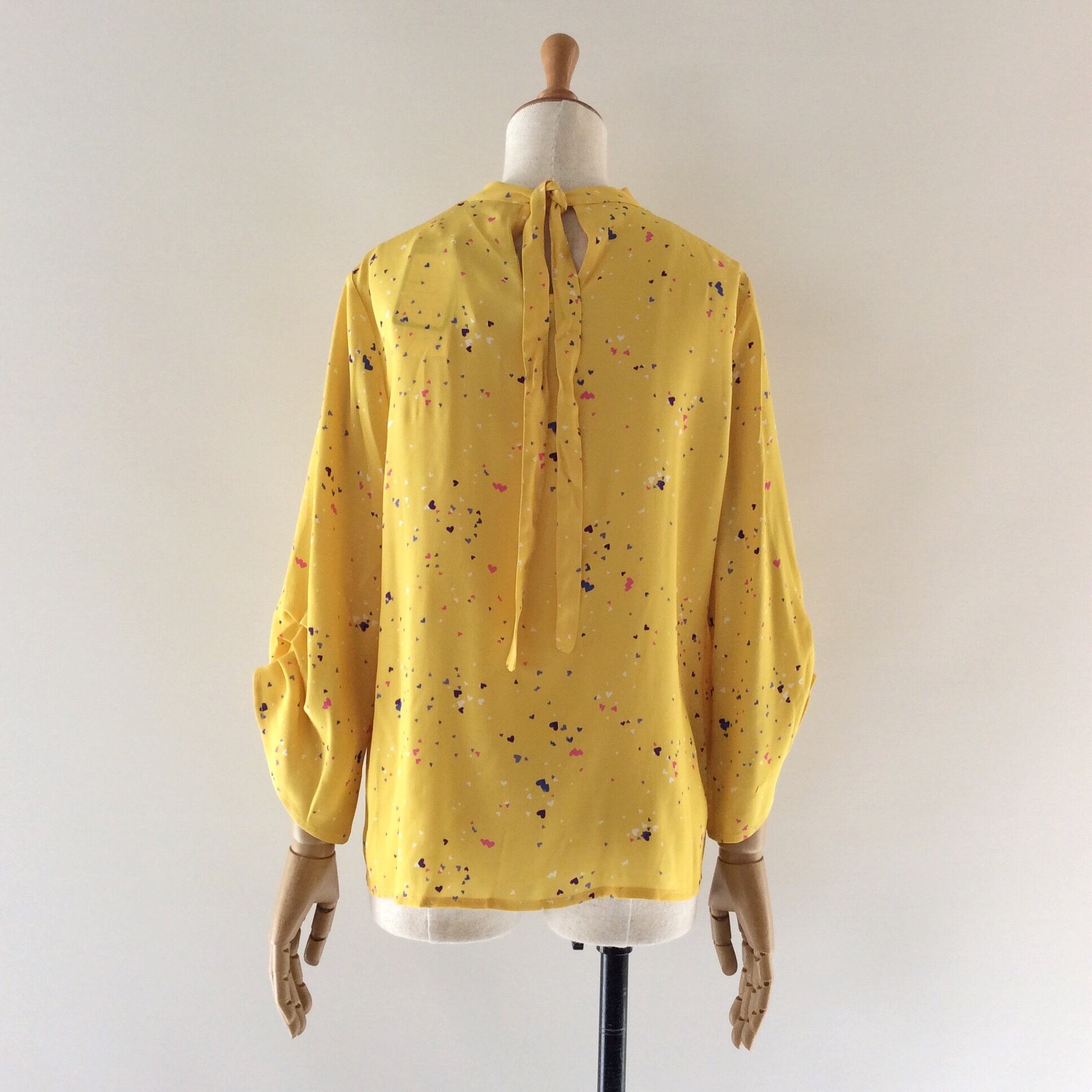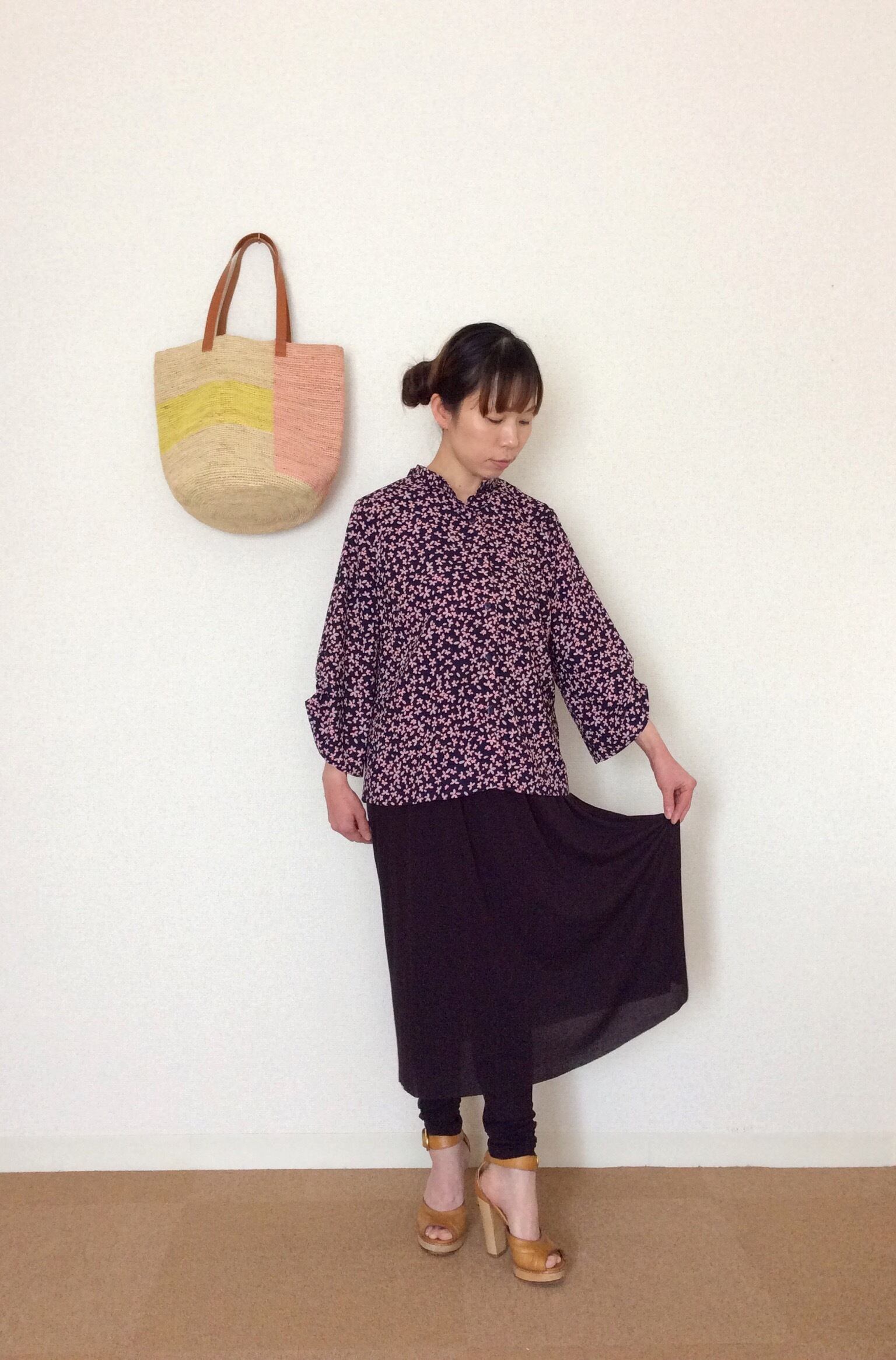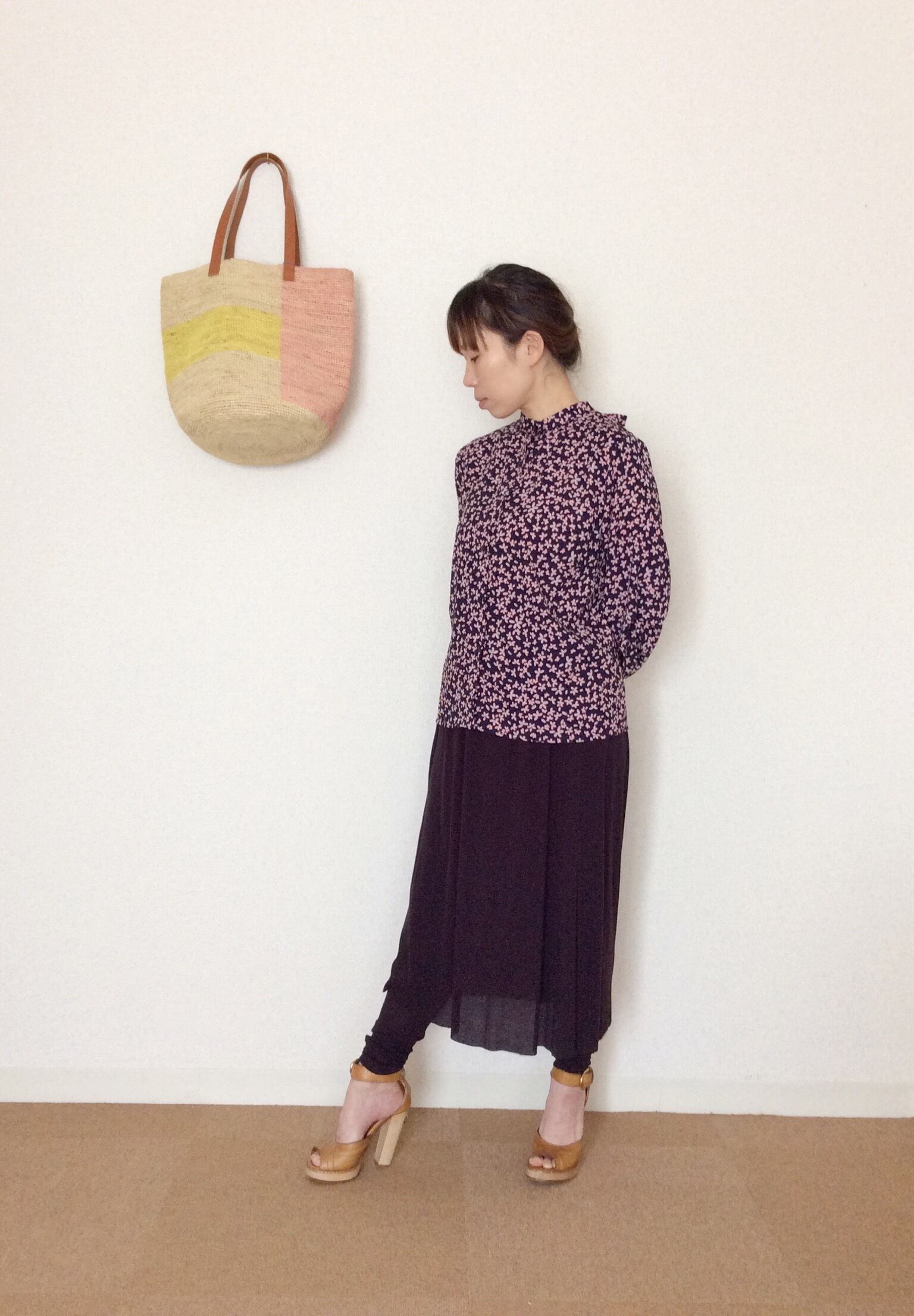 <Coordinate tips> 腕のデザインはありますが、どの色・パターンもトロンとした素材感なので、薄手のカーディガンでなければ重ね着しても邪魔になりません。丈感と少しユルッと体の中で生地が泳ぐ身幅感も丁度良く、細身のパンツに合わせてもインしてスカートやキュロットと合わせても 素敵な万能ブラウス。