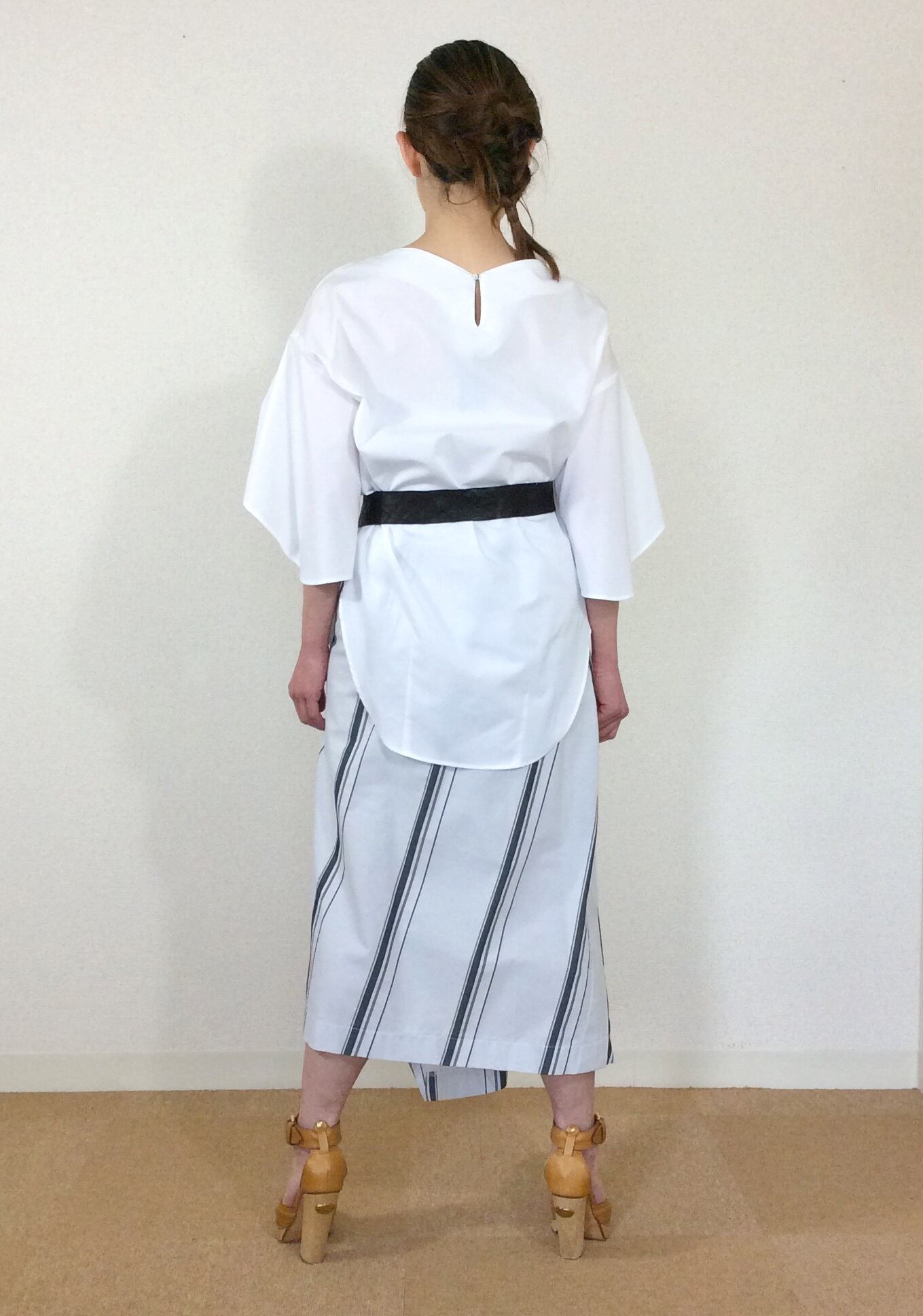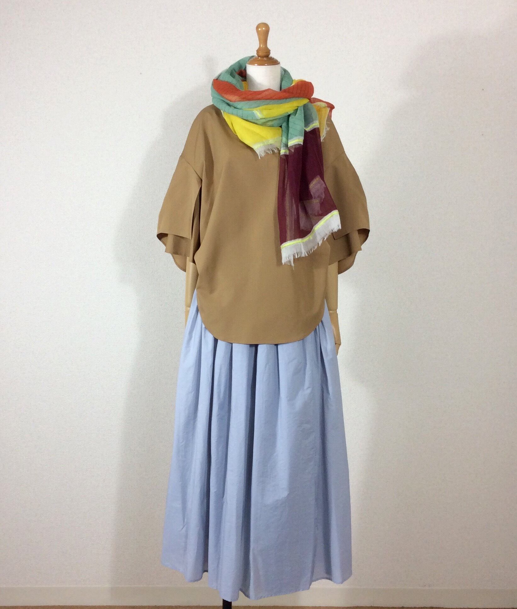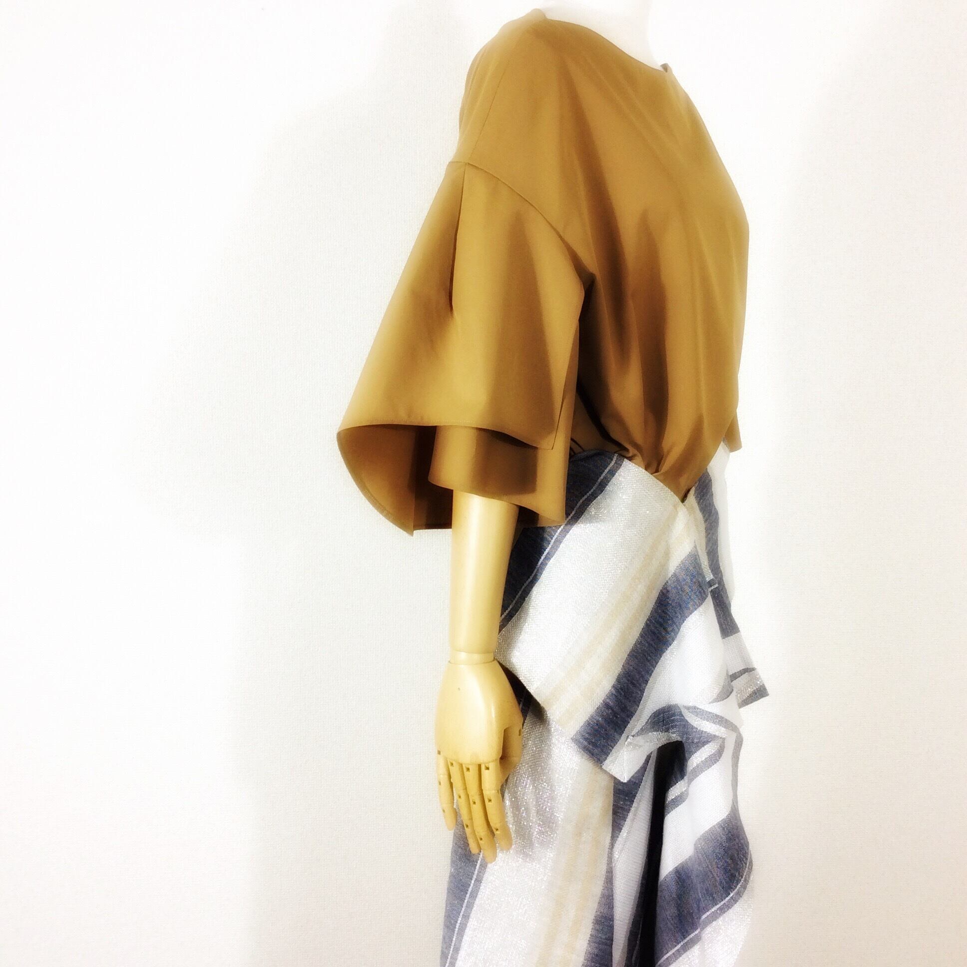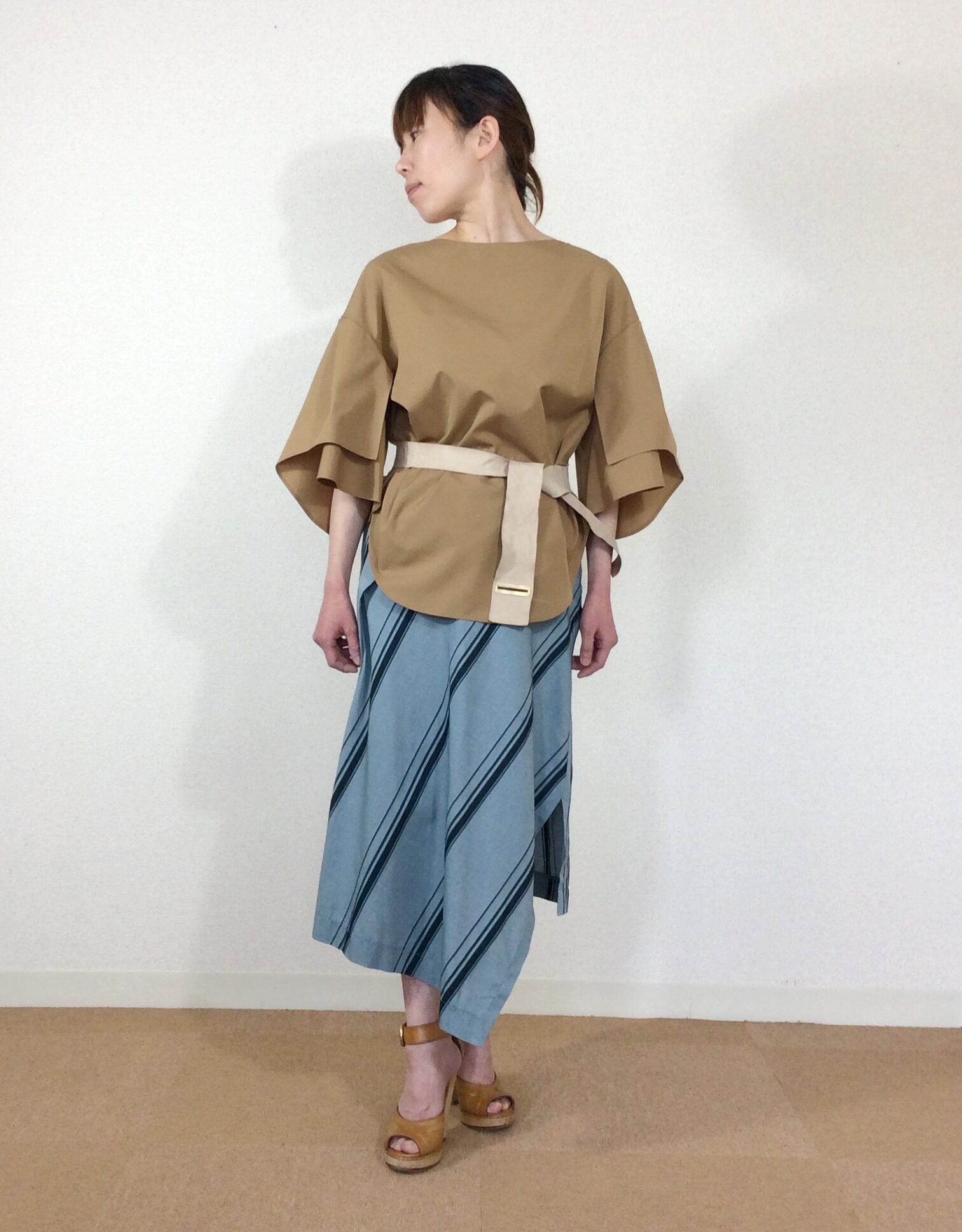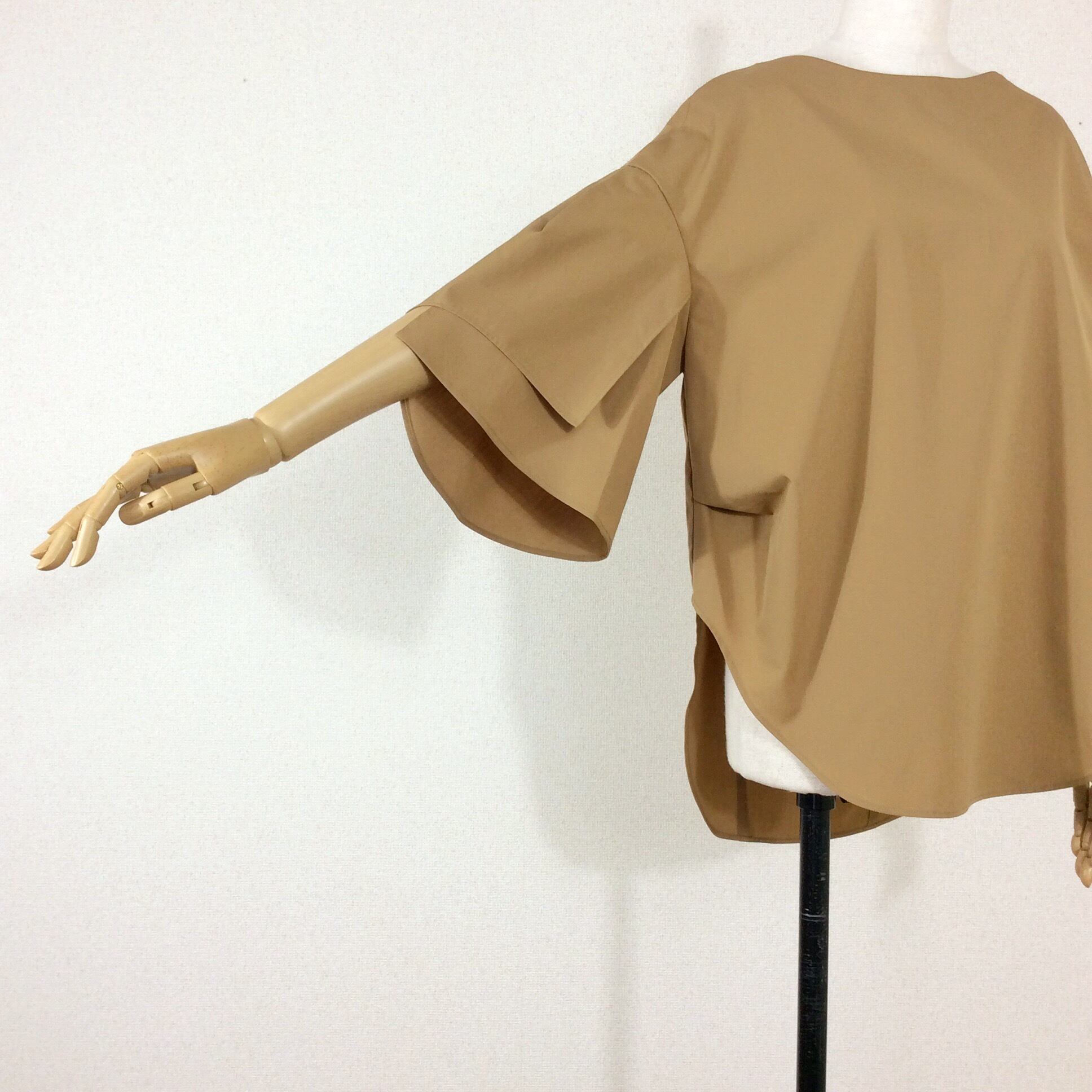 一枚の布を使って、巻きスカートやクレープのように腕回りを一周半させて作られている袖が、デザインとして綺麗なことはもちろんですが、二の腕がしっかり隠せる五分丈の袖でありながら、腕が動かしやすくストレスフリーであることもこの袖の特徴