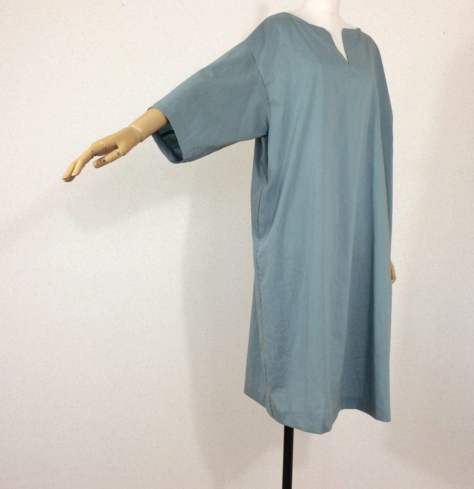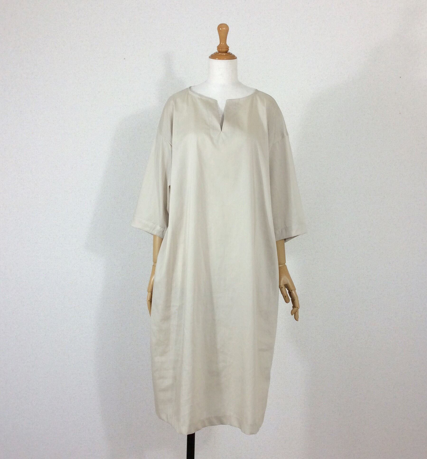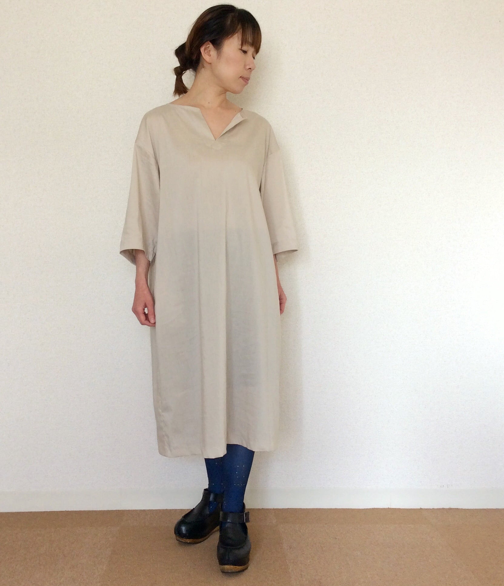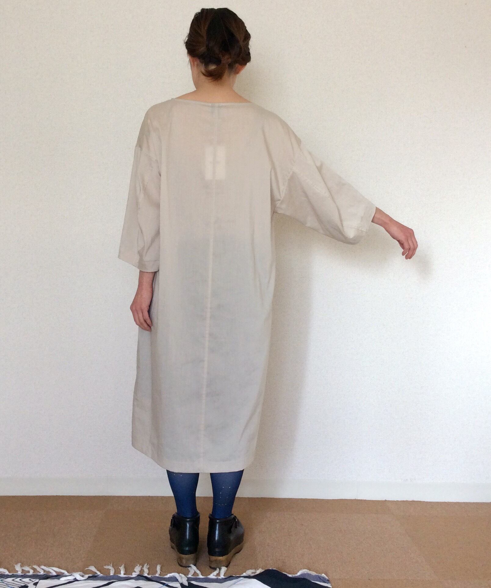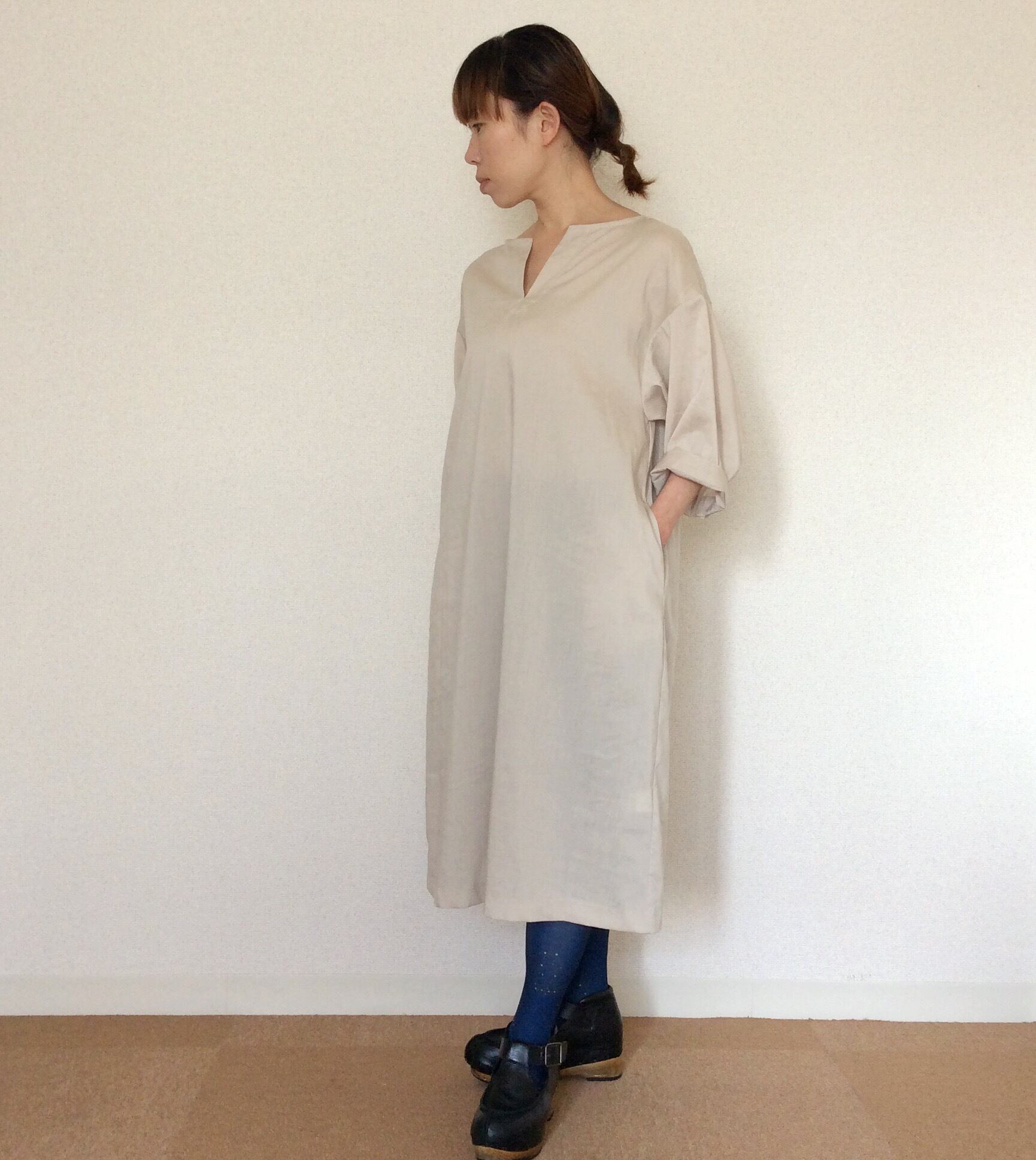 <Design Detail>初夏まで使える麻混のシンプルワンピース。肘もしっかり隠れる7分丈。少しプックリしたお袖になるようデザインされています。