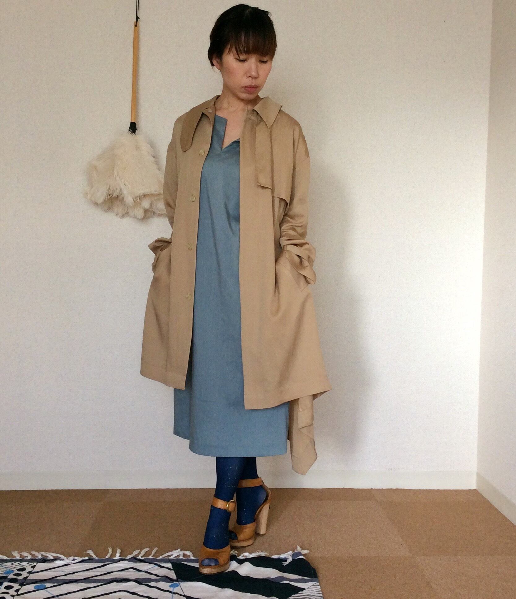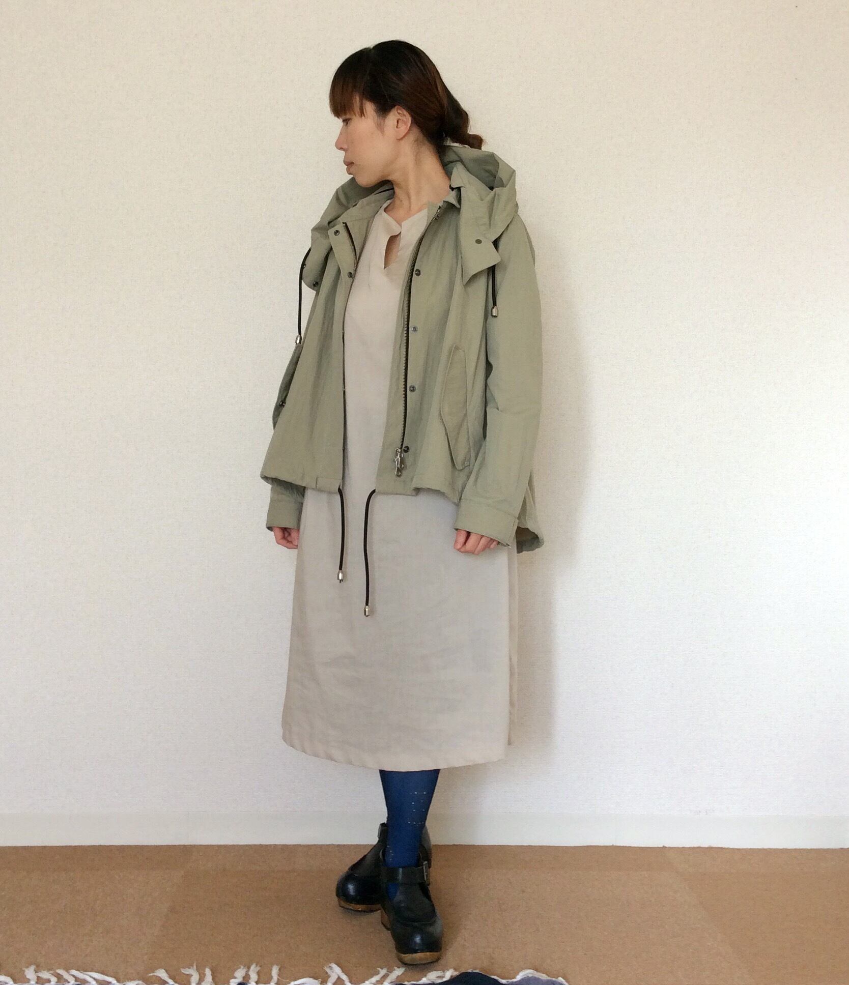 <Codordinate tips> 秋口や、春先の少し肌寒い時期には、ボーダーカットソーやハイネックインナーとレイヤードしてもOK。ワンピースがシンプルなので、太めのベルトで、シルエットを付けたり、カラータイツや、素材感のあるタイツで足元を遊ぶのもお勧め。