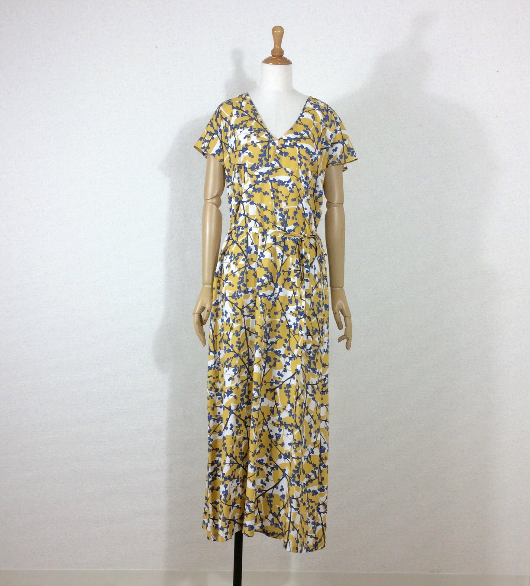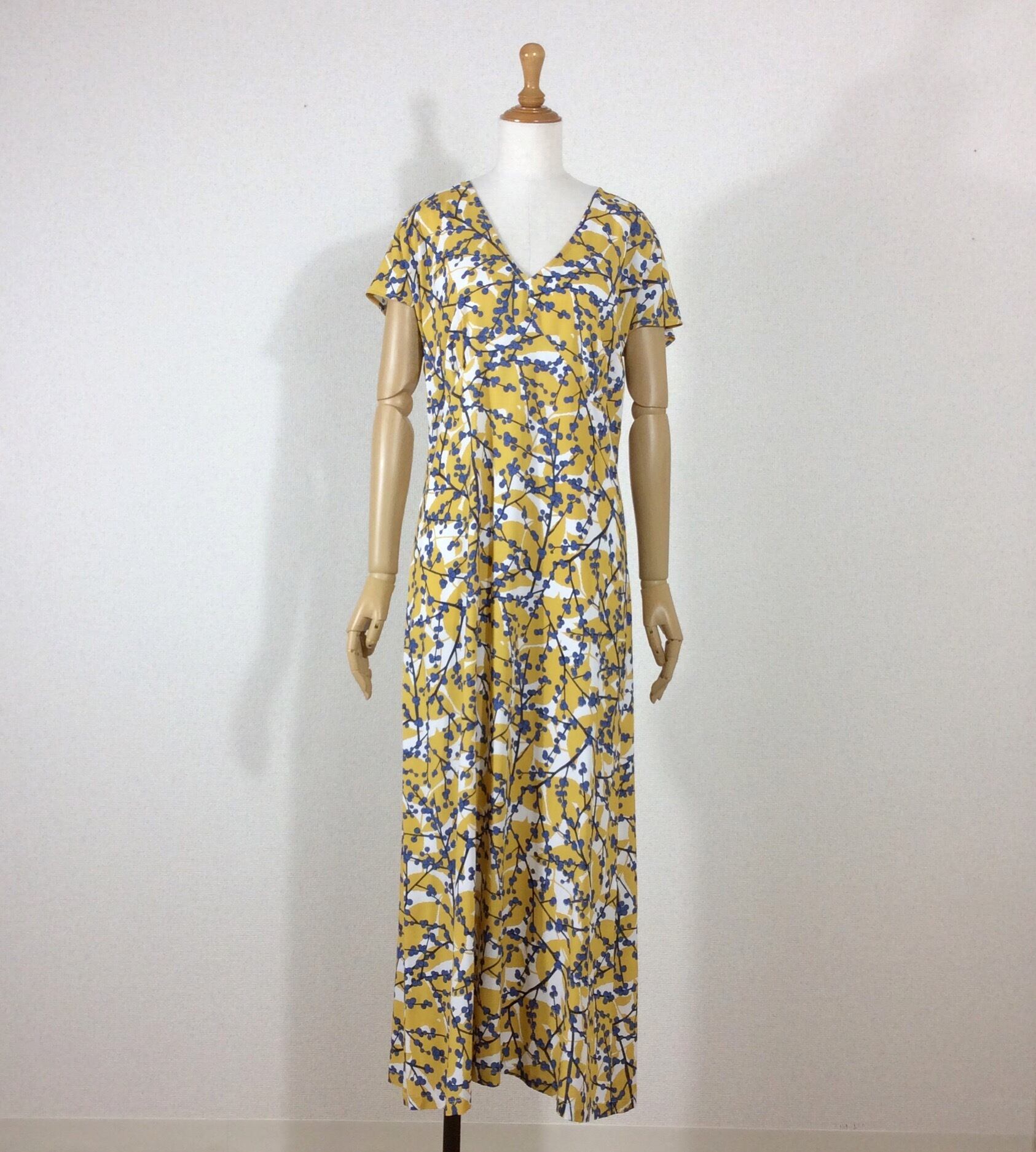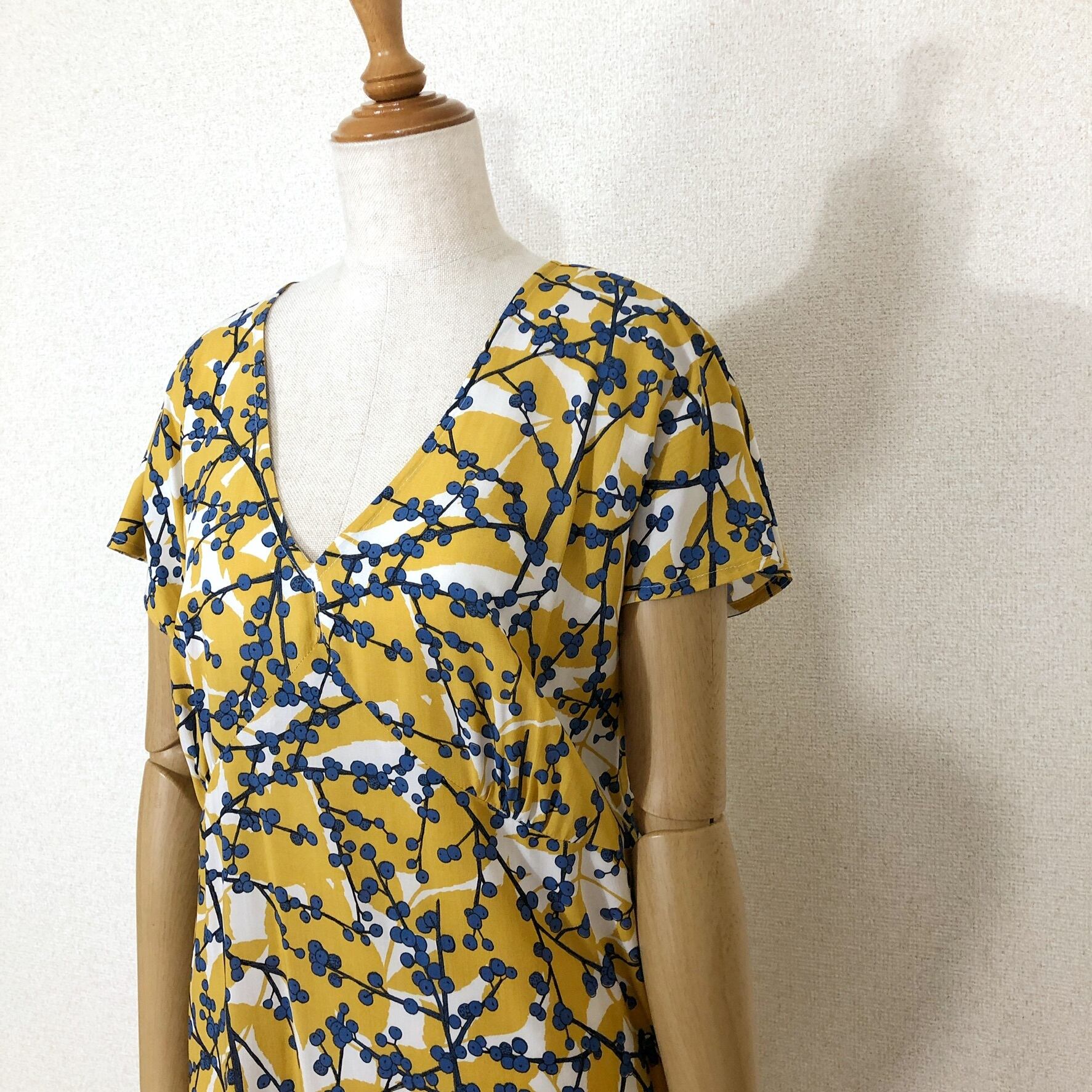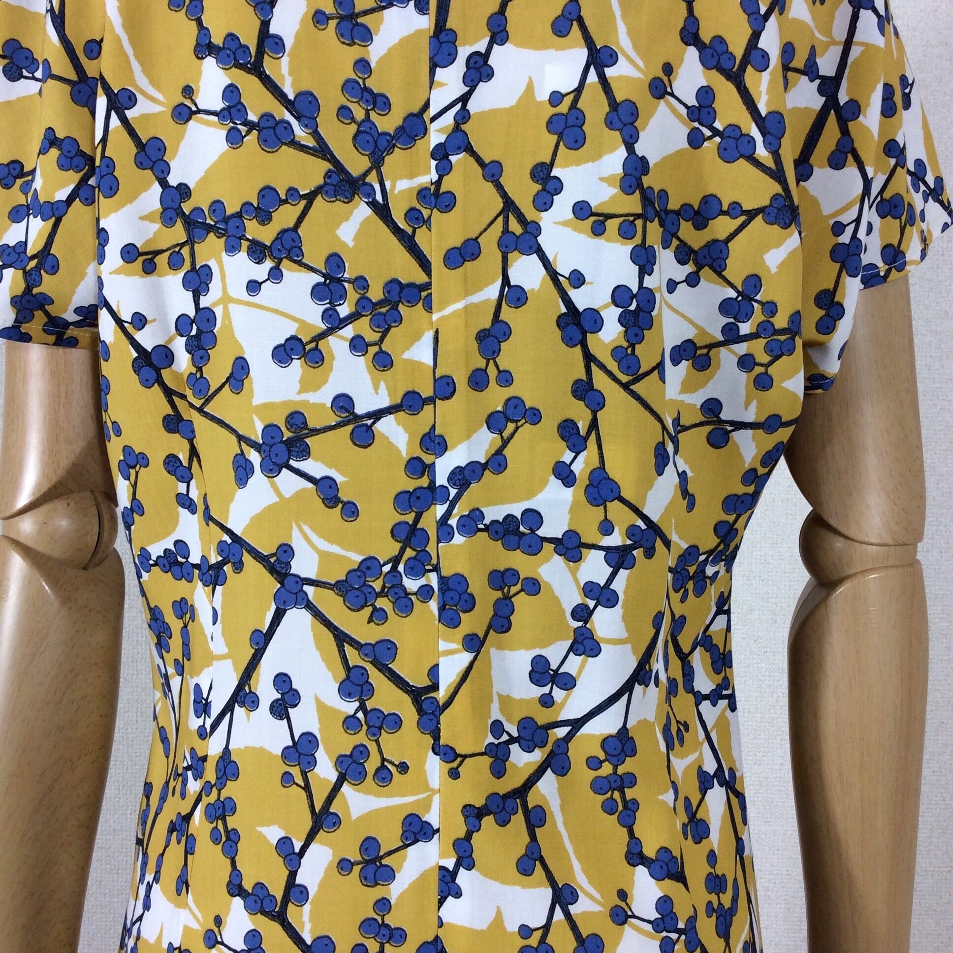 <Colour> 黄色xブルーx白がメインのプリントで、イエローがマスタードに近く、ブルーも少しくすんだトーン。日本人の肌になじみやすいお色です。