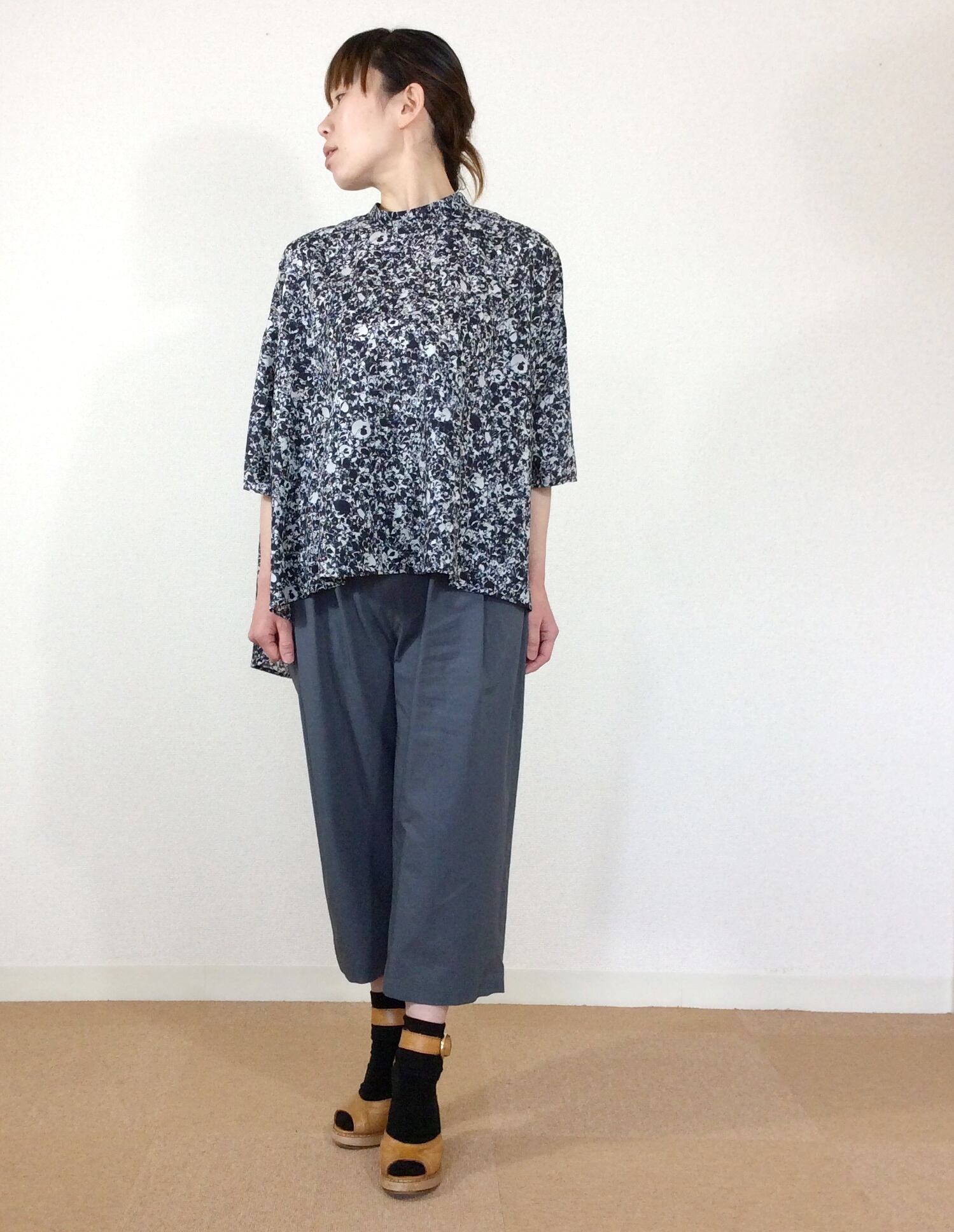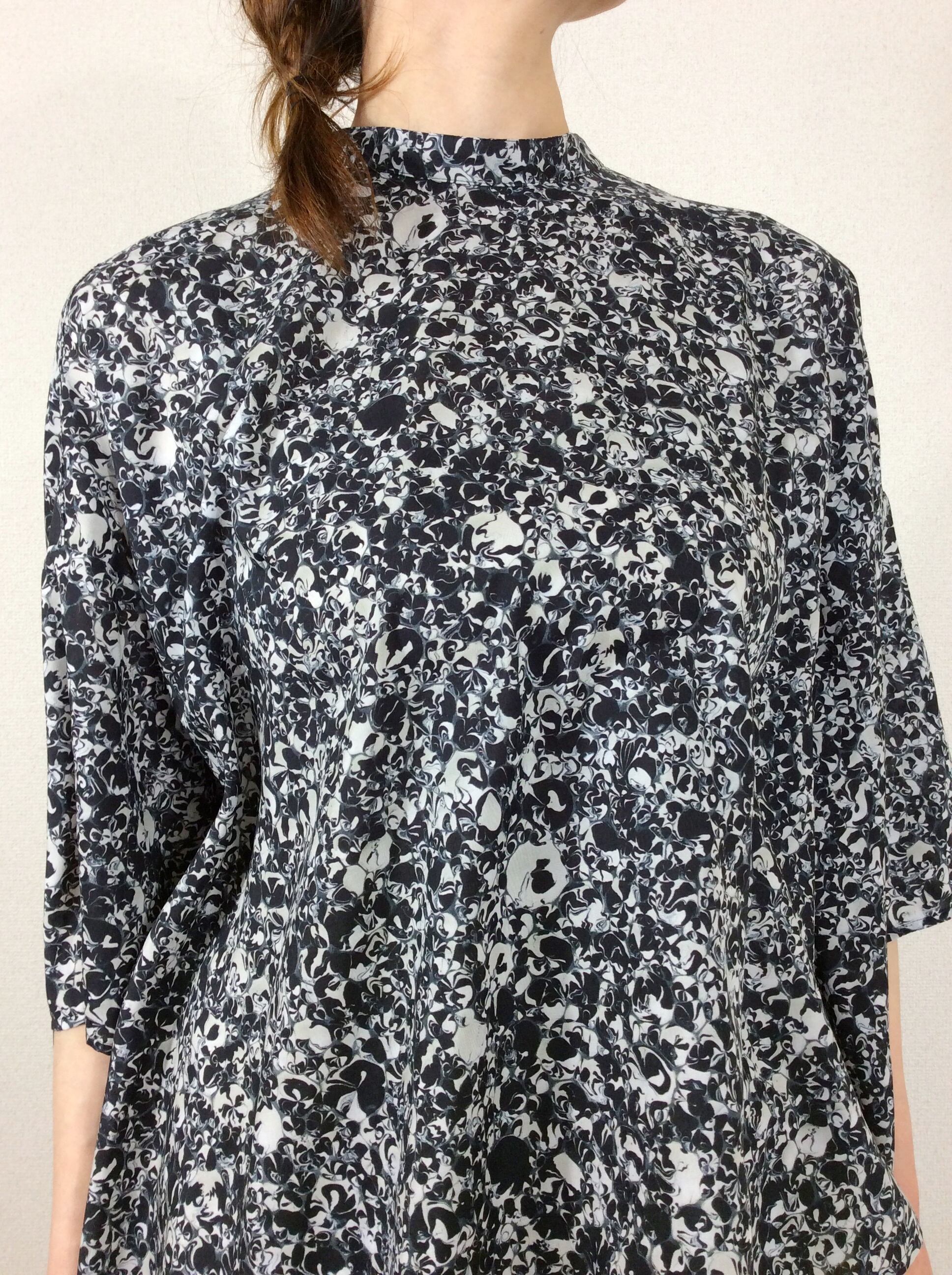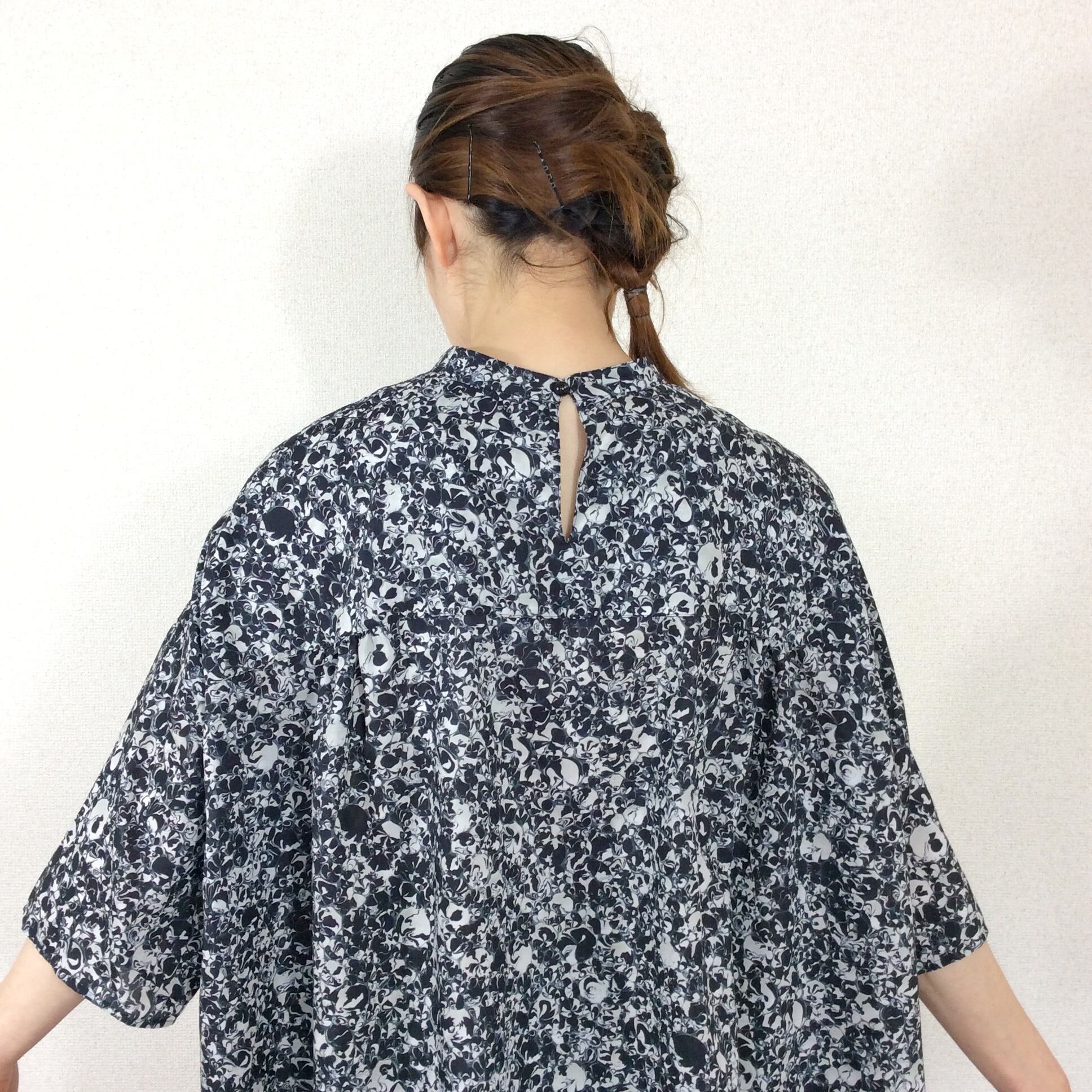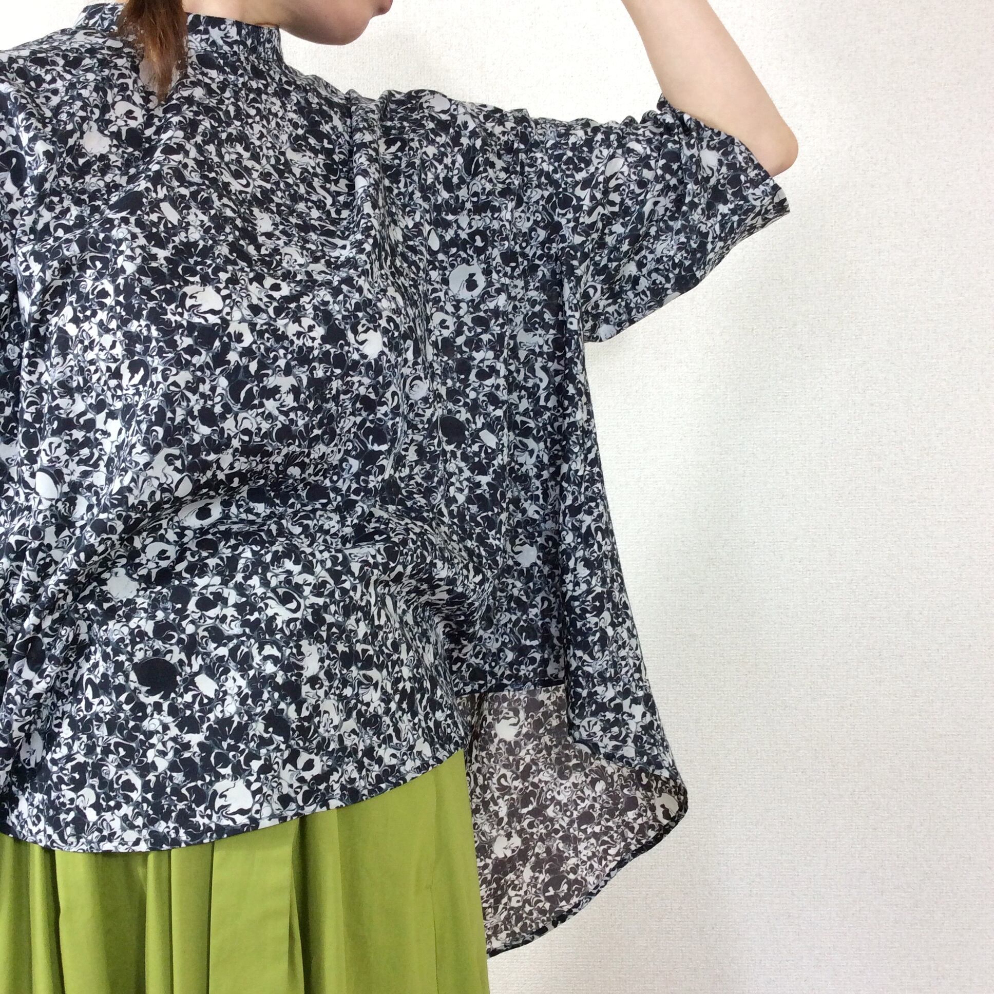 <Design Detail> 背中の両サイドに施されたギャザーで、ブラウスなのにケープを着ているような被りタイプのブラウス。 首元は少しハイネックに。