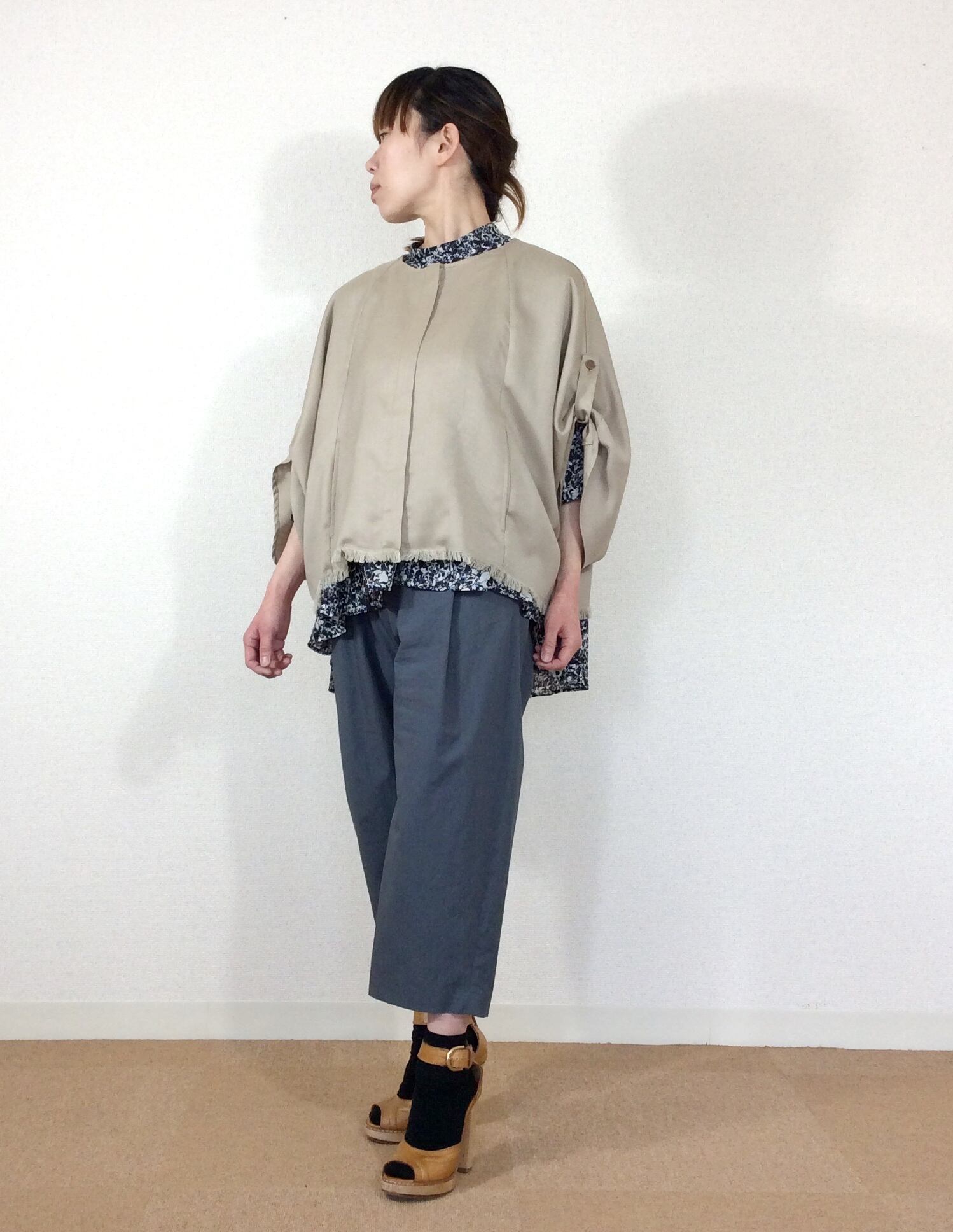 一見した形や色使いは、とても日本人的な雰囲気を感じるのですが、実際に着ると思いのほか華奢に見せるテクニックに、パリの空気も感じます。